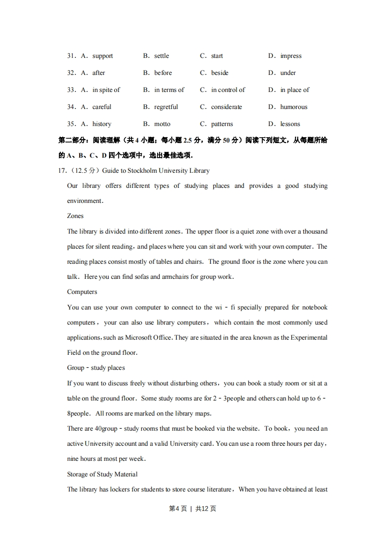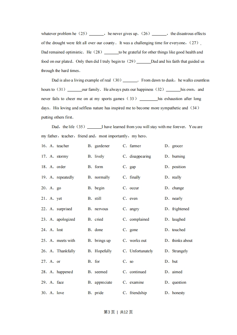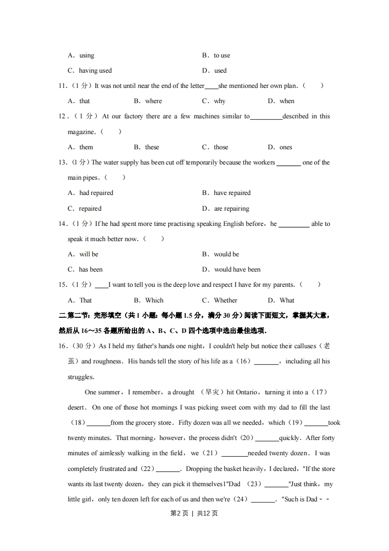 2013年天津市高考英语试卷第一节:单项填空(共15小题,每小题1分,满分15分)从A、B、C、D四个选项中,选出可以填入空白处的最佳选项,1.()-I'm going to Venice next week.-Carnival will be held then.Have fun!(A.You're crazyB.You're luckyC.You'd better notD.You never know2.(If you are in trouble,Mike is always willing toa hand.(A.lendB.shakeC.waveD.want3.(1)I think watching TV every evening is a waste of time--there aremeaningful thingsto do.(A.lessB.moreC.the leastD.the most4.(1)-Mary's been offered a job in a university,but she doesn't want to take it.-It's a very good chance.(A.Guess whatB.So whatC.Who caresD.How why5.(1分)small,the company has about 1,000 buyers in over 30countries.()A.AsB.IfC.AlthoughD.Once6.(1)We have launched another man made satellite,is announced in today'snewspaper.()A.thatB.whichC.whoD.what7.(While she was in Paris,she developed afor fine art.(A.wayB.relationC.tasteD.habit8.(I had hoped to take a holiday this year but I wasn't able to()A.get awayB.drop inC.check outD.hold on9.(1分)No one.be more generous,he has a heart of gold.(A.couldB.mustC.dareD.need10.(1)In some languages,100 words make up half of all words_in dailyconversations.()第1页|共12页A.usingB.to useC.having usedD.used11.(1)It was not until near the end of the lettershe mentioned her own plan.(A.thatB.whereC.whyD.when12.(1)At our factory there are a few machines similar todescribed in thismagazine.(A.themB.theseC.thoseD.ones13.(1)The water supply has been cut off temporarily because the workersone of themain pipes.(A.had repairedB.have repairedC.repairedD.are repairing14.(1)If he had spent more time practising speaking English before,heable tospeak it much better now.(A.will beB.would beC.has beenD.would have been15.(1)I want to tell you is the deep love and respect I have for my parents.A.ThatB.WhichC.WhetherD.What二第二节:完形填空(共1小题:每小题1.5分,满分30分)阅读下面短文,掌握其大意,然后从16~35各题所给出的A、B、C、D四个选项中选出最佳选项,16.(30)As I held my father's hands one night,I couldn't help but notice their callusesand roughness.His hands tell the story of his life as a (16)including all hisstruggles.One summer,I remember,a drought (hit Ontario,turning it into a (17)desert.On one of those hot momings I was picking sweet com with my dad to fill the last(18)from the grocery store.Fifty dozen was all we needed,which (19)tooktwenty minutes.That morning,however,the process didn't (20)quickly.After fortyminutes of aimlessly walking in the field,we (21)needed twenty dozen.I wascompletely frustrated and (22).Dropping the basket heavily,I declared,"If the storewants its last twenty dozen,they can pick it themselves1"Dad (23)"Just think,mylittle girl,only ten dozen left for each of us and then we're (24)"Such is Dad -第2页|共12页whatever problem he (25),he never gives up.(26),the disastrous effectsof the drought were felt all over our county.It was a challenging time for everyone,(27).Dad remained optimistic.He (28)to be grateful for other things like good health andfood on our plated.Only then did I truly begin to (29)Dad and his faith that guided usthrough the hard times.Dad is also