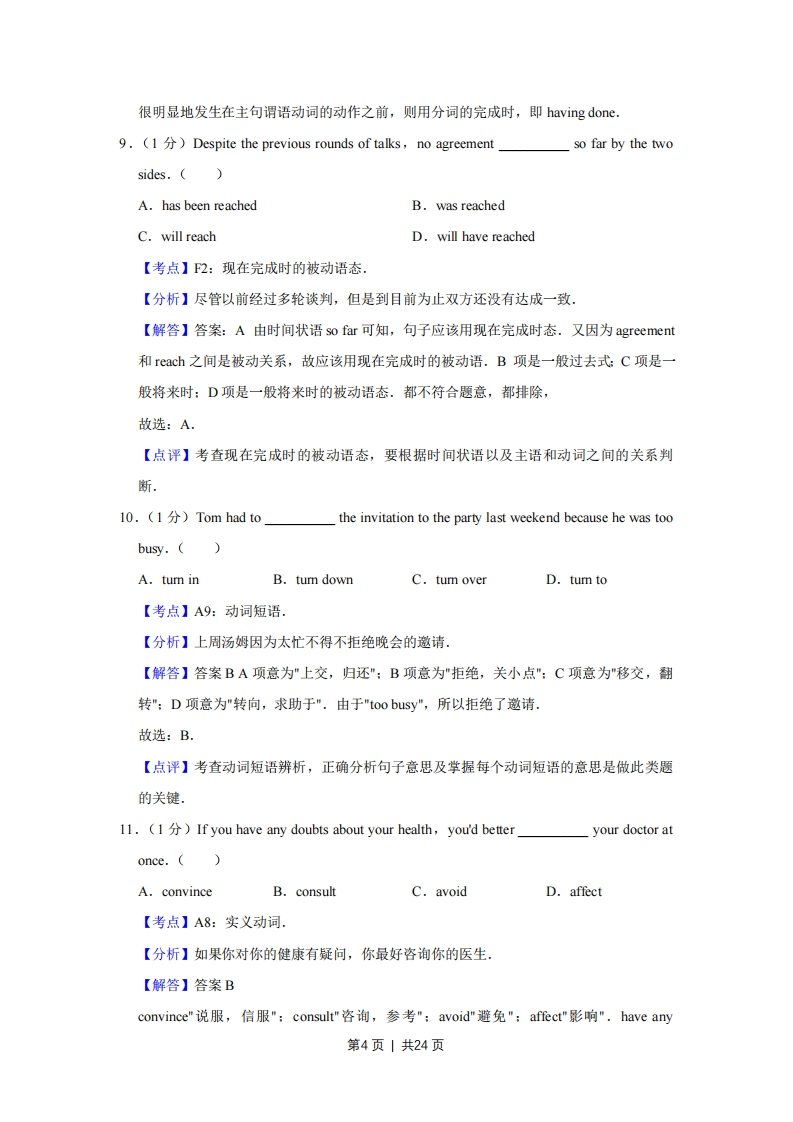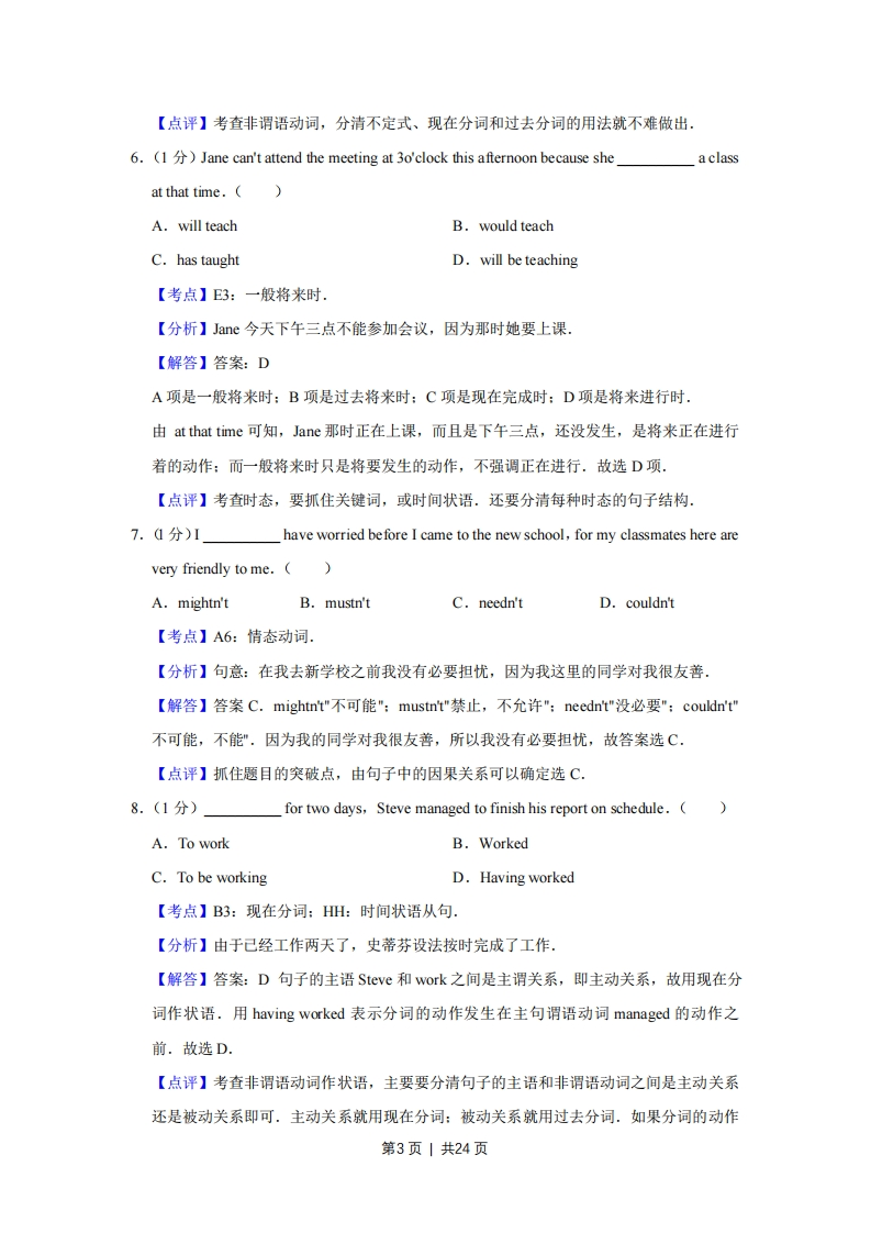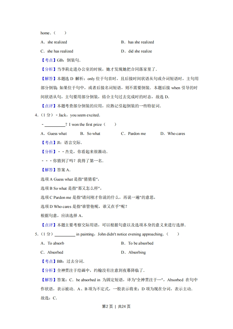 2015年天津市高考英语试卷解析版事考答案与试题佩折一、选择题(共15小题,每小题1分,满分15分)1.()Sorry,Liz.I think I was a bit rude to youbut don't do that again!()A.Go aheadB.Forget itC.It dependsD.With pleasure【考点】I:语言交际【分析】·--对不起,利兹.我想我刚才对你粗鲁了点.-··不必在意,不过下次别这样了【解答】答案B.选项A Go ahead的意思是:好吧,行啊:选项B Forget it的意思是:算了吧,不必在意:选项C It depends的意思是:那得看情况了:选项D With pleasure的意思是:乐意效劳.根据句意和选项的意思应该选择B,【点评】做这类题目,首先要正确理解四个选项的意思,然后分析各表达使用的场合,注意语境.2.(1)The quality of education in this small school is better thanin some largerschools.(A.thatB.oneC.itD.this【考点】55:指示代词.【分析】这所小学校的教育质量要比那些大学校的好。【解答】答案:A句中的代词要代替不可数名词the quality of education.that、it和one都相当于the+名词one和it都指代可数名词单数,故排除B、C两项:that指代不可数名词,代同名异物,符合题意.故选A【点评】考查指示代词,只要分清泛指和特指,代替可数还是不可数名词即可.3.(1)Only when Lily walked into the officethat she had left the contract at第1页1共24页home.A.she realizedB.has she realizedC.she has realizedD.did she realize【考点】GB:倒装句.【分析】当李莉走进办公室的时候,她才发现她把合同落家里了·【解答】本题选D解析:oly位于句首时,且后接时间状语从句或介词短语时,主句用部分倒装如果位于句中,或者后接名词短语,则不需要倒装.本题后接when引导的时间状语从句,主句要用部分倒装,结合主句过去完成时的时态,故选D,【点评】本题考查部分倒装的应用,应熟记引起倒装的一些特征词.4.(Jack,you seem excited.I won the first prizeA.Guess whatB.So whatC.Pardon meD.Who cares【考点】I:语言交际【分析】··杰克,你看起来很激动,-·-你猜到了吗?我得了第一名,【解答】答案A.选项A Guess what是指"猜猜看",选项B So what是指"那又怎么样",选项C Pardon me是指"请问刚才你说的什么,再说一遍"的意思,选项D Who cares是指"谁管他呢,谁又在乎"呢?根据句意,应该选择A.【点评】本题主要考察交际用语,可以根据句意以及选项本身的意义来进行选择,5.(1分)in painting,John didn't notice evening approaching.(A.To absorbB.To be absorbedC.AbsorbedD.Absorbing【考点】BB:过去分词.【分析】全神贯注于绘画中,约瀚没有注意到夜幕降临了.【解答】答案:C.be absorbed in为固定短语,译为"全神贯注于",Absorbed在句中作状语,表示被动.A、B项为不定式,一般表示将来:D项为现在分词,表示主动.故选:C.第2页|共24页【点评】考查非谓语动词,分清不定式、现在分词和过去分词的用法就不难做出.6.(1)Jane can't attend the meeting at 30'clock this afternoon because shea classat that time.A.will teachB.would teachC.has taughtD.will be teaching【考点】E3:一般将来时【分析】Jane今天下午三点不能参加会议,因为那时她要上课.【解答】答案:DA项是一般将来时:B项是过去将来时:C项是现在完成时:D项是将来进行时.由at that time可知,Jane那时正在上课,而且是下午三点,还没发生,是将来正在进行着的动作:而一般将来时只是将要发生的动作,不强调正在进行.故选D项。【点评】考查时态,要抓住关键词,或时间状语.还要分清每种时态的句子结构。7.(分)Ihave worried before I came to the new school,for my classmates here arevery friendly to me.(A.mightn'tB.mustn'tC.needn'tD.couldn't【考点】A6:情态动词.【分析】句意:在我去新学校之前我没有必要担忧,因为我这里的同学对我很友善【解答】答案C.mightn't"不可能":mustn't"禁止,不允许":needn't'"没必要":couldn't"不可能,不能".因为我的同学对我很友善,所以我没有必要担忧,故答案选C.【点评】抓住题目的突破点,由句子中的因果关系可以确定选C.8.(1分)for two days,Steve managed to finish his report on schedule.(A.To workB.WorkedC.To be workingD.Having worked【考点】B3:现在分词:HH:时间状语从句【分析】由于己经工作两天了,史蒂芬设法按时完成了工作.【解答】答案:D句子的主语Steve和work之间是主谓关系,即主动关系,故用现在分词作状语.用having worked表示分词的动作发生在主句谓语动词managed的动作之前.故选D.【点评】考查非谓语动词作状语,主要要分清句子的主语和非谓语动词之间是主动关系还是被动关系即可.主动关系就用现在分词:被动关系就用过去分词.如果分词的动作第3页1共24页