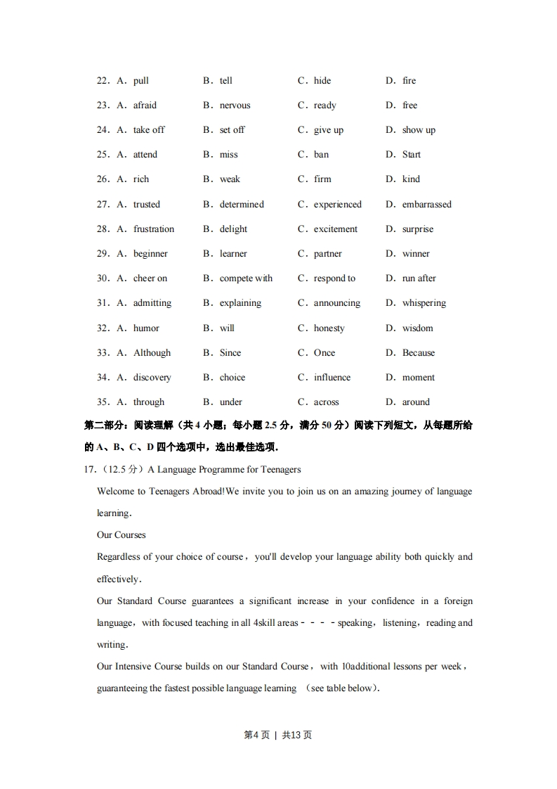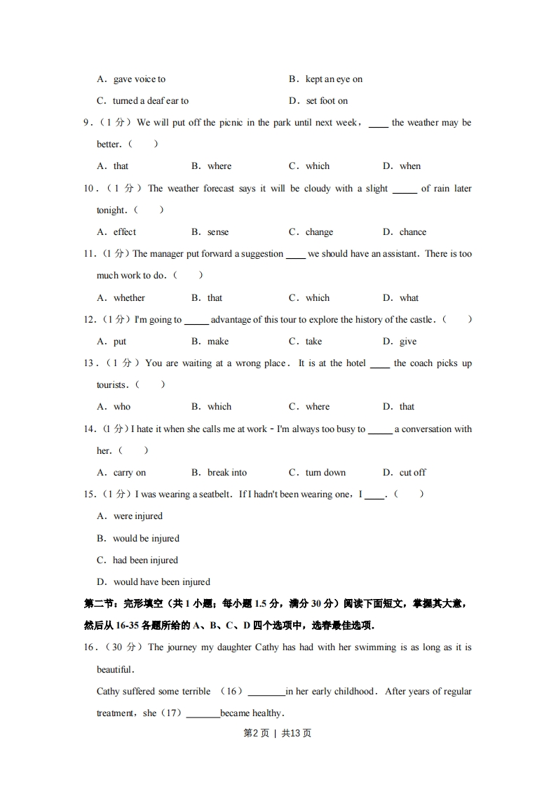 2016年天津市高考英语试卷第一部分:英话知识运用(共两节,满分15分)第一节:单项填空(共15小题;每小题1分,满分15分)从A、B、C、D四个选项中,选出可以填入空白处的最佳选项.1.(1)---It was a wonderful trip.So,which city did you like better,Paris or Rome?There were good things and bad things about them.(A.It's hard to sayB.I didn't get itC.You must be kiddingD.Couldn't be better2.(1)The dictionary is:many words have been added to the language since it waspublished.()A.out of controlB.out of dateC.out of sightD.out ofreach3.(1)When walking down the street,I came across David,who I for years.A.didn't seeB.haven't seenC.hadn't seenD.wouldn't see4.(1)The cooling wind swept through out bedroom windows,air conditioningunnecessary.(A.makingB.to makeC.madeD.being made5.(1)It was really annoyingget access to the data bank you hadrecommended.(A.wouldn'tB.couldn'tC.shouldn'tD.needn't6.(1)---I'm thinking of going back to school to get another degree.---Sounds great!.()A.It all dependsB.Go for itC.Never mindD.No wonder7.1)the average age of the population increases,there are more and more old peopleto care for.(A.UnlessB.UntilC.AsD.While8.(1)Mary was silent during the early part of the discussion but finally she her opinionon the subject.(第1页|共13页A.gave voice toB.kept an eye onC.tumed a deafear toD.set foot on9.(1)We will put off the picnic in the park until next week,the weather may bebetter.()A.thatB.whereC.whichD.when10.(1)The weather forecast says it will be cloudy with a slightof rain latertonight.()A.effectB.senseC.changeD.chance11.(1)The manager put forward a suggestionwe should have an assistant.There is toomuch work to do.(A.whetherB.thatC.whichD.what12.(1分)m going toadvantage of this tour to explore the history of the castle.(A.putB.makeC.takeD.give13.(1)You are waiting at a wrong place.It is at the hotel the coach picks uptourists.()A.whoB.whichC.whereD.that14.(1)I hate it when she calls me at work-I'm always too busy to a conversation withher.()A.carry onB.break intoC.tum downD.cut off15.(I was wearing aseatbelt.If I hadn't been wearing one,I.()A.were injuredB.would be injuredC.had been injuredD.would have been injured第二节:完形填空(共1小题;每小题15分,满分30分)阅读下面短文,掌握其大意,然后从1635各题所给的A、B、C、D四个选项中,选春最佳选项.16.(30)The journey my daughter Cathy has had with her swimming is as long as it isbeautiful.Cathy suffered some terrible (16)in her early childhood.After years of regulartreatment,she (17)_became healthy.第2页|共13页Two years ago,while Cathy was watching the Olympics,a dream came into her sweet littlehead to be a swimmer.Last summer,she wanted to (18)our local swimteam.She practiced hard and finally (19)it.The team practice,(20)wasa rough start.She coughed and choked and could hardly (21her first fewweeks.Hearing her coughing bitterly one night,I decided to (22)her from itall.But Cathy woke me up early next moming,wearing her swimsuit 3)to go!l toldher she shouldn't swim after a whole night's coughing,but she refused to (24)andinsisted she go.From that day on,Cathy kept swimming and didn't (25)a single practice.She hada(26)intention within herself