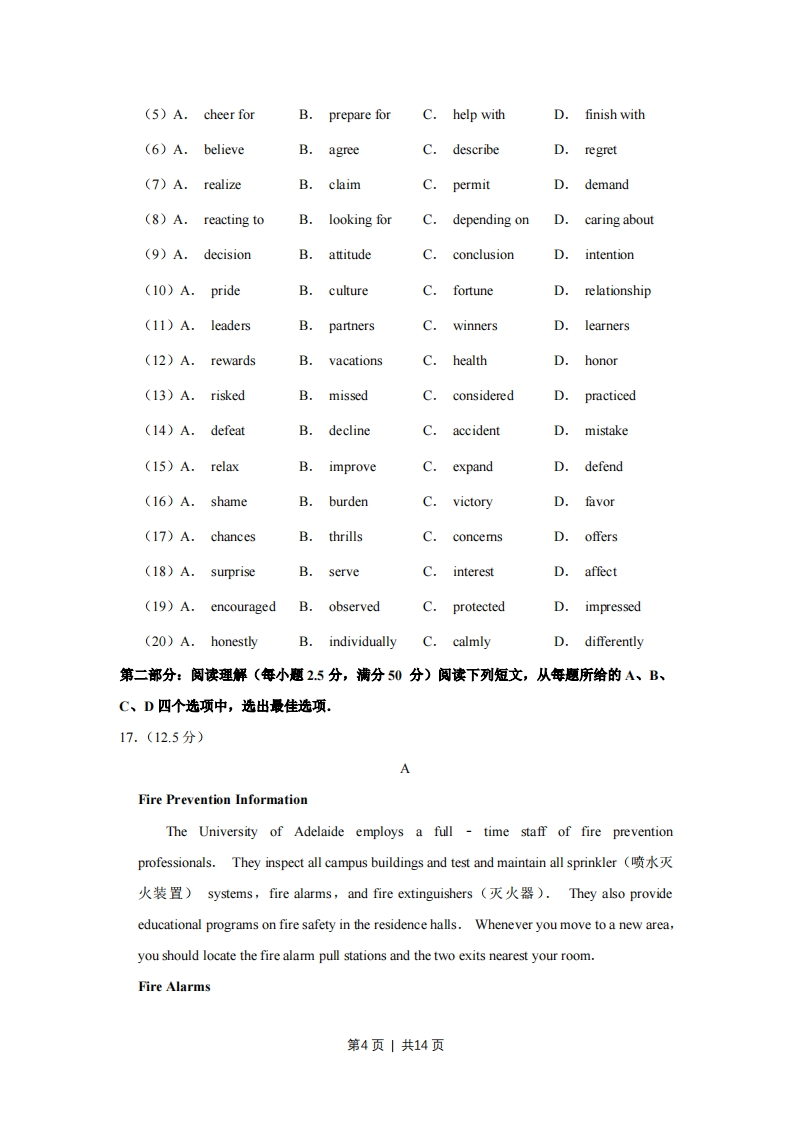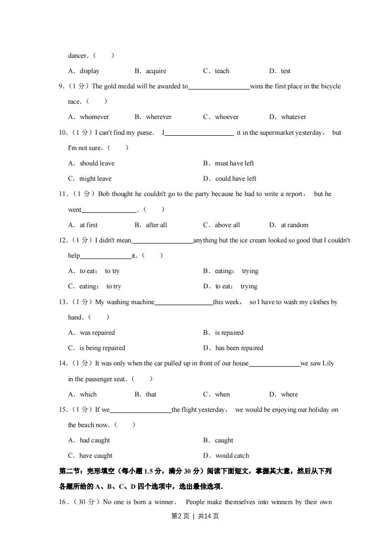 2018年天津市高考英语试卷第一部分:英话知识运用(共两节)第一节:单项填空(共15小题;每小题1分,满分15分)从A、B、C、D四个选项中,选出可以填入空白处的最佳选项,例:Stand overthereyou'Ⅱbe able to see it better..A.orB.andC.butD.while答案是B.1.(1)-Wasn't Joan supposed to be here by now?She will be here in about twenty minutes.(A.All rightB.Don't worryC.No wonderD.Enjoy yourself2.(1分)Kate,sister I shared a room with when we were at college,hasgone to work in Australia.(A.whomB.thatC.whoseD.her3.(1)At first Robert wouldn't let his daughter go diving,but eventually heasshe was so confident about her skills.(A.gave inB.dressed upC.broke inD.tumed up4.(1)Let's not pick these peaches until this weekend_they get sweet enoughto be eaten.(A.ever sinceB.as ifC.even thoughD.so that5.(1)-I'm moving in a few days and I wonder if you could help.Just let me know when,and I'll be there.(A.You betB.It dependsC.Forget itD.No kidding6.(1分)Thethat there is life on other planets in the universe has always inspiredscientists to explore the outer space.(A.adviceB.orderC.possibilityD.invitation7.(1)I need a new passport so I will have to have my photograph.A.takingB.takenC.being takenD.take8.(1)It took him a long time to.the skills he needed to become a good第1页1共14页dancer.A.displayB.acquireC.teachD.test9.(1)The gold medal will be awarded to.wins the first place in the bicyclerace.(A.whomeverB.whereverC.whoeverD.whatever10.(I can't find my purse.it in the supermarket yesterday,butI'm not sure.()A.should leaveB.must have leftC.might leaveD.could have left11.(1)Bob thought he couldn't go to the party because he had to write a report,but hewent.()A.at firstB.after allC.above allD.at random12.(1分)I didn't mean.anything but the ice cream looked so good that I couldn'thelp_it.A.to eat:to tryB.eating:tryingC.eating:to tryD.to eat:trying13.(1)My washing machine.this week,so I have to wash my clothes byhand.()A.was repairedB.is repairedC.is being repairedD.has been repaired14.(1)It was only when the car pulled up in front of our housewe saw Lilyin the passenger seat.(A.whichB.thatC.whenD.where15.(1分)fwethe flight yesterday,we would be enjoying our holiday onthe beach now.(A.had caughtB.caughtC.have caughtD.would catch第二节:完形填空(年小题1.5分,满分30分)阅读下面短文,掌握其大意,然后从下列各题所给的A、B、C、D四个选项中,选出最佳选项.。16.(30)No one is bom a winner.People make themselves into winners by their own第2页|共14页(1)I learned this lesson from a (n)(2)many years ago.I took the head (3)jobat a school in Baxley,Georgia.It was a small school with a weak football program.It was a tradition for the school's old team to play against the (4)team at the endof spring practice.The old team had no coach,and they didn't even practice to 6)thegame.Being the coach of the new team,I was excited because I knew we were going towin,but to my disappointment we were defeated.I couldn't (6)I had got into sucha situation.Thinking hard about it,I came to (7)that my team might not be thenumber one team in Georgia,but they were (8)me.I had to change my (9)about their ability and potential.I started doing anything I could to help th