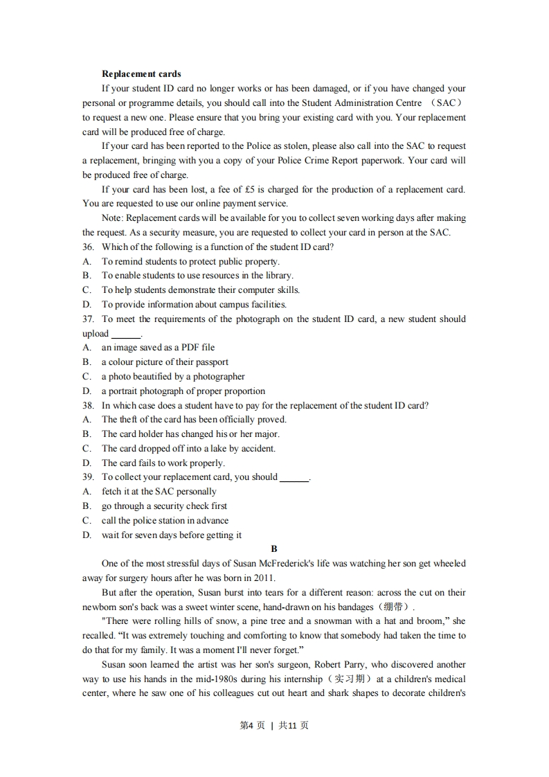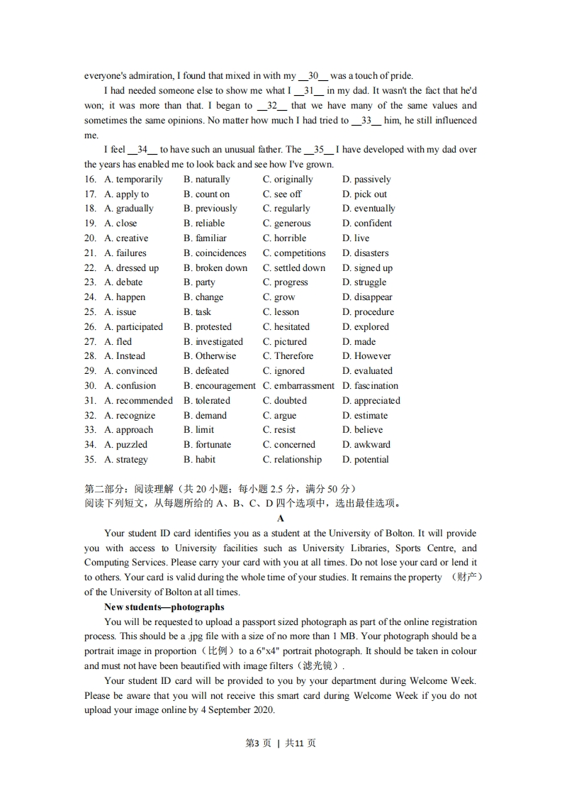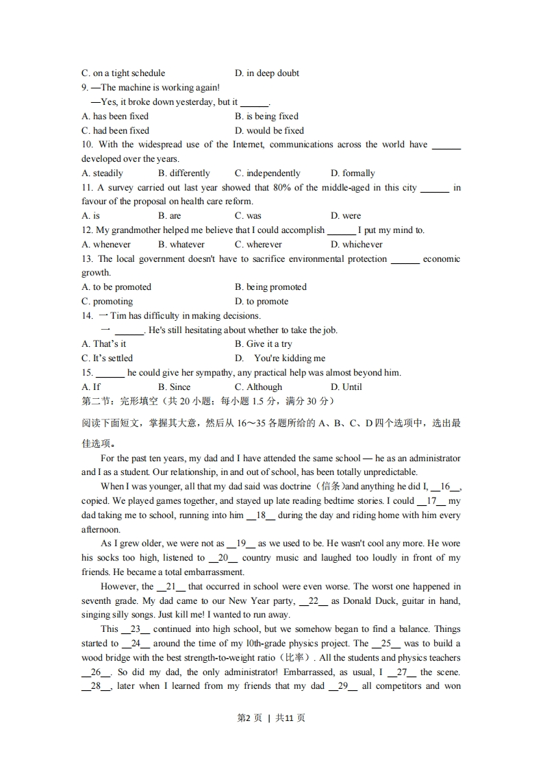 绝密★启用前2020年普通高等学校招生全国统一考试(天津卷)英语笔试(第一次)本试卷分为第I卷(选择题)和第Ⅱ卷(非选择题)两部分,共130分,考试用时100分钟。第1卷1至10页,第Ⅱ卷11至12页。答卷前,考生务必将自己的姓名、考生号填写在答题卡上,并在规定位置粘贴考试用条形码。答卷时,考生务必将答案涂写在答题卡上,答在试卷上的无效。考试结束后,将本试卷和答题卡一并交回。祝各位考生考试顺利!第I卷注意事项:1.每小题选出答案后,用铅笔将答题卡上对应题目的答案标号涂黑。如需改动,用橡皮擦干净后,再选涂其他答案标号。2.本卷共55小题,共95分。第一部分:英语知识运用(共两节,满分45分)第一节:单项填空(共15小题:每小题1分,满分15分)从A、B、C、D四个选项中,选出可以填入空白处的最佳选项。例如:Stand over there__you'll be able to see it better.A.orB.andC.butD.while答案是B.1.-You seem to be in a really good mood.-I finished my last test today.!Now I'm free.A.What a pityB.What a reliefC.I've got itD.I've missed the point2.His vivid descriptions of country life quickly became popular,which established hisasone of America's greatest writers.A.trustB.contactC.reputation D.theory3.Youhave scolded him for his poor performance.After all,he had done his best.A.mustB.shouldC.mustn'tD.shouldn't4.The company is willing tothe new technology if it can be shown to reduce productioncosts.A.look overB.bring inC.put asideD.knock out5.in 1931,the Empire State Building,the highest skyscraper until 1954,inspired theimagination of the world.A.Having completedB.Being completedC.CompletedD.Completing6.Modem women are energetic,ambitious,and most of all,persistenttheir goals.A.in pursuit ofB.in retum forC.in touch withD.in contrast to7.Mr.Smith owned this oil painting until the early 1990s,he gave it to his grandson.A.whichB.whenC.whereD.who8.Don't be late for the 9:00 meeting because I amI have to catch the 11:00 train.A.on a limited budgetB.in high spints第1页|共11页C.on a tight scheduleD.in deep doubt9.-The machine is working again!-Yes,it broke down yesterday,but itA.has been fixedB.is being fixedC.had been fixedD.would be fixed10.With the widespread use of the Intemet,communications across the world havedeveloped over the years.A.steadilyB.differently C.independentlyD.formally11.A survey carried out last year showed that 80%of the middle-aged in this cityinfavour of the proposal on health care reform.A.isB.areC.wasD.were12.My grandmother helped me believe that I could accomplishI put my mind to.A.wheneverB.whateverC.whereverD.whichever13.The local government doesn't have to sacrifice environmental protectioneconomicgrowth.A.to be promotedB.being promotedC.promotingD.to promote14.-Tim has difficulty in making decisions.He's still hesitating about whether to take the job.A.That's itB.Give it a tryC.It's settledD.You're kidding me15.he could give her sympathy,any practical help was almost beyond him.A.IfB.SinceC.AlthoughD.Until第二节:完形填空(共20小题:每小题1.5分,满分30分)阅读下面短文,掌握其大意,然后从16~35各题所给的A、B、C、D四个选项中,选出最佳选项。For the past ten years,my dad and I have attended the same school-he as an administratorand I as a student.Our relationship,in and out of school,has been totally unpredictable.When I was younger,all that my dad said was doctrine )and anything he did I,16copied.We played games together,and stayed up late reading bedtime stories.I could17mydad taking me to school,running into him18during the day and riding home with him e