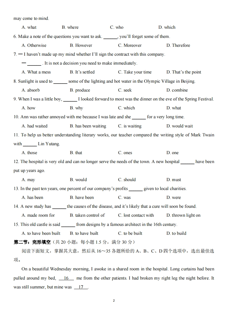 绝密★启用前2022年普通高等学校招生全国统一考试(天津卷)英语笔试(第一次)本试卷分为第卷(选择题)和第卷(非选择题)两部分,共130分,考试用时100分钟。第1卷1至11页,第Ⅱ卷12至13页。答卷前,考生务必将自己的姓名、考生号填写在答题卡上,并在规定位置粘贴考试用条形码。答卷时,考生务必将答案涂写在答题卡上,答在试卷上的无效。考试结束后,将本试卷和答题卡一并交回。祝各位考生考试顺利!第卷注意事项:1.每小题选出答案后,用铅笔将答题卡上对应题目的答案标号涂黑。如需改动,用橡皮擦干净后,再选涂其他答案标号。2.本卷共55小题,共95分。第一部分:英语知识运用(共两节,满分45分)第一节:单项填空(共15小题:每小题1分,满分15分)从A、B、C、D四个选项中,选出可以填入空白处的最佳选项。例:Stand over thereyou'll be able to see it better.A.orB.andC.butD.while答案是B。1.You've locked the keys in the car?-I have a spare set there.A.Good for youB.I'd better notC.It doesn't matterD.That all depends2.Hemingway wrote novels and short stories on his personal experiences of the First World War.A.BasedB.to baseC.basingD.being based3.we achieve great success in our work,we should not be too proud.A.Ever sinceB.Even ifC.In caseD.As though4.The dancing club in our community welcomes all new members,age or gender.A.by means ofB.instead ofC.on account ofD.regardless of5.When people think about operating systems were developed for the personal computer,Microsoftmay come to mind.A.whatB.whereC.whoD.which6.Make a note of the questions you want to ask.you'll forget some of themA.OtherwiseB.HoweverC.MoreoverD.Therefore7.-I haven't made up my mind whether I'll sign the contract with this company.It is not a decision you need to make immediatelyA.What a messB.It's settledC.Take your timeD.That's the point8.Sunlight is used tosome of the lighting and hot water in the Olympic Village in Beijing.A.absorbB.produceC.seekD.combine9.When I was a little boy,I looked forward to most was the dinner on the eve of the Spring Festival.A.howB.whyC.whichD.what10.Ann was rather annoyed with me because I was late and shefor a very long time.A.had waitedB.has been waitingC.is waitingD.would wait11.To help us better understanding literary works,our teacher compared the writing style of Mark TwainwithLin Yutang.A.thoseB.thatC.onesD.one12.The hospital is very old and can no longer serve the needs of the town.A new hospitalhave beenput up years ago.A.mayB.wouldC.shouldD.must13.In the past ten years,one percent of our company's profitsgiven to local charities.A.has beenB.have beenC.wasD.were14.A new study hasthe causes of the disease,and it's likely that a cure will soon be found.A.made room forB.taken control ofC.lost contact withD.thrown light on15.This old castle is saidfrom designs by a famous architect in the 16th centuryA.to have been builtB.to have builtC.to be builtD.to build第二节:完形填空(共20小题:每小题1.5分,满分30分)阅读下面短文,掌握其大意,然后从16~35各题所给的A、B、C、D四个选项中,选出最佳选项。On a beautiful Wednesday morning,I awoke in a shared room in the hospital.Long curtains had beenpulled around my bed,16me from the other patients.I had broken my right leg the night before.Itwas still summer,but mine was 17On the other side of my bed curtain,I heard a patient cheerfully 18 every nurse as they entered theroom,as if welcoming each into his home.He called them by name and asked 19 about their families.I never heard this man whisper a word about his own 20That night I