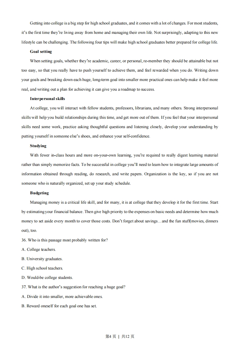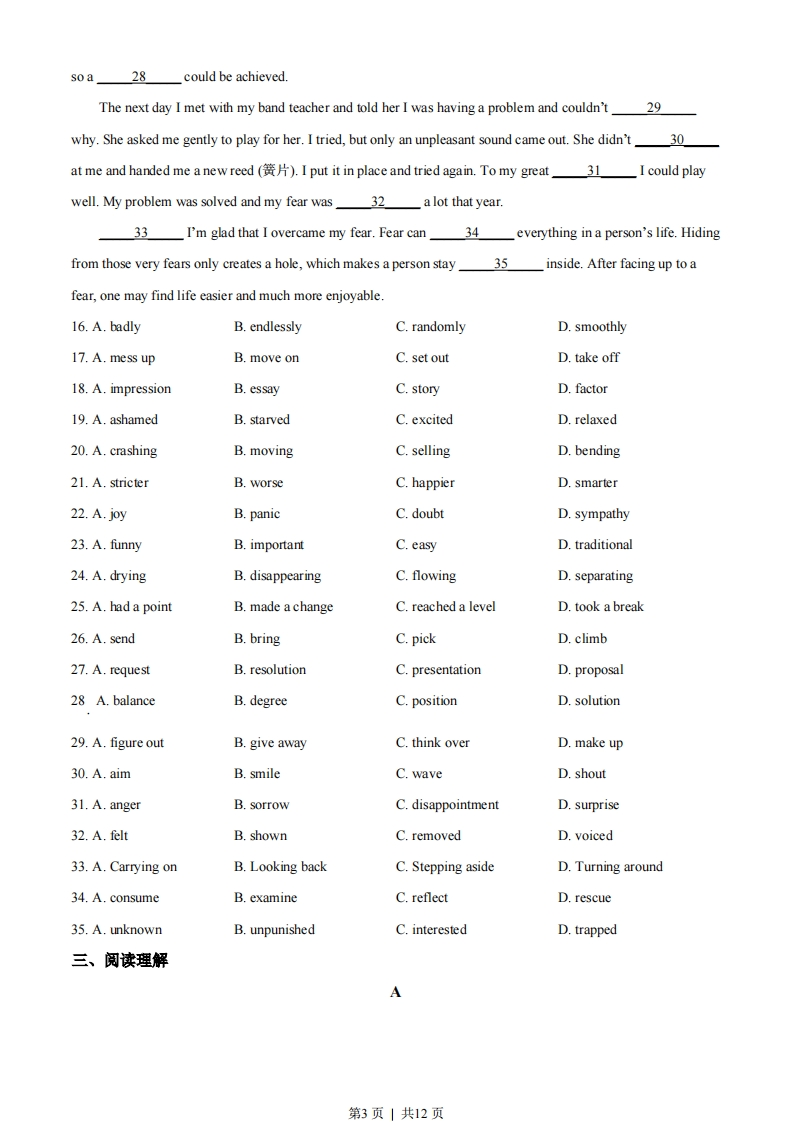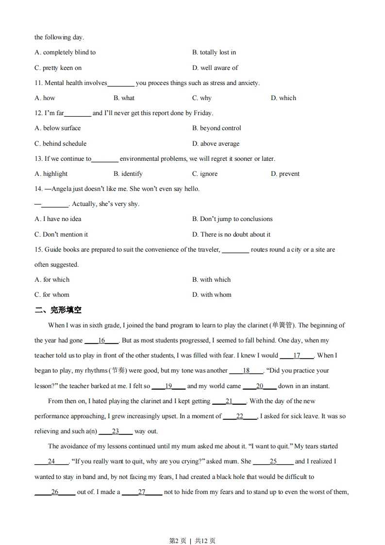 2022天津高考真题第二次英语一、单项选择1.-I worked on your car the whole night.How is it running?一It is running great!You were such a big help!A.It's apityB.I couldn't agree moreC.Forget itD.I can hardly thank you enough2.Food and medical suppliesto all the residents after the hurricane last Sunday.A.distributeB.distributedC.are distributedD.were distributed3.we achieve great success in our work,we should not be too proud.A.Ever sinceB.Even ifC.In caseD.As though4.gardening may be hard physical work,those who love it find it very relaxing mentally.A.AlthoughB.OnceC.SinceD.Unless5.Critical reasoning,together with problem-solving,teenagers to make better decisions.A.prepareB.preparesC.is preparingD.are preparing6.his restless students occupied with an indoor sport on rainy days,James Naismith created basketball.A.To be keptB.KeptC.To keepD.Keeping7.The children failed to hide their disappointment when they found out the schoolthe party.A.cancelsB.will cancelC.has cancelledD.had cancelled8.When people are depressed,some experience a loss ofwhile others can't stop eating.A.appetiteB.powerC.memoryD.sight9.The city temperatures have retumed from record low to nommalthe citizens to enjoy the outdoorsagainA.allowingB.being allowedC having allowedD.having been allowed10.The experienced climber wasthe potential danger in such extreme weather and decided to wait until第1页」共12页the following day.A.completely blind toB.totally lost inC.pretty keen onD.well aware of11.Mental health involvesyou procees things such as stress and anxiety.A.howB.whatC.whyD.which12.I'm farand I'll never get this report done by Friday.A.below surfaceB.beyond controlC.behind scheduleD.above average13.If we continue toenvironmental problems,we will regret it sooner or later.A.highlightB.identifyC.ignoreD.prevent14.-Angela just doesn't like me.She won't even say hello.Actually,she's very shy.A.I have no ideaB.Don't jump to conclusionsC.Don't mention itD.There is no doubt about it15.Guide books are prepared to suit the convenience of the traveler,routes round a city or a site areoften suggested.A.for whichB.with whichC.for whomD.with whom二、完形填空When I was in sixth grade,I joined the band program to learn to play the clarinet ()The beginning ofthe year had gone 16.But as most students progressed,I seemed to fall behind.One day,when myteacher told us to play in front of the other students,I was filled with fear.I knew I would 17.When Ibegan to play,my rhythms (were good,but my tone was another 18."Did you practice yourlesson?"the teacher barked at me.I felt so 19 and my world came 20 down in an instant.From then on,I hated playing the clarinet and I kept getting21.With the day of the newperformance approaching,I grew increasingly upset.In a moment of22,I asked for sick leave.It was sorelieving and such a(n)23 way out.The avoidance of my lessons continued until my mum asked me about it."I want to quit."My tears started24 "If you really want to quit,why are you crying?"asked mum.She 25 and I realized Iwanted to