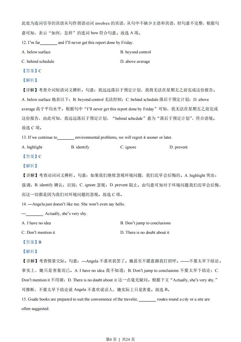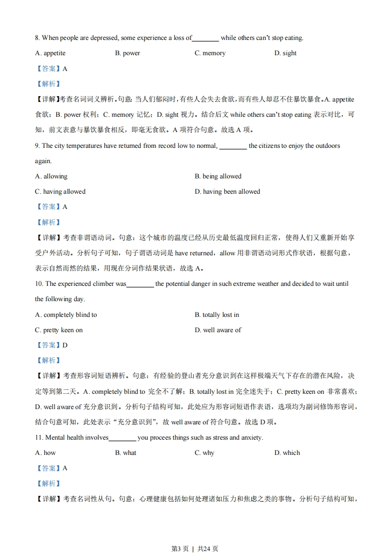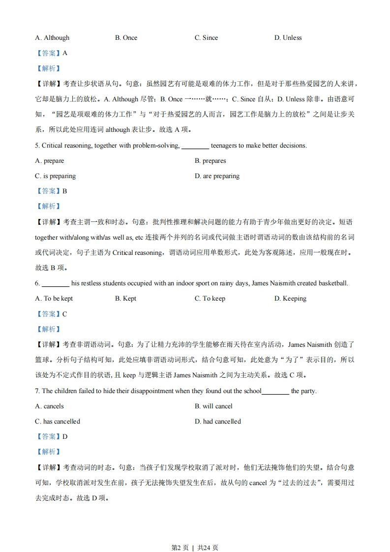 2022天津高考真题第二次英语一、单项选择1.-I worked on your car the whole night.How is it running?一It is running great!_You were such a big help!A.It's apityB.I couldn't agree moreC.Forget itD.I can hardly thank you enough【答案】D【解析】【详解】考查情景交际。句意:一一我整晚都在你的车上工作。它是如何运行的?一一运行良好!太感谢您了。你真是帮了个大忙!A.t's a pity太可惜啦:B.I couldn't agree more我非常同意:C.Forget it算了吧,休想:D.I can hardly thank you enough太感谢您了。根据It is running great!可知,此处向对方表示感谢,I can hardly thank you enough.意为“太感谢您了”,符合语境。故选D项。2.Food and medical supplies_to all the residents after the hurricane last Sunday.A.distributeB.distributedC.are distributedD.were distributed【答案】D【解析】【详解】考查动词的时态和语态。句意:上周日飓风过后,食品和药品供给被分发给了所有居民。分析句子成分可知,Food and medical supplies作主语,为复数,与动词distribute“分发”为动宾关系,故需要用被动语态be distributed:根据后文last Sunday“上周日”可知,句子需要用一般过去时态,故be动词要用were。故选D项.3we achieve great success in our work,we should not be too proud.A.Ever sinceB.Even ifC.In caseD.As though【答案】B【解析】【详解】考查状语从句。句意即使在工作中取得巨大成功,我们也不应该骄傲。A.Ever since自从B.Evenif即使,尽管:C.in case以免:D.As though好像。分析句子结构可知,此处为连词引导状语从句,结合句意可知,两个句子之间为让步关系,even if意为“即使,尽管”符合语境。故选B项。gardening may be hard physical work,those who love it find it very relaxing mentally第1页」共24页A.AlthoughB.OnceC.SinceD.Unless【答案】A【解析】【详解】考查让步状语从句。句意:虽然园艺有可能是艰难的体力工作,但是对于那些热爱园艺的人来讲,它却是脑力上的放松。A.Although尽管:B.Once一…就…:C.Since自从:D.Unless除非。由语意可知,“园艺是项艰难的体力工作”与“对于热爱园艺的人而言,园艺工作是脑力上的放松”之间是让步关系,所以此处应用连词although表让步。故选A项。5.Critical reasoning,together with problem-solving,teenagers to make better decisions.A.prepareB.preparesC.is preparingD.are preparing【答案】B【解析】【详解】考查主谓一致和时态。句意:批判性推理和解决问题的能力有助于青少年做出更好的决定。短语together with/along with/as well as,.etc连接两个并列的名词或代词做主语时谓语动词的数由该结构前的名词或代词决定,句子主语为Critical reasoning,谓语动词应用单数形式,此处为客观陈述,应用一般现在时。故选B项。6.his restless students occupied with an indoor sport on rainy days,James Naismith created basketball.A.To be keptB.KeptC.To keepD.Keeping【答案】C【解析】【详解】考查非谓语动词。句意:为了让精力充沛的学生能够在雨天待在室内活动,James Naismith创造了篮球。分析句子结构可知,此处应填非谓语动词形式,结合句意可知,此处意为“为了”表示目的,所以该处为不定式作目的状语,且keep与逻辑主语James Naismith之间为主动关系。故选C项.7.The children failed to hide their disappointment when they found out the schoolthe party.A.cancelsB.will cancelC.has cancelledD.had cancelled【答案】D【解析】【详解】考查动词的时态。句意:当孩子们发现学校取消了派对时,他们无法掩饰他们的失望。结合句意可知,学校取消派对发生在前,孩子无法掩饰失望发生在后,故从句的cancel为“过去的过去”,需要用过去完成时态。故选D项。第2页」共24页8.When people are depressed,some experience a loss ofwhile others can't stop eating.A.appetiteB.powerC.memoryD.sight【答案】A【解析】【详解】考查名词词义辨析.句意:当人们郁闷时,有些人会失去食欲,而有些人却忍不住暴饮暴食.A.appetite食欲:B.power权利:C.memory记忆:D.sight视力。结合后文while others can't stop eating表示对比,可知,前文表意与暴饮暴食相反,即毫无食欲。A项符合句意。故选A项。9.The city temperatures have retumed from record low to nommal,the citizens to enjoy the outdoorsagain.A.allowingB.being allowedC.having allowedD.having been allowed【答案】A【解析】【详解】考查非谓语动词。句意:这个城市的温度己经从历史最低温度回归正常,使得人们又重新开始享受户外活动。分析句子可知,句子谓语动词是have returned,alow用非谓语动词形式作状语,根据句意,表示自然而然的结果,用现在分词作结果状语,故选A。10.The experienced climber wasthe potential danger in such extreme weather and decided to wait untilthe following dayA.completely blind toB.totally lost inC.pre