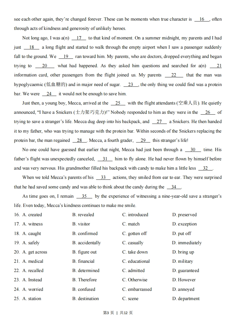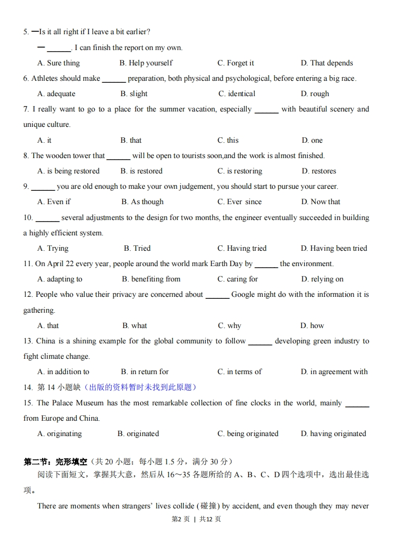 绝密★启用前2023年普通高等学校招生全国统一考试(天津卷)英语笔试(第二次)本试卷分为第卷(选择题)和第卷(非选择题)两部分,共130分,考试用时100分钟。第1卷1至10页,第Ⅱ卷11至12页。答卷前,考生务必将自己的姓名、考生号填写在答题卡上,并在规定位置粘贴考试用条形码。答卷时,考生务必将答案涂写在答题卡上,答在试卷上的无效。考试结束后,将本试卷和答题卡一并交回。祝各位考生考试顺利!第I卷注意事项:1.每小题选出答案后,用铅笔将答题卡上对应题目的答案标号涂黑。如需改动,用橡皮擦干净后,再选涂其他答案标号。2.本卷共55小题,共95分。第一部分:英语知识运用(共两节,满分45分)第一节:单项填空(共15小题:每小题1分,满分15分)从A、B、C、D四个选项中,选出可以填入空白处的最佳选项。例:Stand over thereyou'll be able to see it betterA.orB.andC.butD.while答案是B。1.-Is Mr.Pearl available,please?.I'll just see if he is in the office.A.After youB.Hang onC.With pleasureD.Go ahead2.Webother with details,for our teammates will do everything in their power to help us.A.mustn'tB.daren'tC.needn'tD.can't3.第3小题缺(出版的资料暂时未找到此原题)4.The bottle is quite difficult to open;the is to pour hot water on it first.A.focusB.targetC.functionD.trick第1页|共12页5.-Is it all right if I leave a bit earlier?I can finish the report on my own.A.Sure thingB.Help yourselfC.Forget itD.That depends6.Athletes should makepreparation,both physical and psychological,before entering a big race.A.adequateB.slightC.identicalD.rough7.I really want to go to a place for the summer vacation,especiallywith beautiful scenery andunique culture.A.itB.thatC.thisD.one8.The wooden tower thatwill be open to tourists soon,and the work is almost finished.A.is being restoredB.is restoredC.is restoringD.restores9.you are old enough to make your own judgement,you should start to pursue your career.A.Even ifB.As thoughC.Ever sinceD.Now that10.several adjustments to the design for two months,the engineer eventually succeeded in buildinga highly efficient system.A.TryingB.TriedC.Having triedD.Having been tried11.On April 22 every year,people around the world mark Earth Day by the environment.A.adapting toB.benefiting fromC.caring forD.relying on12.People who value their privacy are concerned aboutGoogle might do with the information it isgathering.A.thatB.whatC.whyD.how13.China is a shining example for the global community to followdeveloping green industry tofight climate change.A.in addition toB.in return forC.in terms ofD.in agreement with14.第14小题缺(出版的资料暂时未找到此原题)15.The Palace Museum has the most remarkable collection of fine clocks in the world,mainlyfrom Europe and China.A.originatingB.originatedC.being originatedD.having originated第二节:完形填空(共20小题:每小题1.5分,满分30分)阅读下面短文,掌握其大意,然后从16~35各题所给的A、B、C、D四个选项中,选出最佳选项。There are moments when strangers'lives collide (by accident,and even though they may never第2页|共12页see each other again,they're changed forever.These can be moments when true character is 16,oftenthrough acts of kindness and generosity of unlikely heroes.Not long ago,I was a(n)17 to that kind of moment.On a summer midnight,my parents and I hadjust 18 a long flight and started to walk through the empty airport when I saw a passenger suddenlyfall to the ground.We 19 ran toward him.My parents,who are doctors,dropped everything and begantrying to 20 what had happened.As they asked him questions and searched for a(n)21information card,other passengers f