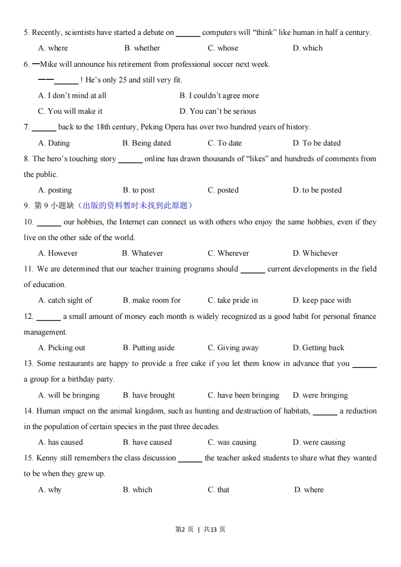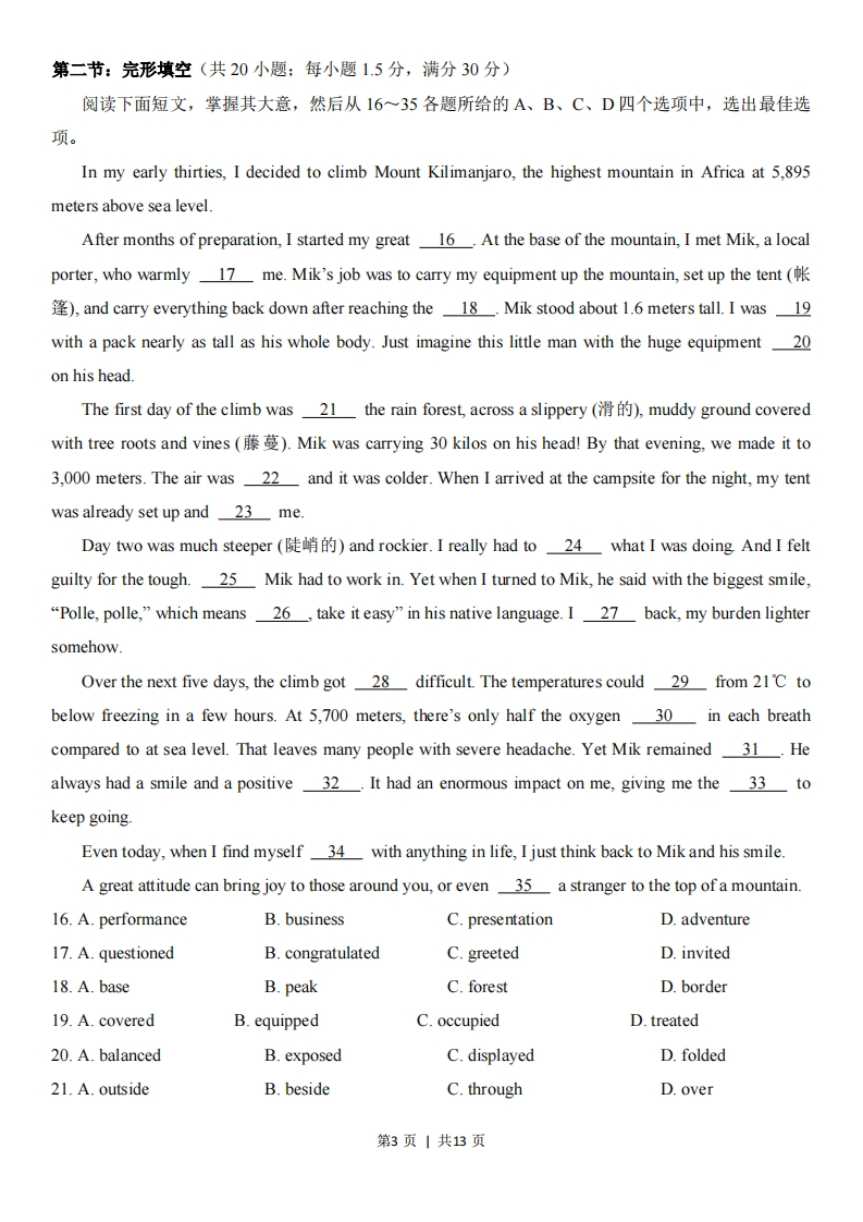 绝密★启用前2023年普通高等学校招生全国统一考试(天津卷)英语笔试(第一次)本试卷分为第卷(选择题)和第卷(非选择题)两部分,共130分,考试用时100分钟。第1卷1至11页,第Ⅱ卷12至13页。答卷前,考生务必将自己的姓名、考生号填写在答题卡上,并在规定位置粘贴考试用条形码。答卷时,考生务必将答案涂写在答题卡上,答在试卷上的无效。考试结束后,将本试卷和答题卡一并交回。祝各位考生考试顺利!第I卷注意事项:1.每小题选出答案后,用铅笔将答题卡上对应题目的答案标号涂黑。如需改动,用橡皮擦干净后,再选涂其他答案标号。2.本卷共55小题,共95分。第一部分:英语知识运用(共两节,满分45分)第一节:单项填空(共15小题:每小题1分,满分15分)从A、B、C、D四个选项中,选出可以填入空白处的最佳选项。例:Stand over thereyou'll be able to see it better.A.orB.andC.butD.while答案是B。1.Dragon Boat Festival is heldQu Yuan,a well-known poet in ancient China.A.in honor ofB.in search ofC.in the hope ofD.in the face of2.第2小题缺(出版的资料暂时未找到此原题)3.When Lisa moved to a new city,she had a hard timeto her new surroundings.A.addingB.adjustingC.applyingD.attending4.The British romantic poet William Wordsworth grew up in the Lake District,which was a greatof inspiration for his poems.A.discoveryB.formC.sourceD.symbol第1页|共13页5.Recently,scientists have started a debate oncomputers will "think"like human in half a century.A.whereB.whetherC.whoseD.which6.-Mike will announce his retirement from professional soccer next week.He's only 25 and still very fit.A.I don't mind at allB.I couldn't agree moreC.You will make itD.You can't be serious7.back to the 18th century,Peking Opera has over two hundred years of history.A.DatingB.Being datedC.To dateD.To be dated8.The hero's touching storyonline has drawn thousands of"likes"and hundreds of comments fromthe publicA.postingB.to postC.postedD.to be posted9.第9小题缺(出版的资料暂时未找到此原题)10.our hobbies,the Internet can connect us with others who enjoy the same hobbies,even if theylive on the other side of the world.A.HoweverB.WhateverC.WhereverD.Whichever11.We are determined that our teacher training programs shouldcurrent developments in the fieldof education.A.catch sight ofB.make room forC.take pride inD.keep pace with12.a small amount of money each month is widely recognized as a good habit for personal financemanagement.A.Picking outB.Putting asideC.Giving awayD.Getting back13.Some restaurants are happy to provide a free cake if you let them know in advance that youa group for a birthday party.A.will be bringingB.have broughtC.have been bringingD.were bringing14.Human impact on the animal kingdom,such as hunting and destruction of habitats,a reductionin the population of certain species in the past three decades.A.has causedB.have causedC.was causingD.were causing15.Kenny still remembers the class discussionthe teacher asked students to share what they wantedto be when they grew up.A.whyB.whichC.thatD.where第2页|共13页第二节:完形填空(共20小题:每小题1.5分,满分30分)阅读下面短文,掌握其大意,然后从16~35各题所给的A、B、C、D四个选项中,选出最佳选项。In my early thirties,I decided to climb Mount Kilimanjaro,the highest mountain in Africa at 5,895meters above sea level.After months of preparation,I started my great 16.At the base of the mountain,I met Mik,a localporter,who warmly 17 me.Mik's job was to carry my equipment up the mountain,set up the tent)and carry everything back down after reaching the 18.Mik stood about 1.6 meters tall.I was 19with a pack n
