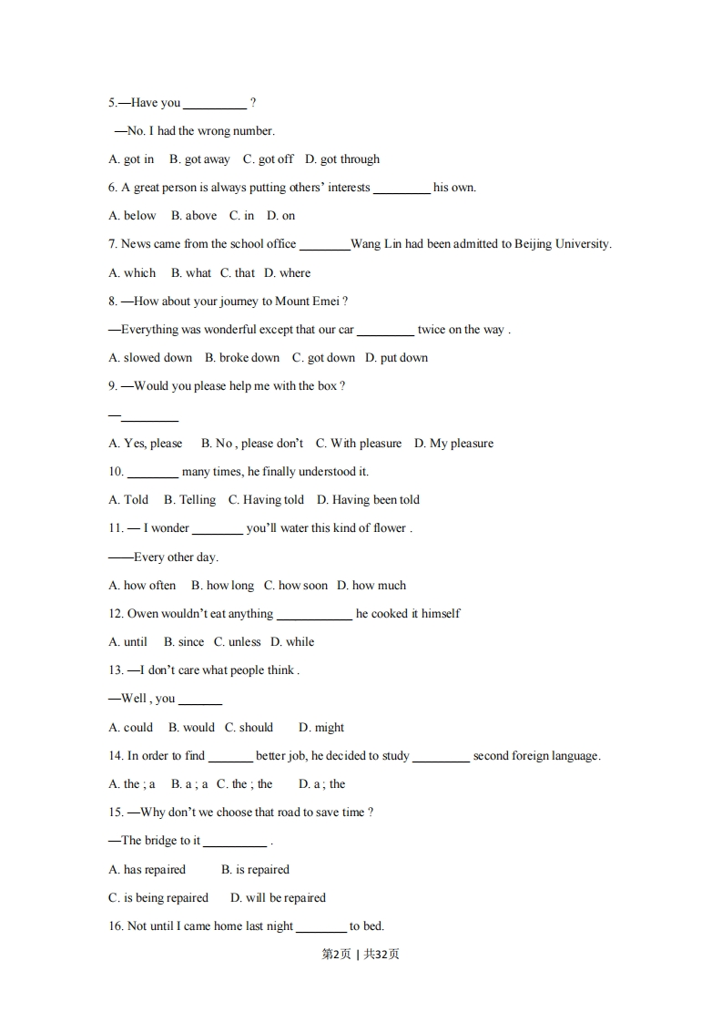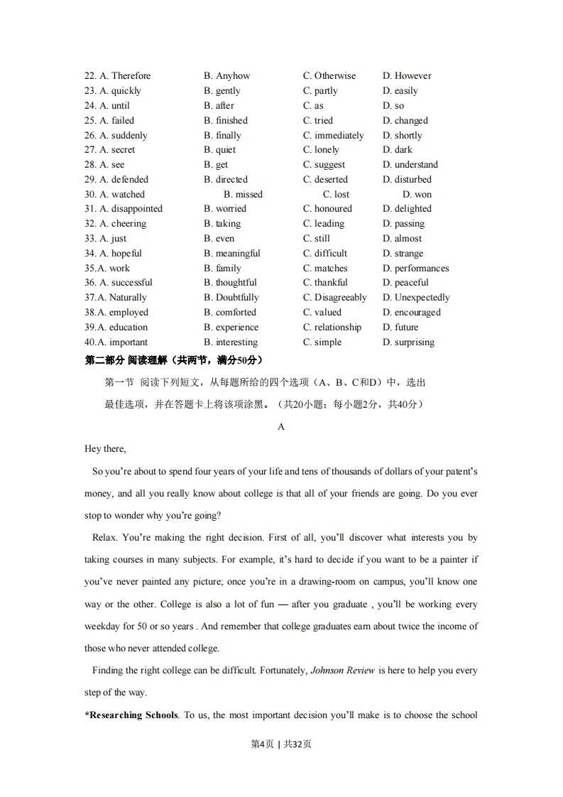 2009年普通高等学校招生全国统一考试(四川卷)英语本试卷分第1卷(选择题)和第卷(非选择题)两部分。第1卷1至11页,第和卷12至14页。满分150分,考试时间120分钟。考试结束,将本试卷和答题卡一并交回。第1卷(选择题,共100分)注意事项:1.答第I卷前,考生务必将自己的姓名、准考证号、考试科目涂写在答题卡上。2.160小题选出答案后,用铅笔把答题卡上对应题目的答案标号涂黑。如需改动,用橡皮擦干净后,再选涂其他答案标号。不能答在试卷上。3.61-65小题选出答案后,用钢笔或圆珠笔将答案标号填写在该题下面的相应题号后的横线上。不能答在答题卡上。第一部分英语知识运用(共两节,满分50分)第一节语法和词汇知识(共20小题:每小题1分,满分20分)从A、B、C、D四个选项中,选出可以填入空白处的最佳选项,并在答题卡上将该项涂黑1.-May I open the window to let in some fresh airA.Come on B.Take care C.Go ahead!D.Hold on!2.He told us whethera picnic was still under discussionA.to have B.having C.have D.had3.I like this house with a beautiful garden in front,but I don't have enough money tobuyA.one B.it C.this D.that4.Ladies and gentlemen,please remainuntil the plane has come to a complete stop.A.seated B.seating C.to seat D.seat第1页1共32页5.-Have you」-No.I had the wrong number.A.got in B.got away C.got off D.got through6.A great person is always putting others'interestshis own.A.below B.above C.in D.on7.News came from the school officeWang Lin had been admitted to Beijing UniversityA.which B.what C.that D.where8.-How about your joumey to Mount Emei?-Everything was wonderful except that our cartwice on the way.A.slowed down B.broke down C.got down D.put down9.-Would you please help me with the boxA.Yes,please B.No,please don't C.With pleasure D.My pleasure10.many times,he finally understood it.A.Told B.Telling C.Having told D.Having been told11.-I wonderyou'll water this kind of flower.-Every other day.A.how often B.how long C.how soon D.how much12.Owen wouldn't eat anythinghe cooked it himselfA.until B.since C.unless D.while13.-I don't care what people think.-Well,youA.could B.would C.shouldD.might14.In order to find better job,he decided to studysecond foreign language.A.the;a B.a;a C.thethe D.a;the15.-Why don't we choose that road to save time-The bridge to itA.has repairedB.is repairedC.is being repaired D.will be repaired16.Not until I came home last nightto bed第2页|共32页A.Mum did go B.did Mum go C.went Mum D.Mum went17.The teacher together with the studentsdiscussing Reading Skills thatnewly published in America.A.are;were B.is;were C.are;was D.is;was18.-You speak very good French!-Thanks IFrench in Sichuan University for four yearsA.studied B.study C.was studying D.had studied19.My uncle's house in the downtown area is much smaller than ours,but it is twiceexpensive.A.as B.so C.too D.very20.She'll never forget her stay thereshe found her son who had gone missing two yearsbefore.A.that B.which C.where D.when第二节完形填空(共20小题:每小题1.5分,满分30分)阅读下面短文,从短文后各题所给的四个选项(A、B、C和D)中,选出可以填入空白处的最佳选项,并在答题卡上将该项涂黑。I was successful at my job.I worked very hard,but it 21 me and my family a fabulouslifestyle.I'd worked for the same company for twenty years and had worked my way upto department director.22,one aftemoon last May,I was called to the office,and it was 23explained to me that they were letting me go.I just sat there 24 they talked on and all I couldthink was,"I've 25."I'd been so well respected26 I was of no value.For six week