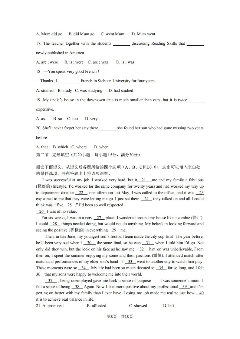 2009年普通高等学校招生全国统一考试(四川卷)英语本试卷分第1卷(选择题)和第卷(非选择题)两部分。第1卷1至11页,第和卷12至14页。满分150分,考试时间120分钟。考试结束,将本试卷和答题卡一并交回。第1卷(选择题,共100分)注意事项:1.答第I卷前,考生务必将自己的姓名、准考证号、考试科目涂写在答题卡上。2.160小题选出答案后,用铅笔把答题卡上对应题目的答案标号涂黑。如需改动,用橡皮擦干净后,再选涂其他答案标号。不能答在试卷上。3.61-65小题选出答案后,用钢笔或圆珠笔将答案标号填写在该题下面的相应题号后的横线上。不能答在答题卡上。第一部分英语知识运用(共两节,满分50分)第一节语法和词汇知识(共20小题:每小题1分,满分20分)从A、B、C、D四个选项中,选出可以填入空白处的最佳选项,并在答题卡上将该项涂黑1.-May I open the window to let in some fresh airA.Come on B.Take care C.Go ahead!D.Hold on!2.He told us whethera picnic was still under discussionA.to have B.having C.have D.had3.I like this house with a beautiful garden in front,but I don't have enough money tobuyA.one B.it C.this D.that4.Ladies and gentlemen,please remainuntil the plane has come to a complete stop.A.seated B.seating C.to seat D.seat第1页1共13页5.-Have you」-No.I had the wrong number.A.got in B.got away C.got off D.got through6.A great person is always putting others'interestshis own.A.below B.above C.in D.on7.News came from the school officeWang Lin had been admitted to Beijing UniversityA.which B.what C.that D.where8.-How about your joumey to Mount Emei?-Everything was wonderful except that our cartwice on the way.A.slowed down B.broke down C.got down D.put down9.-Would you please help me with the boxA.Yes,please B.No,please don't C.With pleasure D.My pleasure10.many times,he finally understood it.A.Told B.Telling C.Having told D.Having been told11.-I wonderyou'll water this kind of flower.-Every other day.A.how often B.how long C.how soon D.how much12.Owen wouldn't eat anythinghe cooked it himselfA.until B.since C.unless D.while13.-I don't care what people think.-Well,youA.could B.would C.shouldD.might14.In order to find better job,he decided to studysecond foreign language.A.the;a B.a;a C.thethe D.a;the15.-Why don't we choose that road to save time-The bridge to itA.has repairedB.is repairedC.is being repaired D.will be repaired16.Not until I came home last nightto bed第2页|共13页A.Mum did go B.did Mum go C.went Mum D.Mum went17.The teacher together with the studentsdiscussing Reading Skills thatnewly published in America.A.are;were B.is;were C.are;was D.is;was18.-You speak very good French!-Thanks IFrench in Sichuan University for four yearsA.studied B.study C.was studying D.had studied19.My uncle's house in the downtown area is much smaller than ours,but it is twiceexpensive.A.as B.so C.too D.very20.She'll never forget her stay thereshe found her son who had gone missing two yearsbefore.A.that B.which C.where D.when第二节完形填空(共20小题:每小题1.5分,满分30分)阅读下面短文,从短文后各题所给的四个选项(A、B、C和D)中,选出可以填入空白处的最佳选项,并在答题卡上将该项涂黑。I was successful at my job.I worked very hard,but it 21 me and my family a fabulouslifestyle.I'd worked for the same company for twenty years and had worked my way upto department director.22,one aftemoon last May,I was called to the office,and it was 23explained to me that they were letting me go.I just sat there 24 they talked on and all I couldthink was,"I've 25."I'd been so well respected26 I was of no value.For six week