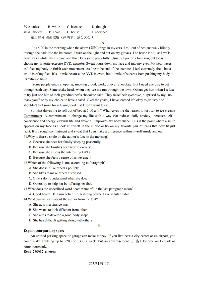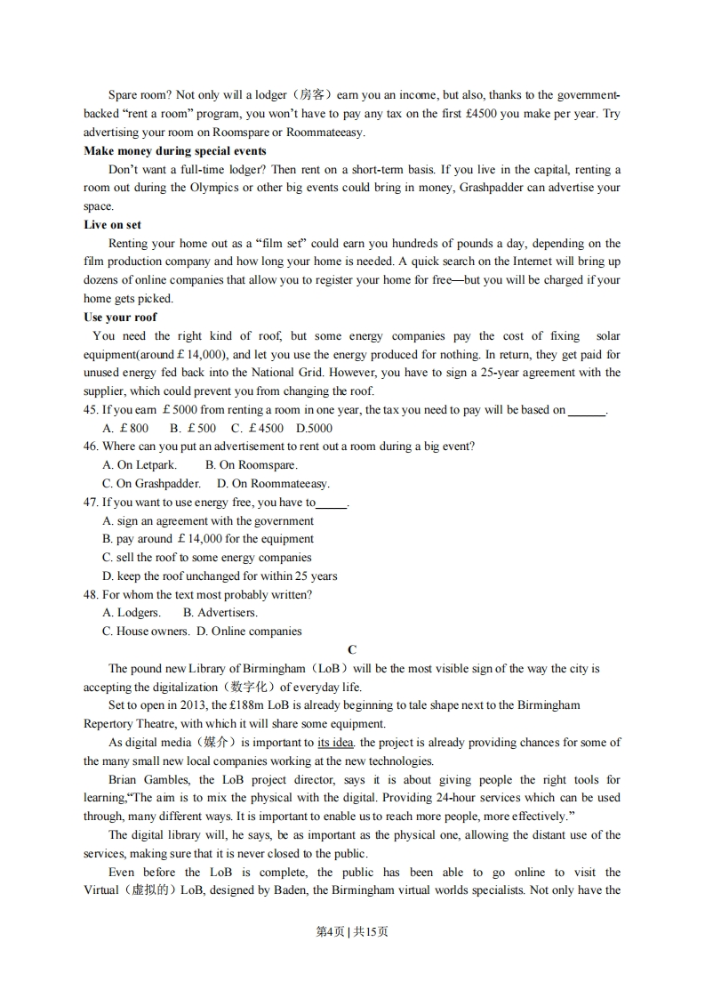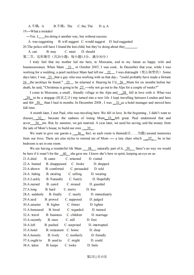 2011年普通高等学校招生全国统一考试(四川卷)英话第1卷(选择题共100分)第一部分英语知识运用(共两节,满分50分)第一节语法和词汇知识(共20小题:每小题1分,满分20分)1.-I'm sorry I didn't finish it on time.A.Fine,thanks B.No,thanks C.Thanks a lot D.Thanks anyway2.Ladia doesn't feel likeabroad.Her parents are old.A.study B.studying C.studied D.to study3.There is in his words.We should have a try.A.something B.anything C.nothing D.everything4.Frank insisted that he was not asleepI had great difficulty in waking him upA.whether B.although C.for D.so5.-How could you be so rude as to walk in here in the middle of my class?A.Nothing much B.Nothing serious C.Never again D.Never mind6.As it reported,it is 100 yearsQinghua University was founded.A.whenB.beforeC.afterD.since7.To get a better grade,you shouldthe notes again before the testA.go over B.get overC.tum overD.take over8.Nick,it's good for you to read some books_China before you start your trip there.A.inB.forC.of D.on9.All visitors to this villagewith kindness.A.treat B.are treated C.are treating D.had been treated10.Our teachers always tell us to believe inwe do and who we are if we want to succeed.A.why B.how C.what D.which11.Simon made a big bamboo box the little sick bird till it could fly.A.keep B.kept C.keeping D.to keep12.-How are your recent trip to Sichuan?-I've never had one before.A.a pleasant B.a more pleasant C.a most pleasant D.the most pleasant13.Always remember put such dangerous things as lives out children's_A.touch B.sight C.reach D.distance14.I oftenthe words I don't know in the dictionary or on the intemet.A.look up B.look at C.kook for D.look into15.Was it on a lonely islandhe was saved one month after the boat went down?.A.where B.that C.which D.what16.an important role in a new movie,Andy has got a chance to become famous.A.Offer B.Offering C.Offered D.To offer17.The school shop,customers are mainly students,is closed few the holidays.A.which B.whose C.when D.where18.Dr.Peter Spence,headmaster of the school,told us,"fifth of pupils here go on to study atOxford and Cambridge."第1页1共15页A.不填:AB.不填:TheC.the,TheD.a,A19.-What a mistake!-Yes.Ihis doing it another way,but without success.A.was suggesting B.will suggest C.would suggest D.had suggested20.The police still have I found the lost child,but they're doing about they_A.can B.may C.must D.should第二节,完形填空(共20小题:每小题1.5分,满分30分)I truly feel that my mother led me here,to Morzaine,and to my future as happy wife andbusinesswoman.When Mum 21 in October 2007,I was cook..In December that year,while I wasworking for a wedding,a pearl necklace Mum had left me_22 I was distraught(t忧心如焚的).Somedays later,I was 23 that a guy who was working with us that day."could probably have made a fortune24 the necklace he found."25.he returned it.Hearing he I'd 26 Mum for six months before herdeath,he said,"Christmas is going to be 27-why not go out to the Alps for a couple of weeks?"I come to Morzaine,a small,friendly village in the Alps and 28 fell in love with it .What was2 to be a stopgap(权宜之计)trip tumed into a new life.I ke