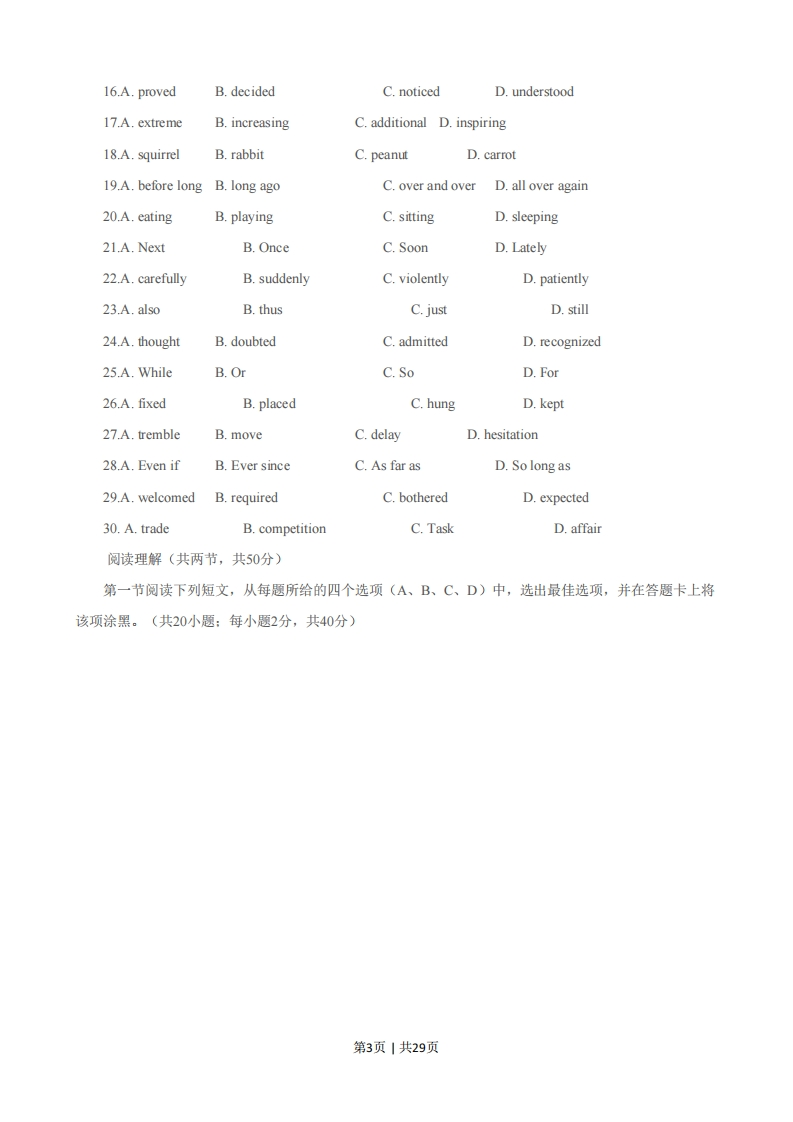 2015年普通高等学校招生全国统一考试(四川卷)英语本试题卷分第I卷(选择题)和第Ⅱ卷(非选择题)。第I卷至8页,第Ⅱ卷9至10页,共10页。满分150分。考试时间120分钟。考生作答时,须将答案答在答题卡上,在本试题卷、草纸上答题不小。考试结束后,将本试题卷和答题卡一并交回第1卷(选择题共90分)注意事项:1.必须使用2B铅笔在答题卡上将所选答案对应的标号涂黑2.第1卷共两部分,共计90分。第一部分英语知识运用(共两节,共40分)第一节单项填空从A、B、C、D四个选项中,选出可以填入空白处的最佳选项,并在答题卡上将该项涂黑。(共10小题:每小题1分,共10分)1.-Sorry,I forgot to lock the door.Mike can do it later.A.No way B.Take your time C.Nothing serious D.You're welcome2.You be careful with the camera.It costs!A.must B.mayC.canD.will3.The books on the desk,covers are shiny,are prizes for us.A.which B.what C.whoseD.that4.More expressways in Sichuan soon to promote the local economyA.are being builtB.will be builtC.have been builtD.had been built5.Brian is gifted in writing music;he is very likely to be Beethoven.A.aB.anC.theD.不填6.There is only one more day to go your favorite music group play live.A.sinceB.untilC.whenD.before7.Andy is content with the toy.It is he has ever got.A.a betterB.the betterC.a bestD.the best8.The exhibition tells us we should do something to stop air pollution.第1页1共29页A.whereB.whyC.whatD.which9.Little Tom sat watching the monkey dancing in front of himA.amazeB.amazingC.amazedD.to amaze10.Niki is always full of ideas,but is useful to my knowledge.A.nothingB.no oneC.neitherD.none第二节完形填空阅读下面短文,从短文后各题所给的四个选项(A、B、C、D)中,选出可以填入空白处的最佳选项,并在答题卡上将该项涂黑。(共20小题:每小题1.5分,共30分)My previous home had a stand of woods behind it and many animals in the backyard.That first year,I 11feeding peanuts to the blue jays,then the squirrels.The squirrels had no 12 coming up right to me for them.As the months went by,the rabbits saw that I was no 13 and didn't escape.When I threw carrotslices(),they even came for a nibble().Slowly they came to_14me,and by the end of the year theywere eating out of my hand.That second year,the rabbits 15 me,and one would even sit up for slices!While I was feeding them,I16 that a groundhog who used to run away was now talking an 17 interest in this food situation.Icarefully extended a long 18,with a keen eye on those teeth,and 19 there were times I would have thegroundhog sitting next to a rabbit,,both munching(津津有味的咀嚼)on carrots.A few months later,while20 she would even turn her back to me.21 when she was facing away,I reached out and22 scratched (her back with my finger,She didn't move.By year three,the rabbits and the groundhog were back.The groundhog23didn't have a problem withme scratching her back,and I got an ides,I'd always 24 while slicing up carrots,that the end looked like acap.25 one day,just to see what she would do ,I gently 26 one on top of the groundhog's head.Again,not a 27 ,The next time,I had my camera ready to record what you see here,one of several dozensuch pictures,28 she had a slice to eat,she never 29 the one of her head.It was a fair 30-Igot a pleasure,and she had yet another tasty treat.11.A.avoidedB.startedC.canceledD.suggested12.A.businessB.funC.problemD.privilege13.A.helpB.cheatC.threatD.exception14.A.trustB.missC.admireD.appreciate15.A.fearedB.ignoredC.discovered