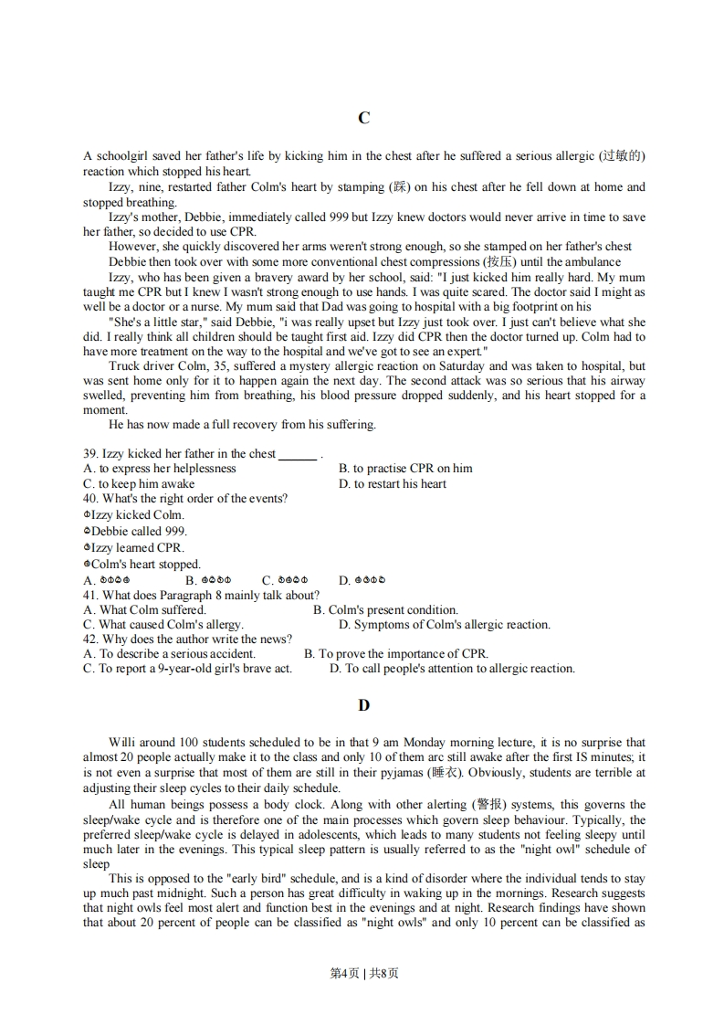 2014年四川省高考英语试题第I卷(选择题共90分)注意事项:1.必须使用2B铅笔在答题卡上将所选答案对应的标号涂黑。2.第I卷共两部分,计90分。第一部分英语知识运用第一节单项选择(共10小题:每小题1分,共10分)从A、B、C、D四个选项中国,选出可以填入空白处的最佳选项,并在答题卡上将该项涂黑1.She'd lived in London and Manchester,but she likedand moved to Cambridge.A.bothB.neitherC.noneD.either2.Grandma pointed to the hospital and said,"That'sI was born."A.whenB.howC.whyD.where3.Was it because Jack came late for schoolMr.Smith got angry?A.whyB.whoC.whereD.that4.Until now,we have raised 50.000 pounds for the poor children.is quite unexpectedA.thatB.whichC.whoD.it5.The manager was satisfied to see many new productsafter great effort.A.having developed B.to developC.developedD.develop6.I still remember my happy childhood when my mothertake me to Disneyland at weekends.A.might B.mustC.wouldD.should7.-I hope to take the computer course.-Good idea.more about it,visit this website.A.To find outB.Finding out C.To be finding out D.Having found out8.I'll be out for some time._anything important happens,call me up immediately.A.In caseB.As ifC.Even though D.Now that9.Shesomeone,so I nodded to her and went away.A.phonedB.had phoned C.was phoning D.has phoned10.-How about dinner tonight?It's on me.A.You are welcome B.Oh,I'd like to C.Well,I'm afraid so D.That's all right第二节完形填空(共20小题:每小题1.5分,共30分)阅读下面短文,从短文后各题所给的所给选项(A、B、C、D)中,选出可以填入空白处的最佳选项,并在答题卡上将该项涂黑。My husband,Tom,has always been good with animals,but I was still amazed when he befriended afemale grouse )It's 11 for a grouse to have any contact (with people.In fact,they're hard tospot,12 they usually fly off when they hear humans approaching.This grouse came into our lives in 13.Tom was working out in the field when he 14her walking around at the edge of the field.She was 15 unafraid and seemed to be_16about what he was doing.Tom saw the 17 bird several times,and she got more comfortable around him.We quickly grew18of the bird and decided to call her Mildred.One day,as Tom was working,Mildred came within a few feet of him to watch.Tom 19he didn't see her and kept working to see what she would do next.Apparently,she didn't like to be 20.She'd run up and peck (at Tom's hands,then第1页1共8页21 off to see what he would do.This went on for about 20 minutes,until Mildred became tired of the 22and left.As spring went and summer came,Mildred started to 23 more and more often.24Mildred felt comfortable enough to jump up on Tom's leg and stay long enough for me to get a25 of the two of them together.This friendly grouse soon felt 26 not just with our family,but withanybody who walked or drove by.When hunting season opened,we put a 27 at the end of our driveway asking 28not to shoot our pet grouse.My father,who lived down the road,29 wamed people not to shoot her.30,hunters would stop and take pictures,because they had never seen anything like her.11.A.interestingB.reasonableC.impossibleD.unusual12.A.thoughB.becauseC.unlessD.until13.A.springB.summerC.autumnD.winter14.A.gotB.keptC.noticedD.imagined15.A.naturallyB.certainlyC.normallyD.surprisingly16.A.crazyB.cur