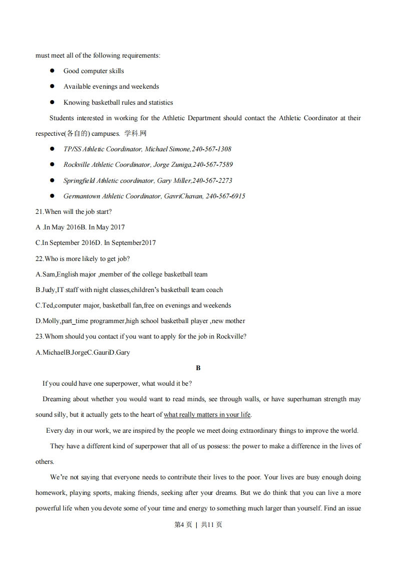绝密★启用前2016年普通高等学校全国统一考试(四川卷)英语注意事项:1.本试卷分第I卷(选择题)和第Ⅱ卷(非选择题)两部分。2.考生务必将自己的姓名、考生号填写在答题卡上。3.作答时,将答案写在答题卡上。写在本试卷上无效。4.考试结束后.将本试卷和答题卡一并交回。第I卷第一部分听力(共两节,满分30分)做题时,先将答案标在试卷上。录音内容结束后,你将有两分钟的时间将试卷上的答案转涂到答题卡上。第一节(共5个小题:每小题1.5分,满分7.5分)听下面5段对话。每段对话后有一个小题,从每题所给的A、B、C三个选项中选出最佳选项,并标在试卷的相应位置。听完每段对话后,你都有10秒钟的时间来回答有关小题和阅读下一小题。每段对话仅读一遍。例:How much is the shirt?A.£19.15.B.£9.18.C.£9.15答案是C.1.What will Lucy do at 11:30 tomorrow?A.Go out for lunch.B.See her dentist.C.Visit a friend.2.What is the weather like now?A.It's sunny.B.It's rainy.C.It's cloudy.3.Why does the man talk to Dr..Simpson?学.科.网A.To make an apology.B.To ask for help.C.To discuss his studies.4.How will the woman get back from the railway station?5.What does Jenny decide to do first?A.Look for a job.B.Go on a trip.D.Get an assistant.第二节(共15小题:年小题1.5分,满分22.5分)第1页|共11页听下面5段对话或独白。每段对话或独白后有几个小题,从题中所给的A、B、C三个选项中选出最佳选项,并标在试卷的相应位置。听每段对话或独白前,你将有时间阅读各个小题,每小题5秒钟:听完后,各小题将给出5秒钟的作答时间。每段对话或独白读两遍。请听第6段材料,回答6、7题。6.What time is it now?A.1:45.B.2:10.C.2:15.7.What will the man do?A.Work on a project.B.See Linda in the library.C.Meet with Professor Smith.请听第7段材料,回答第8至10题。8.What are the speakers talking about?A.Having guests this weekend.B.Going out for sightseeing.C.Moving into a new house.9.What is the relationship between the speakers?A.NeighborsB.Husband and wifeC.Host and visitor.10.What will the man do tomorrow?A.Work in his garden.B.Have a barbecue.C.Do some shopping.请听第8段材料,回答第11至13题11.Where was the man bornA.In Philadelphia.B.In Springfield.C.In Kansas.12.What did the man like doing when he was a child?A.Drawing.B.Traveling.C.Reading13.What inspires the man most in his work?A.Education.B.Family love.C.Nature请听第9段材料,回答第14至17题。14.Why is Dorothy going to Europe?A.Toattend a training program.B.Tocarry out some research.第2页|共11页C.To take a vacation.15.How long will Dorothy stay in Europe?A.A few daysB.Two weeks C.Three months16.What does Dorothy think of her apartment?A.It's expensive B.It's satisfactory.C.It's inconvenient17.What does Bill offer to do for Dorothy?A.Recommend her apartment.B.Find a new apartment.C.Take care of her apartment请听第10段材料,回答第18至20题。18.What are the tourists advised to do when touring London?A.Take their tour schedule.B.Watch out for the trafficC.Wear comfortable shoes.19.What will the tourists do in fifteen minutes?A.Meet the speaker.B.Go to their roomsC.Change some money.20.Where probably is the speaker?A.In a park.B.In a hotelC.In a shopping centre.第二部分阅读理解(共两节,满分40分)第一节(共15小题:每小题2分,满分30分)阅读下列短文,从每题所给的四个选项(A、B、C和D)中,选出最佳选项,并在答题卡上将该项涂黑。ABasketball Statistician Help WantedThe Athletic Department is looking for students to help assist staff during the Fall 2016,Winter 2016-17 andSpring 2017 semesters.Students in this position will be keeping live statistics during basketball games.Students第3页|共11页