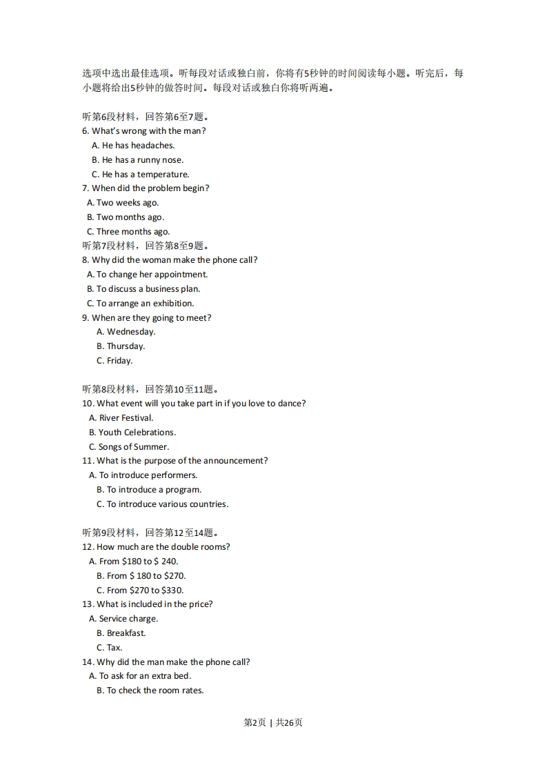 2009年普通高校招生统一考试北京卷(英语)(满分150分,时间120分钟)第1卷(选择题,共115分)第一部分听力理解(共两节,30分)第一节(共5小题:每小题1.5分,共7.5分)听下面五段对话。每段对话后有一道小题。从每题所给的A、B、C三个选项中选出最佳选项。听完每段对话后,你将有10秒钟时间来回答有关小题和阅读下一小题。每段对话你将听一遍。例:What is the man going to read?A.A newspaper.B.A magazineC.A book.答案是A。1.How fast can the woman type?A.15 words a minute.B.45 words a minute.C.80 words a minute.2.Which program does the man like most?A.Sports.B.History.C.News.3.Which language does Mr.White speak well?A.French.B.Spanish.C,Japanese.4.What was in the woman's missing bag?AB.5.Where does the conversation probably take place?A.In a classroom.B.In a library.C.In a bookstore.第二节(共15小题:每小题1.5分,共22.5分)听下面6段对话或独白。每段对话或独白后有几道小题,从每小题所给的A、B、C三个第1页1共26页选项中选出最佳选项。听每段对话或独白前,你将有5秒钟的时间阅读每小题。听完后,每小题将给出5秒钟的做答时间。每段对话或独白你将听两遍。听第6段材料,回答第6至7题。6.What's wrong with the man?A.He has headaches.B.He has a runny nose.C.He has a temperature.7.When did the problem begin?A.Two weeks ago.B.Two months agoC.Three months ago.听第7段材料,回答第8至9题。8.Why did the woman make the phone call?A.To change her appointment.B.To discuss a business plan.C.To arrange an exhibition.9.When are they going to meet?A.Wednesday.B.Thursday.C.Friday.听第8段材料,回答第10至11题。10.What event will you take part in if you love to dance?A.River Festival.B.Youth Celebrations.C.Songs of Summer.11.What is the purpose of the announcement?A.To introduce performers.B.To introduce a program.C.To introduce various countries.听第9段材料,回答第12至14题。12.How much are the double rooms?A.From $180 to S 240.B.From 180 to $270.C.From $270 to $330.13.What is included in the price?A.Service charge.B.Breakfast.C.Tax.14.Why did the man make the phone call?A.To ask for an extra bed.B.To check the room rates.第2页|共26页C.To change his reservation.听第10段材料,回答第15至17题。15.What are the speakers talking about?A.Picture books.B.Reference books.C.Cookbooks.16.How much is Worldwide Fish?A.£12.B.£15C.£1717.Which books does the woman decide to buy?A.Something Fishy.B.Worldwide Fish.C.Tasty Fish.听第11段材料,回答第18至20题。18.What did Maria do right after graduation?A.She entered politics.B.She worked as a teacher.C.She worked for her father.19.Where did Maria set up her first coffee bar?A.London.B.Singapore.C.New York.20.How many coffee bars does she have now?A.10.B.80.C.85.第二部分:知识运用(共两节,45分)第一节单项填空(共15小题:每小题1分,共15分)从每题所给的A、B、C、D四个选项中,选出可以填入空白处的最佳选项。并在答题卡上将该项涂黑。It's so nice to hear from her again.,we last met more than thirty years ago.A.What's moreB.That's to sayC.In other wordsD.Believe it or not答案是D。21.John plays basketball well,_his favorite sport is badminton.A.so B.or C.yet D.for22.You may use the room as you like you clean it up afterwards.A.so far as B.so long as C.in case D.even if第3页|共26页