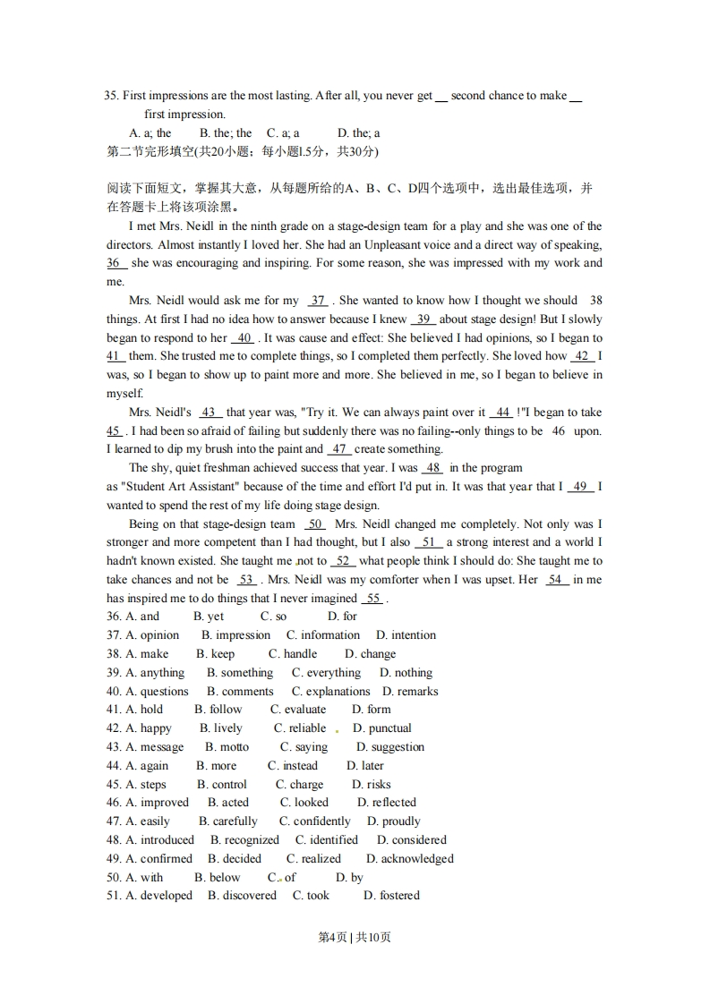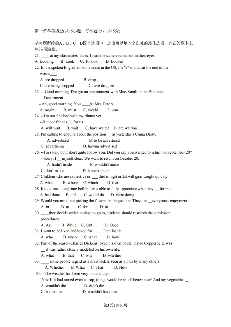 绝密★使用完毕前2010年普通高等学校招生全国统一考试英语(北京卷)本试卷共15页,共150分。考试时长120分钟。考生务必将答案答在答题卡上,在试卷上作答无效。考试结束后,将本试卷和答题卡一并交回。第一部分:听力理解(共三节,30分)第一节(共5小题:每小题1.5分,共7.5分)听下面5段对话。每段对话后有一道小题,从每题所给的A、B、C三个选项中选出最佳选项。听完每段对话后,你将有10秒钟的时间来回答有关小题和阅读下一小题。每段对话你将听一遍。1.What does the man want to be in the future?A.A soldier.B.A lawyer.C.A teacher.2.What does the girl want?A.Sweets.B.Books.C.Pencils.3.When did the two speakers plan to meet Jane?A.A2:00.B.At2:15.C.A2:30.4.what will the woman do tonight?A.Go to the park.B.Play basketball.C.Work at a bookstore.5.what is the woman doing?A.Offering help.B.Asking for information.C.Making an introduction.第二节(共10小题:每小题1.5分,共15分)听下面4段对话或独白。每段对话或独白后有几道小题,从每题所给的A、B、C三个选项中选出最佳选项。听每段对话或独白前,你将有5秒钟的时间阅读每小题。听完后,每小题将给出5秒钟的作答时间。每段对话或独白你将听两遍。听第6段材料,回答第6至7题。6.Where do the two speakers work?A.At a store.B.Ata hotel.C.At a school.7.Where does the woman come from?A.Brazil.B.Australia.C.Singapore.听第7段材料,回答第8至9题。8.What is the weather like in the north tonight?AB.9.What is the high temperature in the south tomorrow?第1页1共10页A.15C.B.20°C.C.23℃听第8段材料,回答第10至12题。10.What motivates the man to employ local people?A.To help the local business.B o To increase the local employment rate.C.To reduce the number of workers from other places.11.What will the man probably do in the future?A.Set up a new company.B.Run a training course.C.Lead an easier life.12.What is the possible relationship between the two speakers?A.Supplier and customer.B.Manager and secretary.C.Interviewer and interviewee.听第9段材料,回答第13至15题。13.What rule should you follow if you want to enter the sports complex?A.Wear appropriate shoes.B.Register on the notice board.C.Make an appointment with a coach.14.How much is the buffet?A.4.B.£8C.£1015.What is the purpose of the announcement?A.To introduce a playing field.B.To introduce a holiday campC.To introduce a fruit market.第三节(共5小题:每小题1.5分,共7.5分)听下面一段对话,完成第16至第20五道小题,每小题仅填写一个词。听对话前,你将有20秒钟的时间阅读试题,听完后你将有60秒钟的作答时间。这段对话你将听两遍。Customer Complaint Form(客户投诉表)CustomerThompson ElectronicsProblemA 16 delivery:.Printers ordered:25 HW 17.Printers delivered:25 HW56CauseA computer 18 problemSolutionPost the correct order_19 delivery解决方案)Put a$300 20_On the customer'S account第二部分:知识运用(共两节,45分)第2页1共10页第一节单项填空(共15小题:每小题1分,共15分)从每题所给的A、B、C、D四个选项中,选出可以填入空白处的最佳选项,并在答题卡上将该项涂黑。21.at my classmates'faces,I read the same excitement in their eyes.A.Looking B.Look C.To look D.Looked22.In the spoken English of some areas in the US,the"r"sounds at the end of thewords_A.are droppedB.dropC.are being droppedD.have dropped23.---Good moming.I've got an appointment with Miss Smith in the PersonnelDepartment.--Ah,good morning.You be Mrs.Peters.A.might B.must C.would D.can24.--I'm not finished with my dinner yet.--But our friends for us.A.will wait B.wait C.have waited D.are waiting25.I'm calling to enquire about the position in yesterday's China Daily.A.advertisedB.to be advertisedC.advertisingD.having advertised26.--I'm sorry,but I don't quite follow you.Did you say you wanted to return on September 2