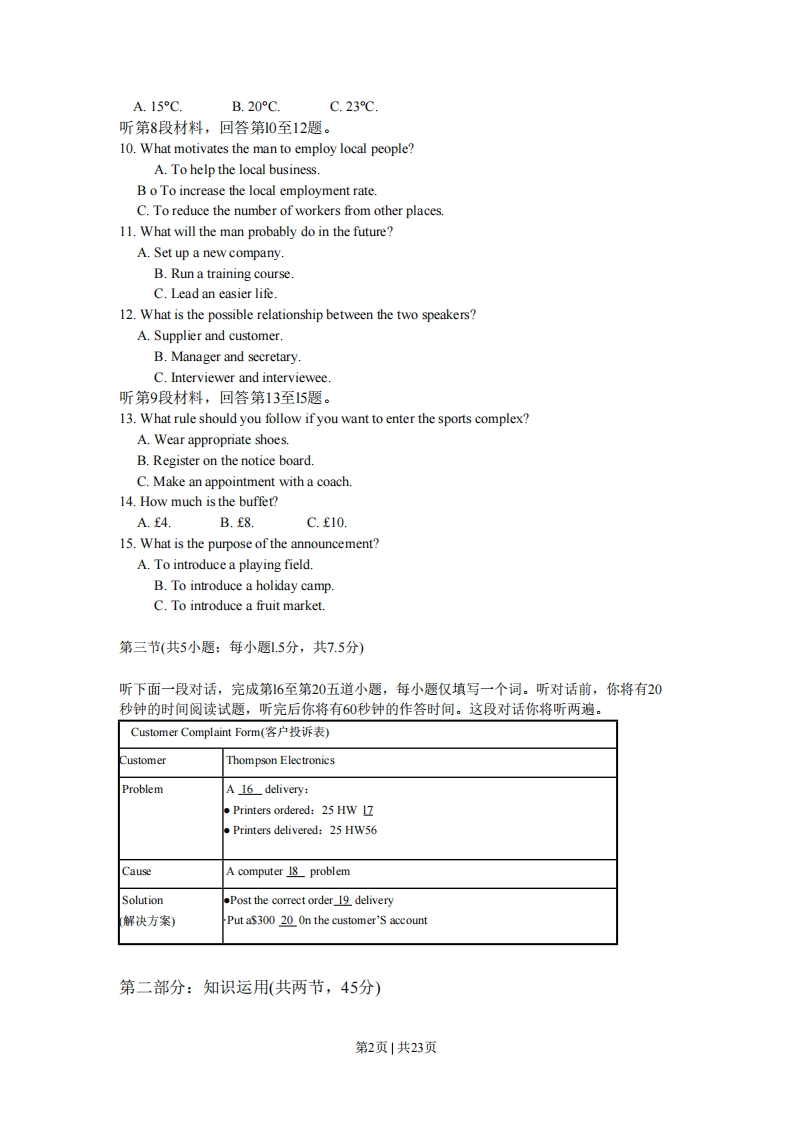 绝密★使用完毕前2010年普通高等学校招生全国统一考试英语(北京卷)本试卷共15页,共150分。考试时长120分钟。考生务必将答案答在答题卡上,在试卷上作答无效。考试结束后,将本试卷和答题卡一并交回。第一部分:听力理解(共三节,30分)第一节(共5小题:每小题1.5分,共7.5分)听下面5段对话。每段对话后有一道小题,从每题所给的A、B、C三个选项中选出最佳选项。听完每段对话后,你将有10秒钟的时间来回答有关小题和阅读下一小题。每段对话你将听一遍。1.What does the man want to be in the future?A.A soldier.B.A lawyer.C.A teacher.2.What does the girl want?A.Sweets.B.Books.C.Pencils.3.When did the two speakers plan to meet Jane?A.A2:00.B.At2:15.C.A2:30.4.what will the woman do tonight?A.Go to the park.B.Play basketball.C.Work at a bookstore.5.what is the woman doing?A.Offering help.B.Asking for information.C.Making an introduction.第二节(共10小题:每小题1.5分,共15分)听下面4段对话或独白。每段对话或独白后有几道小题,从每题所给的A、B、C三个选项中选出最佳选项。听每段对话或独白前,你将有5秒钟的时间阅读每小题。听完后,每小题将给出5秒钟的作答时间。每段对话或独白你将听两遍。听第6段材料,回答第6至7题。6.Where do the two speakers work?A.At a store.B.Ata hotel.C.At a school.7.Where does the woman come from?A.Brazil.B.Australia.C.Singapore.听第7段材料,回答第8至9题。8.What is the weather like in the north tonight?AB.9.What is the high temperature in the south tomorrow?第1页1共23页A.15C.B.20°C.C.23℃听第8段材料,回答第10至12题。10.What motivates the man to employ local people?A.To help the local business.B o To increase the local employment rate.C.To reduce the number of workers from other places.11.What will the man probably do in the future?A.Set up a new company.B.Run a training course.C.Lead an easier life.12.What is the possible relationship between the two speakers?A.Supplier and customer.B.Manager and secretary.C.Interviewer and interviewee.听第9段材料,回答第13至15题。13.What rule should you follow if you want to enter the sports complex?A.Wear appropriate shoes.B.Register on the notice board.C.Make an appointment with a coach.14.How much is the buffet?A.4.B.£8C.£1015.What is the purpose of the announcement?A.To introduce a playing field.B.To introduce a holiday campC.To introduce a fruit market.第三节(共5小题:每小题1.5分,共7.5分)听下面一段对话,完成第16至第20五道小题,每小题仅填写一个词。听对话前,你将有20秒钟的时间阅读试题,听完后你将有60秒钟的作答时间。这段对话你将听两遍。Customer Complaint Form(客户投诉表)CustomerThompson ElectronicsProblemA 16 delivery:.Printers ordered:25 HW 17.Printers delivered:25 HW56CauseA computer 18 problemSolutionPost the correct order_19 delivery解决方案)Put a$300 20_On the customer'S account第二部分:知识运用(共两节,45分)第2页1共23页第一节单项填空(共15小题:每小题1分,共15分)从每题所给的A、B、C、D四个选项中,选出可以填入空白处的最佳选项,并在答题卡上将该项涂黑。21.at my classmates'faces,I read the same excitement in their eyes.A.Looking B.Look C.To look D.Looked22.In the spoken English of some areas in the US,the"r"sounds at the end of thewords_A.are droppedB.dropC.are being droppedD.have dropped23.---Good moming.I've got an appointment with Miss Smith in the PersonnelDepartment.--Ah,good morning.You be Mrs.Peters.A.might B.must C.would D.can24.--I'm not finished with my dinner yet.--But our friends for us.A.will wait B.wait C.have waited D.are waiting25.I'm calling to enquire about the position in yesterday's China Daily.A.advertisedB.to be advertisedC.advertisingD.having advertised26.--I'm sorry,but I don't quite follow you.Did you say you wanted to return on September 2