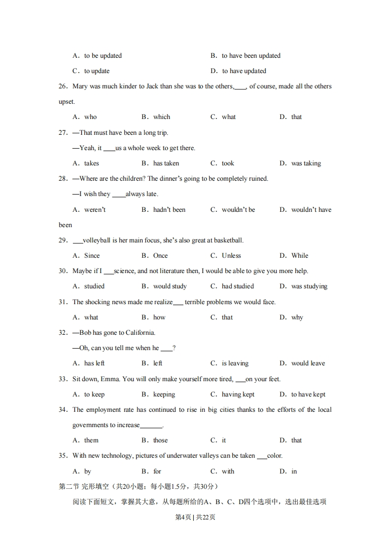 2011年普通高等学校招生全国统一考试(北京卷)英语本试卷共16页,共150分。考试时长120分钟。考生务必将答案答在答题卡上,在试卷上作答无效。考试结束后,将本试卷和答题卡一并交回。第一部分:听力理解(共三节,30分)第一节(共5小题:每小题1.5分,共7.5分)听下面5段对话。每段对话后有一道小题,从每题所给的A、B、C三个选项中选出最佳选项。听完每段对话后,你将有10秒钟的时间来回答有关小题和阅读下一小题。每段对话你将听一遍。例:What is the man going to read?A.A newspaper.B.A magazine.C.A book.答案是A。1.What color T-shirt does the man plan to order?A.Red.B.BlueC.Green2.Which section does the man like to read?A.News.B.Sports.C.Entertainment.3.What job will the man probably take in summer?A.Lifeguard.B.Tour guide.C.Swimming coach.4.Where does the woman want to go on holiday?A.TurkeyB.Canada.C.Italy.5.What are the two speakers talking about?A.Shark.B.Camera.C.Movie.第二节(共10小题:每小题1.5分,共15分)听下面4段对话或独白。每段对话或独白后有几道小题,从每题所给的A、B、C三个选项中选出最佳选项。听每段对话或独白前,你将有5秒钟的时间阅读每小题。听完后,每小题将给出5秒钟的作答时间。每段对话或独白你将听两遍。听第6段材料,回答第6至7题。6.What test are the speakers going to take on Friday?A.ScienceB.History.C.Music.第1页1共22页7.Why does the woman speaker make the phone call?A.To discuss her maths problems.B.To seek help with her English reading.C.To ask about the homework for tomorrow.听第7段材料,回答第8至9题。8.What does the man think is the cause of the woman's illness?A.Last night's dinner.B.The hot weather.C.Bottled water.9.What is the probable relationship between the two speakers?A.Husband and wifeB.Doctor and patientC.Guestandreceptionist.听第8段材料,回答第10至12题。10.What is the man doing?A.Making an invitation.B.Offering information.C.Askingforpermission.11.What time is the woman going to see the dentist this Saturday?A.10:30a.m.B.12:30p.m.C.4:30p.m.12.What is the woman going to do after seeing the dentist?A.Clean the house.B.Take a walk by the lake.C.Help Jim with his science project.听第9段材料,回答第13至15题。13.What makes shoppers tired?A.Queuing for electrically-driven cars.B.Looking for what they want to buy.C.Carrying shopping around.14.What is the problem for building moving walkways in the store?A.The space.B.The redesignC.The technology.15.Where will the computer system send the things shoppers buy?A.To the exit.B.To the shelf.C.To the shoppers'homes.第2页|共22页第三节(共5小题:每小题1.5分,共7.5分)听下面一段对话,完成第16至第20五道小题,每小题仅填写一个词,听对话前,你将有20秒钟的时间阅读试题,听完后你将有60秒钟的作答时间。这段对话你将听两遍。Missing Person Report FormTime last seenAbout 16 o'clock in the afternoonPlace last seenAt the 17 section of the storeName18AgeFiveAppearanceDark 19 hair,thin and smallClothingBlue 20,a pink T-shirt,a hat第二部分:知识运用(共两节,45分)第一节单项填空(共15小题:每小题1分,共15分)从每题所给的A、B、C、D四个选项中,选出可以填入空白处的最佳选项,并在答题卡上将该项涂黑。It's so nice to hear from her again.,we last met more than thirty years ago.A.What's moreB.That's to sayC.In other words D.Believe it ornot答案是D.21.Experiments of this kind in both the U.S.and Europe well before the Second World War.A.have conductedB.have been conductedC.had conductedD.had been conducted22.Barbara Jones offers to her fans is honesty and happinessA.WhichB.WhatC.ThatD.Whom23.Tom_in the library every night over the last three months.A.worksB.workedC.have been working D.hadbeenworking24.-I don't really like James.Why did you invite him?-Don't worry.Hecome.