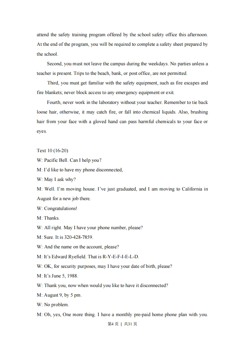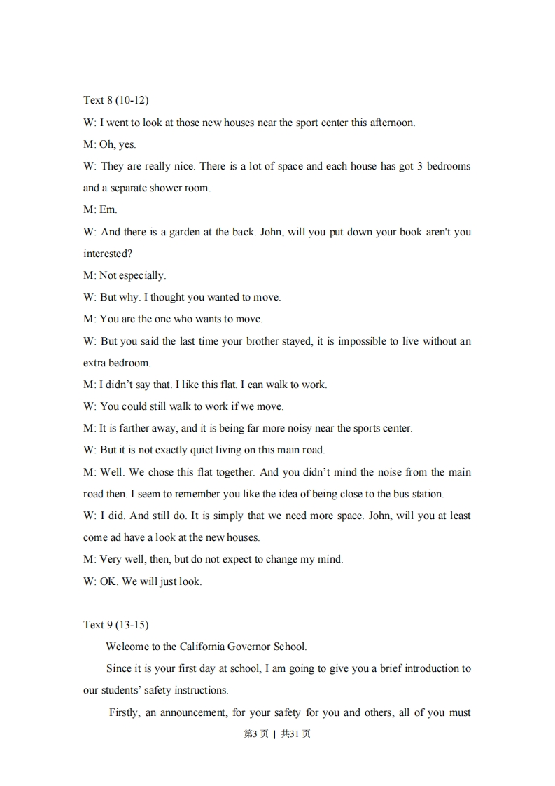 2012年北京市高考英语试卷套考答来与试题解所一、听力理解(共三节,30分)解析略1-5 ACBBC6-10 ABCAC 11-15 BCAAB16.Ryefield17.320-428-7859/320428785918.monthly19.Moving/Move20.August/Aug听力原文:Text 1M:Hello,Harry's Book Store.W:Hello.Is Tom there?M:Sorry,he is not here right now,can I take a message?W:Yes.Can youtell him Jane called?By the way,may I know your name?M:Mike Smith.Text 2M:Which do you prefer,Indian or Chinese food?W:Well,Indian is my favorite.What about you?M:I prefer Chinese when it is take-away.But I'd rather have Italian when I go out.Text 3W:Midwest Air,may I help you?M:Yes.What's your daily flight schedule from Chicago to Detroit?W:Ah,let's see.Our first flight is at 5:18 am,arriving at 6:10 am.There is one at 8am,arriving at 8:50 am.M:OK,thanks.Text 4W:Excuse me,is there a telephone around here?第1页|共31页M:Oh,yeah,it's just past the tennis court.W:The tennis court?M:Yes,it's near the back wall of the zoo.Text 5M:Welcome to your 247 weather forecast brought you by your Internet serviceprovider.The week will begin with snow which will end by Tuesday.Then it's cloudyevery day until the end of the week when we will have some sunshine.Text6(6-7)W:Will you be putting this on your credit card?M:No.I will pay cash.W:OK.So the total comes to 130 dollars,including tax.M:I thought it was 115 dollars.That's what they said yesterday when we checked in.W:Yes.But there is an extra room charge on your bill.M:Oh.I forgot.My wife ordered a cheese cake.SorryW:No problem.So,from 140 dollars,here is your change.I will need to ask for yourroom keys.Text7(8-9)W:What did you do last weekend,Bob?Stay at home again?M:No,I visited a friend and then I went to a dance.W:Did you enjoy the dance?M:No,I didn't.There were too many people.Ann,what about you?W:On Saturday I watched TV in the morning and went shopping in the afternoon.Iplayed tennis on Sunday.M:Ah,did you win?W:Yes,I did.M:Right then.Can I have a game with you sometime this weekend.W:Sure.第2页|共31页Text8(10-12)W:I went to look at those new houses near the sport center this afternoon.M:Oh,yesW:They are really nice.There is a lot of space and each house has got 3 bedroomsand a separate shower room.M:Em.W:And there is a garden at the back.John,will you put down your book aren't youinterested?M:Not especially.W:But why.I thought you wanted to move.M:You are the one who wants to move.W:But you said the last time your brother stayed,it is impossible to live without anextra bedroom.M:I didn't say that.I like this flat.I can walk to work.W:You could still walk to work if we move.M:It is farther away,and it is being far more noisy near the sports center.W:But it is not exactly quiet living on this main road.M:Well.We chose this flat together.And you didn't mind the noise from the mainroad then.I seem to remember you like the idea of being close to the bus station.W:I did.And still do.It is simply that we need more space.John,will you at leastcome ad have a look at the new houses.M:Very well,then,but do not expect to change my mind.W:OK.We will just l