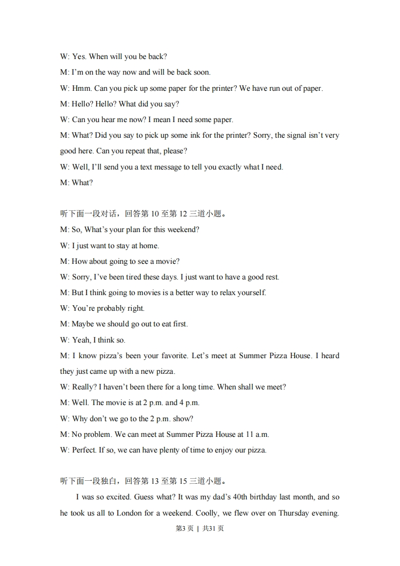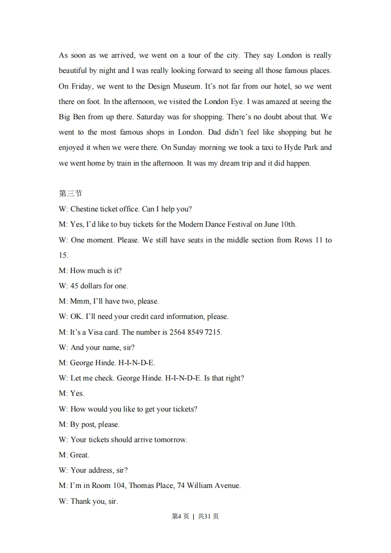 2014年北京市高考英语试卷套考答来与试题解所一、听力理解(共三节:30分)解析略参考答案:第一节1-5:CABBC第二节6-10:CACBA11-15:ACABB第三节16.Dance17.middle18.Hinde19.10420.post听力原文:第一节:Text 1W:Anything to drink,sir?M:What fruit juice do you have?W:We have apple,orange and lemon.M:OK,I'll have an orange juice.Text 2M:What have you been studying?W:Biology and chemistry.I like natural sciences.How about you?M:I prefer social sciences.I like history best.Text 3M:Hello,I'm John.Nice to meet you.W:Nice to meet you,too.I'm Natasha.Are you British?M:No,I'm American.Where are you from?W:I am from Russia.Text 4M:Good morning.How can I help you?第1页|共31页W:I'd like to buy a student bus pass..M:We have weekly,monthly and yearly ones.Which do you want?W:Monthly,please.Text 5M:Mary's birthday is coming.What shall we buy for her?.W:Is a pen OK?M:En...she has lots of pens.What about getting her a bicycle?W:Oh,no.We can't afford it.Let's get her a book.She loves reading very much.M:That's a good idea.第二节听下面一段对话,回答第6和第7两道小题。M:Good morning.Anything wrong?W:I've been suffering from a fever since yesterday.M:Do you have any other problems,like headache or cough?W:No,I don't.I think it's only a fever.M:Let me check.It's 39 degrees.I'll give you some medicine.W:Thank you,doctor.M:You'd better take two-or three-day's rest.W:Thanks.M:This medicine is for one day only.Take two pills as soon as you get home andanother two before going to bed.W:I see.Thank you.听下面一段对话,回答第8至第9两道小题。M:Hello.Hi,Stephanie.W:Hi,Tom.How are things going with you?M:Great.I've signed the agreement with ABC Company.How are things in theoffice?Is everything OK?第2页|共31页W:Yes.When will you be back?M:I'm on the way now and will be back soon.W:Hmm.Can you pick up some paper for the printer?We have run out of paper.M:Hello?Hello?What did you say?W:Can you hear me now?I mean I need some paper.M:What?Did you say to pick up some ink for the printer?Sorry,the signal isn't verygood here.Can you repeat that,please?W:Well,I'll send you a text message to tell you exactly what I need.M:What?听下面一段对话,回答第10至第12三道小题。M:So,What's your plan for this weekend?W:I just want to stay at home.M:How about going to see a movie?W:Sorry,I've been tired these days.I just want to have a good restM:But I think going to movies is a better way to relax yourself.W:You're probably right.M:Maybe we should go out to eat first.W:Yeah,I think so.M:I know pizza's been your favorite.Let's meet at Summer Pizza House.I heardthey just came up with a new pizza.W:Really?I haven't been there for a long time.When shall we meet?M:Well.The movie is at 2 p.m.and 4 p.m.W:Why don't we go to the 2 p.m.show?M:No problem.We can meet at Summer Pizza House at 11 a.m.W:Perfect.If so,we can have plenty of time to enjoy our pizza.听下面一段独白,回答第13至第15三道小题。I was so excited.Guess what?It was my dad's 40th birthday last month,and sohe took us all to London for a weekend.Coolly,we flew over on Thursday evening.第3页|共31页