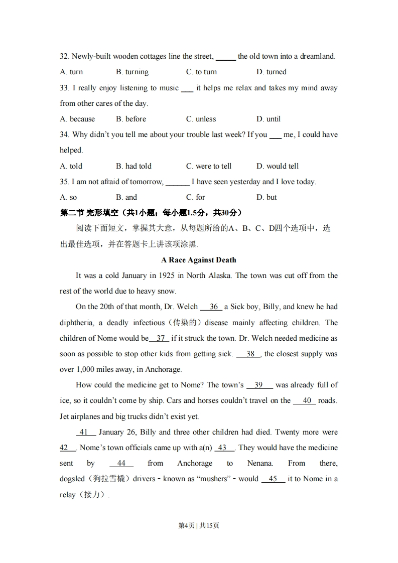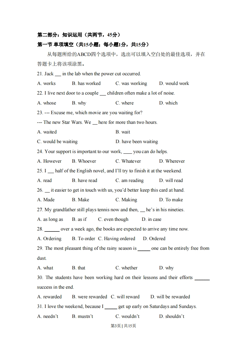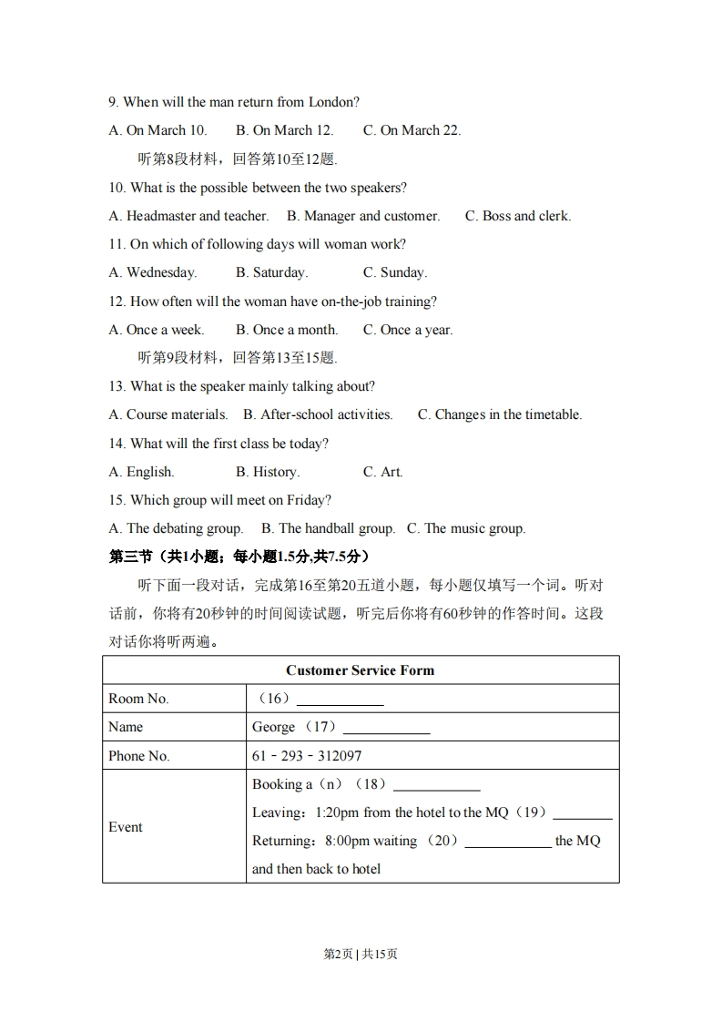 2016年北京市高考英语试卷第一部分:听力理解(共三节:30分)第一节(共5小题;每小题1.5分,共7.5分)听下面5段对话。每段对话后有一道小题,从每题所给的A、B、C三个选项中选出最佳选项听完每段对话后,你将有10秒钟的时间来回答有关小题和阅读下一小题,每段对话你将听一遍。1.What does the man want to borrow?A.A pencil.B.An eraser.C.A pen.2.What is the woman doing now?A.Eating.B.Going home.C.Having group study3.What does the man have for earthquake preparation?A.A candle.B.A radio.C.A flashlight4.Where does the conversation most probably take place?A.In a bank.B.In a hotel.C.In a store.5.Where will the man go for his holiday?A.Brazil.B.Denmark.C.Greece第二节(共4小题;每小题1.5分,共15分)听下面4段对话或独白。每段对话或独白后有几道小题,从每题所给的A、B、C三个选项中选出最佳选项。听每段对话或独白前,你将有5秒钟的时间阅读每小题。听完后,每小题将给出5秒钟的作答时间。每段对话或独白你将听两遍。听第6段材料,回答第6至7题6.When does the supermarket close on Sundays?A.At 5:00 pm.B.At 7:00 pm.C.At 8:00 pm.7.What have the two speakers decided to do now?A.Go shopping.B.Take a walk.C.Have dinner.听第7段材料,回答第8至9题」8.Why does the man make the call?A.To make a booking.B.To make a suggestion.C.To make an appointment.第1页|共15页9.When will the man return from London?A.On March 10.B.On March 12.C.On March 22听第8段材料,回答第10至12题10.What is the possible between the two speakers?A.Headmaster and teacher.B.Manager and customer.C.Boss and clerk.11.On which of following days will woman work?A.Wednesday.B.Saturday.C.Sunday.12.How often will the woman have on-the-job training?A.Once a week.B.Once a month.C.Once a year.听第9段材料,回答第13至15题13.What is the speaker mainly talking about?A.Course materials.B.After-school activities.C.Changes in the timetable.14.What will the first class be today?A.English.B.History.C.Art.15.Which group will meet on Friday?A.The debating group.B.The handball group.C.The music group.第三节(共1小题;每小题1.5分,共7.5分)听下面一段对话,完成第16至第20五道小题,每小题仅填写一个词。听对话前,你将有20秒钟的时间阅读试题,听完后你将有60秒钟的作答时间。这段对话你将听两遍。Customer Service FormRoom No.(16)NameGeorge (17)Phone No.61-293-312097Booking a (n)(18)Leaving:1:20pm from the hotel to the MQ (19)EventReturning:8:00pm waiting (20)the MQand then back to hotel第2页|共15页第二部分:知识运用(共两节,45分)第一节单项填空(共15小题;每小题1分,共15分)从每题所给的ABCD四个选项中,选出可以填入空白处的最佳选项,并在答题卡上将该项涂黑。21.Jack in the lab when the power cut occurred.A.worksB.has workedC.was workingD.would work22.I live next door to a couple children often make a lot of noise.A.whoseB.whyC.whereD.which23.---Excuse me,which movie are you waiting for?---The new Star Wars.We here for more than two hours.A.waitedB.waitC.would be waitingD.have been waiting24.Your support is important to our work,you can do helpsA.HoweverB.WhoeverC.WhateverD.Wherever25.I half of the English novel,and I'll try to finish it at the weekend.A.readB.have readC.am readingD.will read26.it easier to get in touch with us,you'd better keep this card at hand.A.MadeB.MakeC.MakingD.To make27.My grandfather still plays tennis now and then,he's in his nineties.A.as long as B.as ifC.even thoughD.in case28.over a week ago,the books are expected to arrive any time nowA.OrderingB.To order C.Having ordered D.Ordered29.The most pleasant thing of the rainy season isone can be entirely free fromdust.A.whatB.thatC.whetherD.