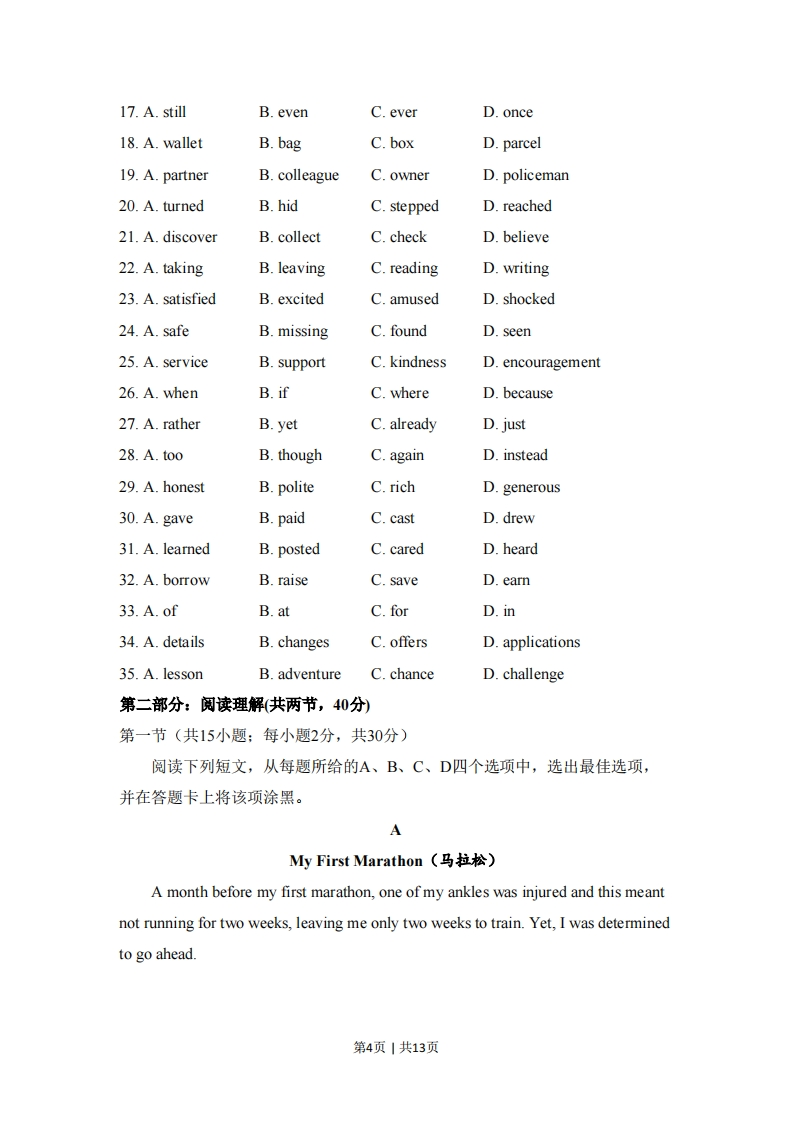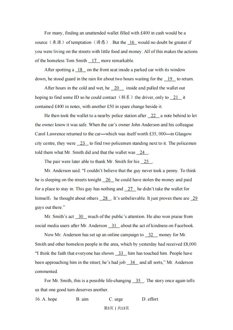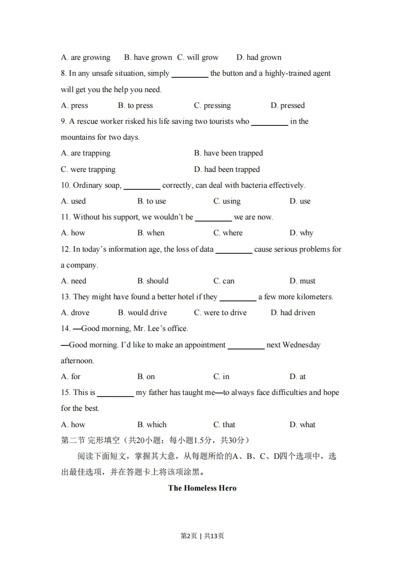 2018年北京市高考英语试卷(考试时间:100分钟试卷满分:120分)第一部分:知识运用(共两节,45分)第一节单项填空(共15小题:每小题1分,共15分)从每题所给的A、B、C、D四个选项中,选出可以填入空白处的最佳选项,并在答题卡上将该项涂黑。例:It's so nice to hear from her again.we last met more than thirtyyears ago.A.What's moreB.That's to sayC.In other wordsD.Believe it or not答案是D1.-Hi,I'm Peter.Are you new here?I haven't seen you around?-Hello,Peter.I'm Bob.I juston Monday.A.startB.have startedC.startedD.had started2.we don't stop climate change,many animals and plants in the worldwill be gone.A.AlthoughB.WhileC.IfD.Untilalong the old Silk Road is an interesting and rewarding experienceA.TravelB.TravelingC.Having traveled D.Traveled4.Susan had quit her well-paid job andas a volunteer in the neighborhoodwhen I visited her last year.A.is workingB.was workingC.has workedD.had worked5.She and her family bicycle to work,helps them keep fit.A.whichB.whoC.asD.that6.During the Mid-Autumn Festival,family members often gather togethera meal,admire the moon and enjoy moon cakes.A.shareB.to shareC.having sharedD.shared7.China's high-speed railwaysfrom 9,000 to 25,000 kilometers in thepast few years.第1页|共13页A.are growingB.have grown C.will growD.had grown8.In any unsafe situation,simplythe button and a highly-trained agentwill get you the help you need.A.pressB.to pressC.pressingD.pressed9.A rescue worker risked his life saving two tourists whoin themountains for two days.A.are trappingB.have been trappedC.were trappingD.had been trapped10.Ordinary soap,correctly,can deal with bacteria effectively.A.usedB.to useC.usingD.use11.Without his support,we wouldn't bewe are now.A.howB.whenC.whereD.why12.In today's information age,the loss of datacause serious problems fora companyA.needB.shouldC.canD.must13.They might have found a better hotel if theya few more kilometers.A.droveB.would driveC.were to driveD.had driven14.-Good morning,Mr.Lee's office.-Good morning.I'd like to make an appointmentnext Wednesdayafternoon.A.forB.onC.inD.at15.This ismy father has taught me-to always face difficulties and hopefor the best.A.howB.whichC.thatD.what第二节完形填空(共20小题:每小题1.5分,共30分)阅读下面短文,掌握其大意,从每题所给的A、B、C、D四个选项中,选出最佳选项,并在答题卡上将该项涂黑。The Homeless Hero第2页|共13页For many,finding an unattended wallet filled with f400 in cash would be asource(来源)of temptation(诱惑).But the_l6 would no doubt be greater ifyou were living on the streets with little food and money.All of this makes the actionsof the homeless Tom Smith 17 more remarkable.After spotting a 18 on the front seat inside a parked car with its windowdown,he stood guard in the rain for about two hours waiting for the 19 to return.After hours in the cold and wet,he 20 inside and pulled the wallet outhoping to find some ID so he could contact (the driver,only to 21 itcontained f400 in notes,with another f50 in spare change beside it.He then took the wallet to a nearby police station after 22a note behind to letthe owner know it was safe.When the car's owner John Anderson and his colleagueCarol Lawrence returned to the car-which was itself worth f35,000-