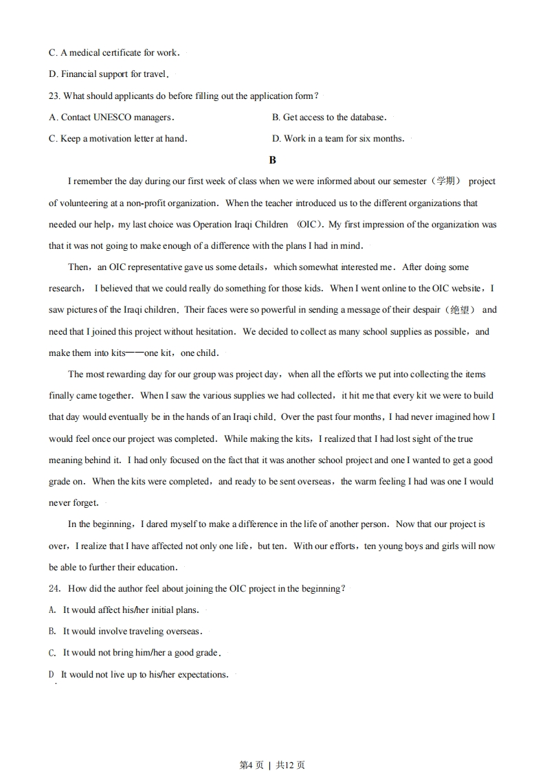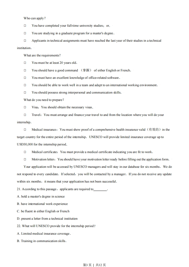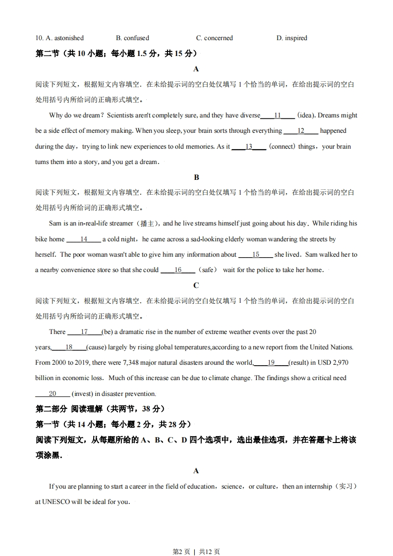 2021年普通高等学校招生全国统一考试北京卷·英语本试卷共11页,共100分.考试时长90分钟.考生务必在答题卡指定区域作答,在试卷上作答无效,考试结束后,将本试卷和答题卡一并交回.第一部分知识运用(共两节,30分)第一节(共10小题;每小题1.5分,共15分)阅读下面短文,掌握其大意,从每题所给的A、B、C、D四个选项中,选出最佳选项,并在答题卡上将该项涂黑,Recently,I took a trip home by train.I got a seat opposite a middle-aged man with sharp eyes,whokept1a young woman in a window seat with a little boy on her lap.The woman's eye fell on the man'sface,and she immediately looked down and 2her scarf.As the night wore on,people began to close their eyes,but the seats were so uncomfortable that only a veryheavy sleeper could manage to get any3.The woman looked over at the man.He was still staring ather.She looked back at him with fire in her eyes.I was beginning to get4,too.The train moved on.The little boy was5awake on his mother's lap,but the woman dropped off tosleep.A moment later,he began to6the half-open window-one leg went over it.The man jumped up and7 the child just before he fell out.The 8 woke up the woman.She seemed to be in 9,and then reality dawned ()"Yourchild has been looking for an opportunity to climb out of the window,"the man said as he gave the child back toher.."So I have been watching the whole time.The woman was 10,and so was I.1.A.guidingB.botheringC.watchingD.monitoring2.A.adjustedB.changedC.packedD.waved3.A.airB.joyC.spaceD.rest4.A.nervousB.embarrassedC.angryD.disappointed5.A.almostB.stillC.hardlyD.even6 A.dragB.climbC.knockD.push7.A.grabbedB.rockedC.touchedD.picked8.A.alarmB.quarrelC.riskD.noise9.A.sorrowB.reliefC.panicD.pain第1页」共12页10.A.astonishedB.confusedC.concernedD.inspired第二节(共10小题;每小题1.5分,共15分)A阅读下列短文,根据短文内容填空.在未给提示词的空白处仅填写1个恰当的单词,在给出提示词的空白处用括号内所给词的正确形式填空。Why do we dream?Scientists aren't completely sure,and they have diverse11(idea).Dreams mightbe a side effect of memory making.When you sleep,your brain sorts through everything 12 happenedduring the day,trying to link new experiences to old memories.As it 13(connect)things,your braintums them into a story,and you get a dream.B阅读下列短文,根据短文内容填空.在未给提示词的空白处仅填写1个恰当的单词,在给出提示词的空白处用括号内所给词的正确形式填空。Sam is an in-real-life streamer ()and he live streams himself just going about his day.While riding hisbike home 14a cold night,he came across a sad-looking elderly woman wandering the streets byherself.The poor woman wasn't able to give him any information about 15she lived.Sam walked her toa nearby convenience store so that she could 16(safe)wait for the police to take her home.C阅读下列短文,根据短文内容填空.在未给提示词的空白处仅填写1个恰当的单词,在给出提示词的空白处用括号内所给词的正确形式填空。There17(be)a dramatic rise in the number of extreme weather events over the past 20years,18(cause)largely by rising global temperatures,according to a new report from the United Nations.From 2000 to 2019,there were 7,348 major natural disasters around the world,19(result)in USD 2,970billion in economic loss.Much of this increase can be due to climate change.The findings show a critical need20(invest)in disaster prevention.第二部分阅读理解(共两节,38分)第一节(共14小题:每小题2分,共28分)阅读下列短文,从每题所给的A、B、C、D四个选项中,选出最佳选项,并在答题卡上将该项涂黑。以If you are pla