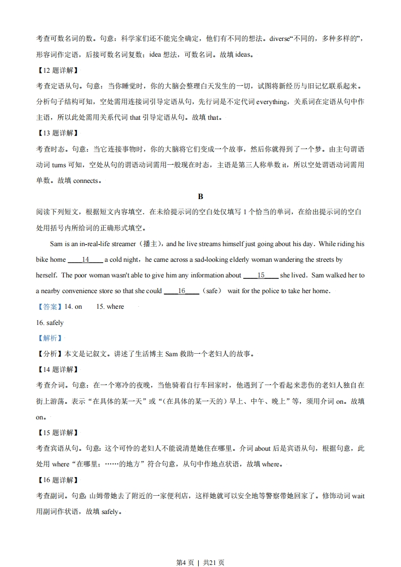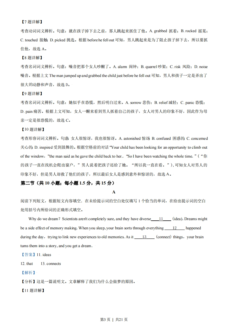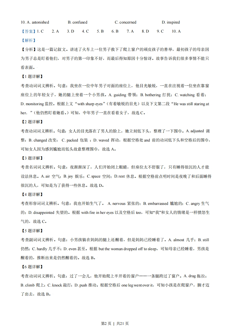 2021年普通高等学校招生全国统一考试北京卷·英语本试卷共11页,共100分.考试时长90分钟.考生务必在答题卡指定区域作答,在试卷上作答无效,考试结束后,将本试卷和答题卡一并交回.第一部分知识运用(共两节,30分)第一节(共10小题;每小题1.5分,共15分)阅读下面短文,掌握其大意,从每题所给的A、B、C、D四个选项中,选出最佳选项,并在答题卡上将该项涂黑,Recently,I took a trip home by train.I got a seat opposite a middle-aged man with sharp eyes,whokept1a young woman in a window seat with a little boy on her lap.The woman's eye fell on the man'sface,and she immediately looked down and 2her scarf.As the night wore on,people began to close their eyes,but the seats were so uncomfortable that only a veryheavy sleeper could manage to get any3.The woman looked over at the man.He was still staring ather.She looked back at him with fire in her eyes.I was beginning to get4,too.The train moved on.The little boy was5awake on his mother's lap,but the woman dropped off tosleep.A moment later,he began to6the half-open window-one leg went over it.The man jumped up and7 the child just before he fell out.The 8 woke up the woman.She seemed to be in 9,and then reality dawned ()"Yourchild has been looking for an opportunity to climb out of the window,"the man said as he gave the child back toher.."So I have been watching the whole time."The woman was 10,and so was I.1.A.guidingB.botheringC.watchingD.monitoring2.A.adjustedB.changedC.packedD.waved3.A.airB.joyC.spaceD.rest4.A.nervousB.embarrassedC.angryD.disappointed5.A.almostB.stillC.hardlyD.even6.A.dragB.climbC.knockD.push7.A.grabbedB.rockedC.touchedD.picked8.A.alarmB.quarrelC.riskD.noise9.A.sorrowB.reliefC.panicD.pain第1页」共21页10.A.astonishedB.confusedC.concernedD.inspired【答案】1.C2.A3.D4.C5.B6.B7.A8.D9.C10.A【解析】【分析】这是一篇记叙文。讲述了火车上一位男子救下了爬上窗户的顽皮孩子的善举,最初孩子的母亲因为男子总是盯着他们,对男子的第一印象不好,而最后得知原因十分惊讶。故事告诉我们很多事情不能只看表面。【1题详解】考查动词词义辨析。句意:我坐在一位中年男子对面的座位上,他目光敏锐,一直在注视着一位坐在靠窗座位上的年轻女子,她的腿上坐着一个小男孩。A.guiding带领:B.bothering打扰:C.watching看着:D.monitoring监控。根据上文“with sharp eyes”(有着敏锐的目光)以及下文第二段“He was still staring ather.”(他仍然盯着她看.)可知,中年男子一直在看着女子,故选C。【2题详解】考查动词词义辨析。句意:女人的目光落在了男人的脸上,她立刻低下头,整理了一下围巾。A.adjusted调整:B.changed改变:C.packed包装:D.waved挥动,根据空格处and前的动词低下头和空格后的围巾,可知女人因为感到尴尬而低头故意整理围巾,故选A。【3题详解】考查名词词义辨析。句意:夜渐渐深了,人们开始闭上眼睛,但座位太不舒服了,只有睡得很沉的人才能设法休息。A.air空气:B.joy娱乐:C.space空间:D.rest休总。根据空格前点明时间是夜晚了和后面睡得很沉的人,可知是为了获得一些休息。故选D。【4题详解】考查形容词词义辨析。句意:我也开始生气了。A.nervous紧张的:B.embarrassed尴尬的:C.angry生气的:D.disappointed失望的。根据with fire in her eyes以及空格后too,可知“我”和女人的情绪是一样愤怒生气的,故选C。【5题详解】考查副词词义辨析。句意:小男孩躺在妈妈的腿上还醒着,但是妈妈己经睡着了。A.almost几乎:B.sti训仍然:C.hardly几乎不:D.even甚至。根据but the woman dropped off to sleep,可知母亲己经睡着,男孩是醒着的,推断出来是仍然醒着的。故选B。【6题详解】考查动词词义辨析。句意:过了一会儿,他开始爬上半开着的窗户一一一条腿跨过了窗户。A.dag拖拉:B.climb爬上:C.knock敲打:D.push推动。根据空格后one leg wentover it,.可知小孩是在爬窗户,脚才迈了出去,故选B。第2页」共21页【7题详解】考查动词词义辨析。句意:就在孩子掉下去之前,那人跳起来抓住了他。A.grabbed抓着:B.rocked摇晃:C.touched接触D.picked挑选。根据before he fell out可知,男人跳起来是为了阻止孩子掉下去,所以要抓住他,故选A。【8题详解】考查名词词义辨析。句意:噪音把那个女人吵醒了。A.alam闹钟:B.quarrel吵架:C.risk风险:D.noise噪音。根据上文The man jumped upand grabbed the child just before he fell out可知,男人和孩子一定是弄出了很大的动静和声音,故选D。【9题详解】考查名词词义辨析。句意:她似乎在恐慌,然后明白过来。A.sorrow悲伤:B.relief减轻:C.panic恐慌:D.pai痛苦。根据上文可知,女人一醒来看到男人抓着自