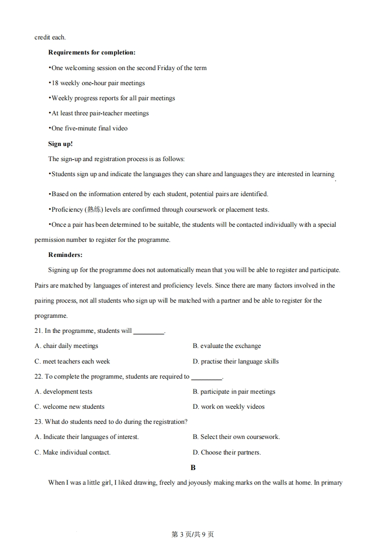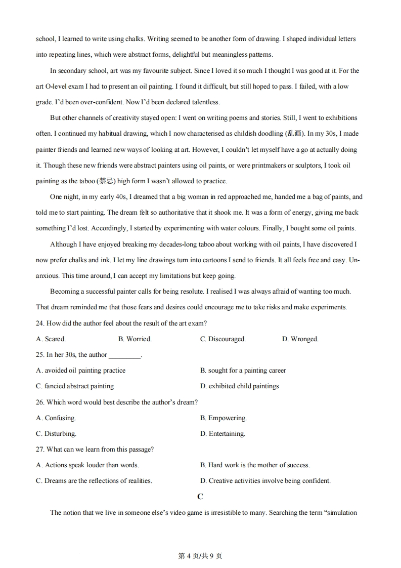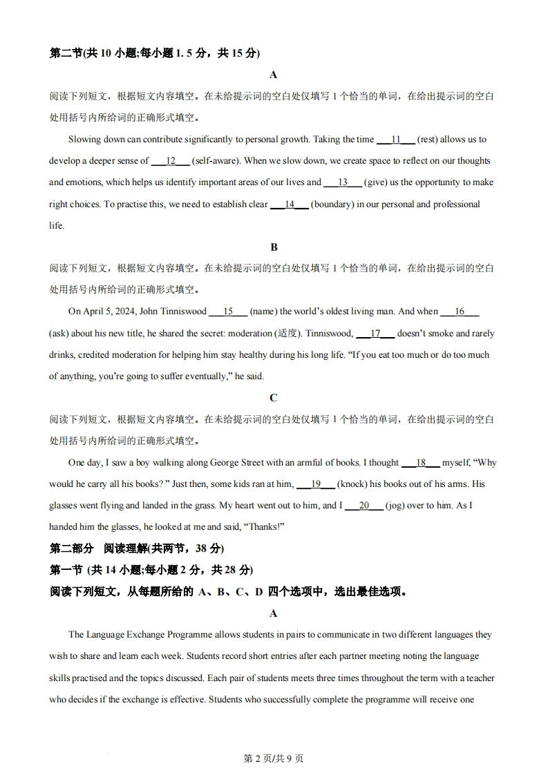 2024年普通高等学校招生高考真题全国统一考试(北京卷)英语第一部分知识运用(共两节,30分)第一节(共10小题;每小题1.5分,共15分)阅读下面短文,掌握其大意,从每题所给的A、B、C、D四个选项中,选出最佳选项。I'd just arrived at school,ready for another school day.I was reading a book in the classroom when there wasan 1."Today at 1:10 there will be auditions (for a musical."My friends all jumped up in excitementand asked me,"Will you be going,Amy?""Sure,"I said.I had no 2 in drama,but I'd try out because myfriends were doing it.At 1:10,there was a3outside the drama room.Everyone looked energetic.I hadn't expected I'd bestanding there that morning.But now that I was doing it,I 4 felt nervous.What if I wasn't any good?I entered the room and the teachers made me say some lines from the musical.They then5my singingskills and asked what role I wanted to play.The teachers were smiling and praising me.I felt like I had a6so I said,"A big role."They said they'd look into it.I started getting really nervous.What if I didn't get a mainrole?Soon,the cast list was7 My friends checked and came back shouting,"Amy,you got the main role!Sure enough,my name was at the top.I just stared at it and started to8 I was so happy.After two months we were all prepared and ready to go on stage.It was fun.And when people started9,that gave me a boost of confidence.It stayed with me and made me feel 10.I realised that bytrying something new,I can have fun-even if it means stepping out of my comfort zone.1.A.assignmentB.initiativeC.announcementD.interview2.A.hesitancyB.interestC.worryD.regret3.A.gameB.showC.playD.line4.A.suddenlyB.continuouslyC.originallyD.generally5 A.advertisedB.testedC.challengedD.polished6.A.demandB.creditC.dreamD.chance7.A.tradedB.postedC.questionedD.claimed8.A.well upB.roll inC.stand outD.go off9.A.whisperingB.arguingC.clappingD.stretching10.A.funnierB.fairerC.clevererD.braver第1页共9页第二节(共10小题;每小题1.5分,共15分)A阅读下列短文,根据短文内容填空。在未给提示词的空白处仅填写1个恰当的单词,在给出提示词的空白处用括号内所给词的正确形式填空。Slowing down can contribute significantly to personal growth.Taking the time11(rest)allows us todevelop a deeper sense of12(self-aware).When we slow down,we create space to reflect on our thoughtsand emotions,which helps us identify important areas of our lives and 13(give)us the opportunity to makeright choices.To practise this,we need to establish clear14(boundary)in our personal and professionallife.B阅读下列短文,根据短文内容填空。在未给提示词的空白处仅填写1个恰当的单词,在给出提示词的空白处用括号内所给词的正确形式填空。On April 5,2024,John Tinniswood 15(name)the world's oldest living man.And when 16(ask)about his new title,he shared the secret:moderation ()Tinniswood,17doesn't smoke and rarelydrinks,credited moderation for helping him stay healthy during his long life."If you eat too much or do too muchof anything,you're going to suffer eventually,"he said.C阅读下列短文,根据短文内容填空。在未给提示词的空白处仅填写1个恰当的单词,在给出提示词的空白处用括号内所给词的正确形式填空。One day,I saw a boy walking along George Street with an armful of books.I thought 18myself,"Whywould he carry all his books?"Just then,some kids ran at him,19(knock)his books out of his amms.Hisglasses went flying and landed in th