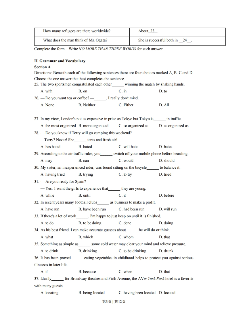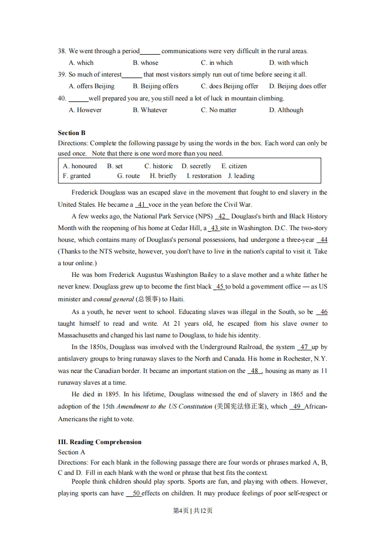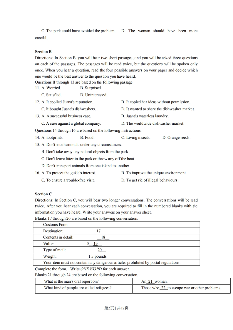 绝密★启用前2008年普通高等学校招生全国统一考试(上海卷)英语试卷(满分150分,考试时间100分钟)考生注意:1.考试时间120分钟,试卷满分150分。2.本考试设试卷和答题纸两部分。试卷分为第1卷(第1一12页)和第Ⅱ卷(第13页),全卷共13页。所有答题必须涂(选择题)或写(非选择题)在答题纸上,做在试卷上一律不得分。答题前,务必在答题纸上填写准考证号和姓名,并将核对后的条形码贴在指定位置上,在答题纸反而清楚地填写姓名。I.Listening ComprehensionSection ADirections:In Section A.you will hear ten short conversations between two speakers.At the endof each conversation,a question will be asked about what was said.The conversations and thequestions will be spoken only once.After you hear a conversation and the question about it,readthe four possible answers on your paper,and decide which one is the best answer to the questionyou have heard.I.A.This afternoon.B.Tomorrow.C.Next week.D.Next month.2.A.She doesn't play tennis well.B.She likes other sports as well.C.She is an enthusiastic tennis player.D.She is a professional athlete.3.A.At a paint store.B.At an oil marketC.At a science museum.D.At a gallery.4.A.Work in the yard.B.Buy some woodC.Go to the bookstore.D.Take a walk5.A.A.taxi driver.B.A passenger.C.A car cleaner.D.A mechanic.6.A.Call a repairmanB.Get out the paper stuckC.Turn to her colleague for help.D.Restart the machine7.A.There are not enough gardens.B.Parking areas are full before 10:00C.Parking areas are closed after 10:00.D.All classes begin at 10:00.8.A.The presentation will begin at noon.B.She'll present her work to the man.C.She'd like to invite the man for lunch.D.She suggests working on the presentationat12:00.9.A.The dormitory hours.B.The problem with the rules.C.The door number of the dormitory.D.The time to open the dormitory.10.A.The chairs didn't need to be paintedB.He doesn't like the color of the chairs.第1页1共12页C.The park could have avoided the problem.D.The woman should have been morecareful.Section BDirections:In Section B.you will hear two short passages,and you will be asked three questionson each of the passages.The passages will be read twice,but the questions will be spoken onlyonce.When you hear a question,read the four possible answers on your paper and decide whichone would be the best answer to the question you have heard.Questions II through 13 are based on the following passage11.A.Worried.B.Surprised.C.Satisfied.D.Uninterested.12.A.It spoiled Juana's reputation.B.It copied her ideas without permission.C.It bought Juana's dishwashersD.It wanted to share the dishwasher market.13.A.A successful business case.B.Juana's waterless laundry.C.A case against a global company.D.The worldwide dishwasher market.Questions 14 through 16 are based on the following instructions.14.A.footprints.B.Food.C.Living insects.D.Orange seeds.15.A.Don't touch animals under any circumstances.B.Don't take away any natural objects from the park.C.Don't leave litter in the park or throw any off the boat.D.Don't transport animals from one island to another.16.A.To protect the guide's interest.B.To improve the unique environment.C.To ensure a trouble-free visit.D.To get rid of illegal behaviours.Section CDirections:In Section C,you will bear two lo