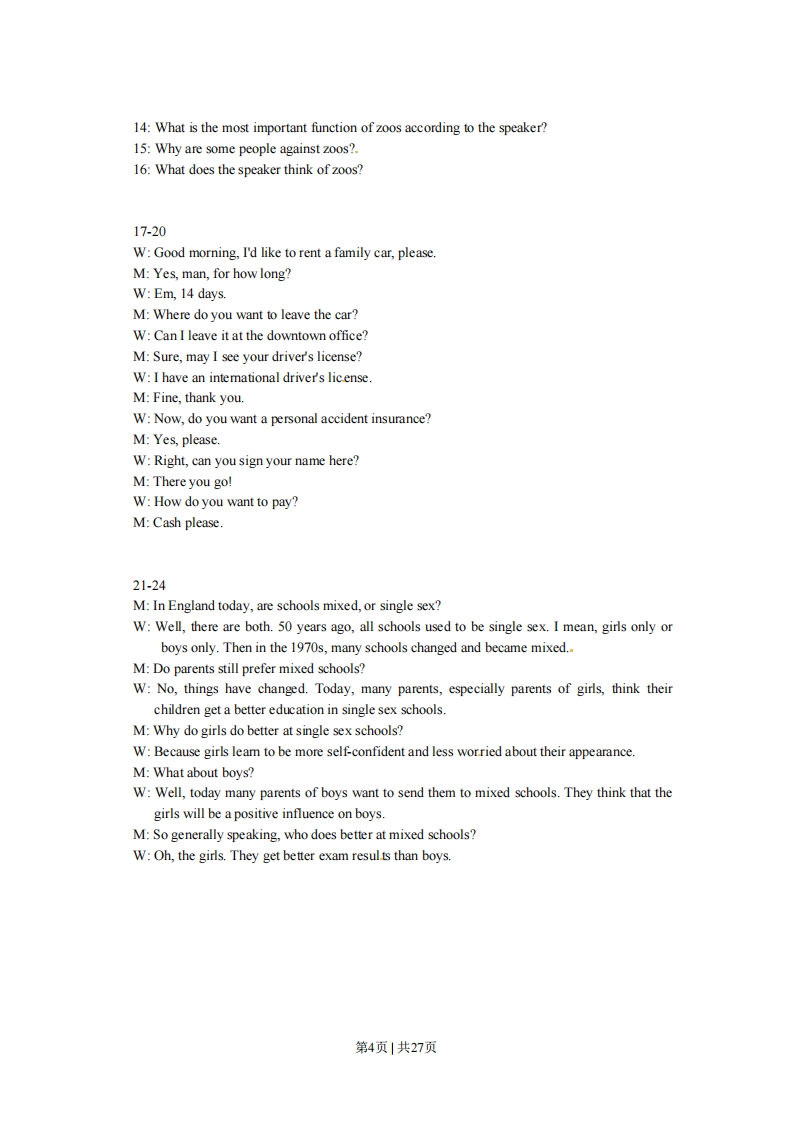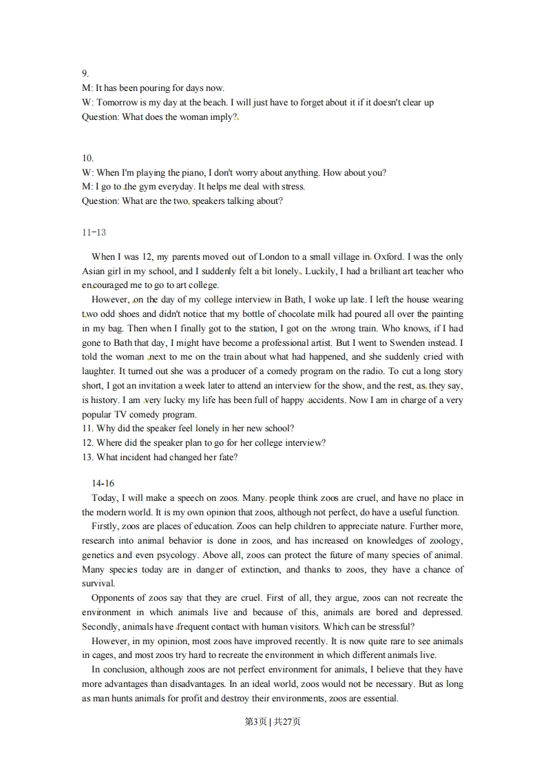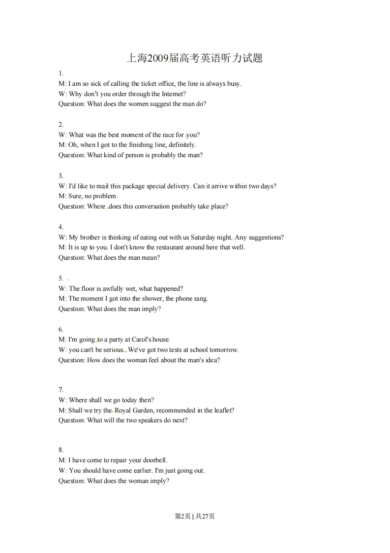 参考答案第一大题1-5 CBABD 6-10 DBDAC 11-15 CBABC 16 A17.Fourteen/14 18.downtown 19.personal 20.Cash 21.mixed22.more self-confident 23.a positive influence 24.exams第二大题25-29 ADCDB 30-34 BBACA 35-39 CBDDC 40-44 DCEAD 45-49 BHJFI第三大题50-54 ACDBB 55-59 DACCA 60-64 DBCDA 65-69 CBDDA70-74 BCBDA 75-79 BCABD 80-84 FDCBEL.翻译1.Tennis is getting more and more popular in Shanghai.2.I think your suggestion is as valuable as theirs.3.Thinking only a cup of coffee will keep me awake all night.4.A film will be made/shot in memory of those brave fire fighters.5.It was three days later that she remembered leaving/having left her raincoat in the languagelab.6.Despite the high mountains and thick forests,the doctors and nurses rushed to the scene of theaccident for the rescue/to carry out the rescue.Ⅱ.写作(略)第1页1共27页上海2009届高考英语听力试题1.M:I am so sick of calling the ticket office,the line is always busyW:Why don't you order through the Intemet?Question:What does the women suggest the man do?2.W:What was the best moment of the race for you?M:Oh,when I got to the finishing line,definitely.Question:What kind of person is probably the man?3.W:I'd like to mail this package special delivery.Can it arrive within two days?M:Sure,no problem.Question:Where does this conversation probably take place?4.W:My brother is thinking of eating out with us Saturday night.Any suggestions?M:It is up to you.I don't know the restaurant around here that well.Question:What does the man mean?5..W:The floor is awfully wet,what happened?M:The moment I got into the shower,the phone rang.Question:What does the man imply?6M:I'm going to a party at Carol's house.W:you can't be serious.We've got two tests at school tomorrow.Question:How does the woman feel about the man's idea?7.W:Where shall we go today then?M:Shall we try the.Royal Garden,recommended in the leaflet?Question:What will the two speakers do next?%M:I have come to repair your doorbell.W:You should have come earlier.I'm just going out.Question:What does the woman imply?第2页1共27页9.M:It has been pouring for days now.W:Tomorrow is my day at the beach.I will just have to forget about it if it doesn't clear upQuestion:What does the woman imply?.10.W:When I'm playing the piano,I don't worry about anything.How about you?M:I go to the gym everyday.It helps me deal with stress.Question:What are the two.speakers talking about?11-13When I was 12,my parents moved out of London to a small village in.Oxford.I was the onlyAsian girl in my school,and I suddenly felt a bit lonely.Luckily,I had a brilliant art teacher whoencouraged me to go to art college.However,on the day of my college interview in Bath,I woke up late.I left the house wearingtwo odd shoes and didn't notice that my bottle of chocolate milk had poured all over the paintingin my bag.Then when I finally got to the station,I got on the wrong train.Who knows,if I hadgone to Bath that day,I might have become a professional artist.But I went to Swenden instead.Itold the woman next to me on the train about wha