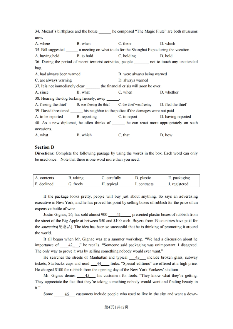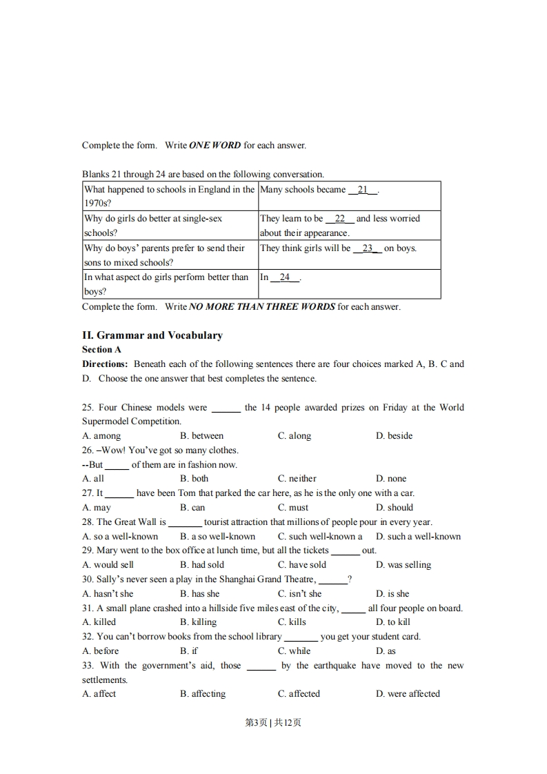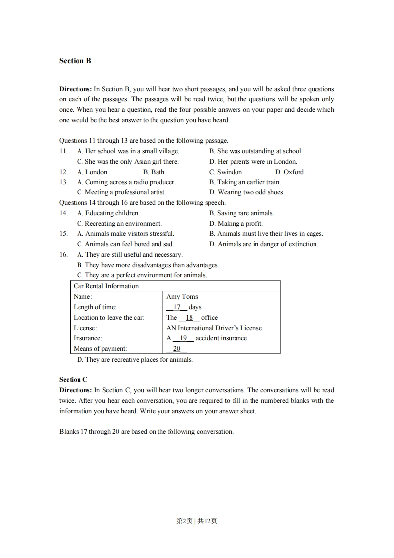 绝密★启用前2009年普通高等学校招生全国统一考试(上海卷)英语试卷(满分150分,考试时间100分钟)考生注意:1.考试时间120分钟,试卷满分150分。2.本考试设试卷和答题纸两部分。试卷分为第I卷(第1一12页)和第卷(第13页),全卷共13页。所有答题必须涂(选择题)或写(非选择题)在答题纸上,做在试卷上一律不得分。答题前,务必在答题纸上填写准考证号和姓名,并将核对后的条形码贴在指定位置上,在答题纸反而清楚地填写姓名。第I卷(共105分)I.Listening ComprehensionSection ADirections:In Section A,you will hear ten short conversations between two speakers.At theend of each conversation,a question will be asked about what was said.The conversations and thequestions will be spoken only once.After you hear a conversation and the question about it,readthe four possible answers on your paper,and decide which one is the best answer to the questionyou have heard.1.A.Go to the officeB.Keep callingC.Try online booking D.See a doctor2.A.A reporterB.An athleteC.A fishermanD.An organizer3.A.At a post officeB.At a fast-food restaurantC.At a booking officeD.At a check-in desk4.A.He already has plansB.The woman should decide where to eat.C.He will make a reservation.D.The woman can ask her brother for advice5.A.He got wet in the rain.B.The shower was out of order.C.He didn't hear the phone ringing.D.He got out of the shower to answer the phone6.A.ReasonableB.BrightC.SeriousD.Ridiculous7.A.Send leafletsB.Go sightseeingC.Do some gardening D.Visit a lawyer8.A.Her doorbell doesn't need repair.B.She didn't expect him to come so earlyC.The man has just arrived on time.D.It is not the right time for her.9.A.She won't go to the beach if it rains.B.She would like the man to go to the beach.C.It will clear up tomorrow.D.It was pouring when she was at the beach.10.A.What to take up as a hobby.B.How to keep fit.C.How to handle pressure.D.What to play with.第1页1共12页Section BDirections:In Section B,you will hear two short passages,and you will be asked three questionson each of the passages.The passages will be read twice,but the questions will be spoken onlyonce.When you hear a question,read the four possible answers on your paper and decide whichone would be the best answer to the question you have heard.Questions 11 through 13 are based on the following passage.11.A.Her school was in a small village.B.She was outstanding at school.C.She was the only Asian girl there.D.Her parents were in London.12.A.LondonB.BathC.SwindonD.Oxford13.A.Coming across a radio producer.B.Taking an earlier train.C.Meeting a professional artist.D.Wearing two odd shoes.Questions 14 through 16 are based on the following speech.14.A.Educating children.B.Saving rare animals.C.Recreating an environment.D.Making a profit.15.A.Animals make visitors stressful.B.Animals must live their lives in cages.C.Animals can feel bored and sad.D.Animals are in danger of extinction.16.A.They are still useful and necessary.B.They have more disadvantages than advantages.C.They are a perfect environment for animals.Car Rental InformationName:Amy TomsLength of time:17 daysLocation to leave the car:The 18 officeLicense:AN International Driver's LicenseInsurance:A 19 accident insuranceMeans of payment:20D.They are recreative places for ani