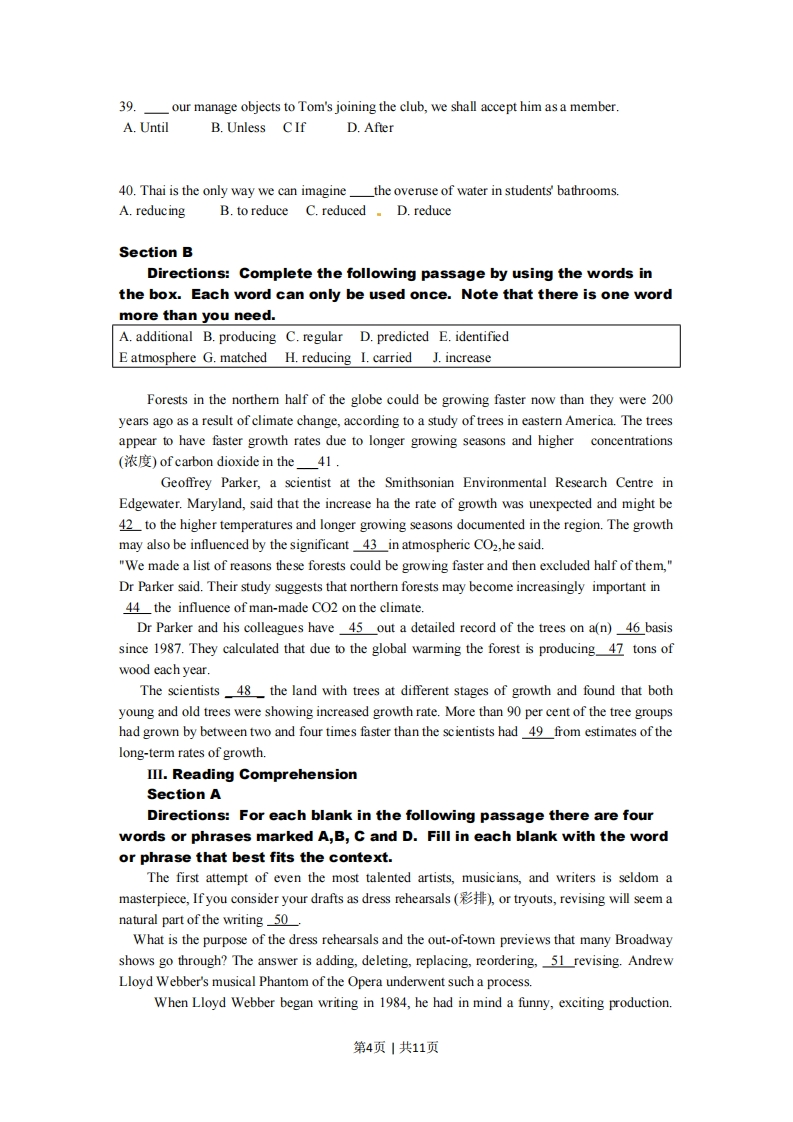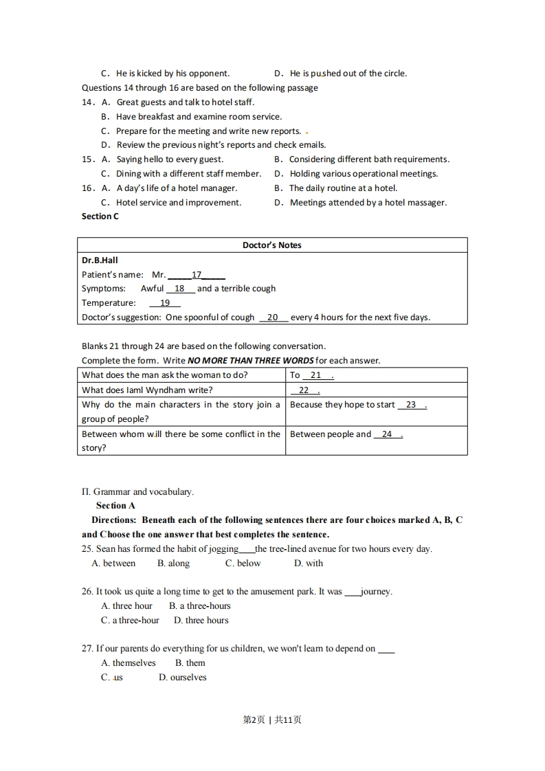 绝密★启用前2010年普通高等学校招生全国统一考试(上海卷)英语试卷(满分150分,考试时间100分钟)考生注意:1.考试时间120分钟,试卷满分150分。2.本考试设试卷和答题纸两部分。试卷分为第1卷(第1一12页)和第卷(第13页),全卷共13页。所有答题必须涂(选择题)或写(非选择题)在答题纸上,做在试卷上一律不得分。答题前,务必在答题纸上填写准考证号和姓名,并将核对后的条形码贴在指定位置上,在答题纸反而清楚地填写姓名。第一卷(共105分)I.Listening ComprehensionSection A1.A.A shop assistant..B.A dentistC.An cloarician.D.A bank clerk.2.A.The exam score..B.The world news.C.A soccer match..D.A basketball team.3.A.At a post office.B.At a flower shop.C.At a department store.D.At a bus station.4.A.5 hours.B.7 hours.C.9 hours.D.10 hours.5.A.Tim's not seriously injured.B..Tim will get to the hospital quickly.C.The woman's heard all about Tim's i.llness.D.The woman doesn't know how Tim is now.6.A.She isn't in the mood to travel.B.France is too far for family holiday.C.Family holiday no longer interests her.D.She has had too many holidays this year.7.A.The cost was reasonableB.The cost was unbelievably high.C.She likes the hotel.D.She will stay overnight.8.A.Disappointment B.Disapproval.C.Sympathy.D.Passion9.A.The man is too forgetful.B.The man shouldn't get annoyed.C.The man has too many keysD.The man should attend more lessons.10.A.He wants to live in apartments.B.He thinks his signature is unnecessary.C.He has already signed a contract.D.He does.n't always say what he means.Section B11.A.White masters.B.African slaves.C.Native dancers.D.Sporttrainers.12.A.Having kung fu experience.B.Being able to sing and play music.C.Wearing a green belt.D.Being strong and able to balance well.13.A.He uses his hands to keep the balance.B.He dos-es contact with his opponent.第1页|共11页C.He is kicked by his opponent.D.He is pushed out of the circle.Questions 14 through 16 are based on the following passage14.A.Great guests and talk to hotel staff.B.Have breakfast and examine room service.C.Prepare for the meeting and write new reports..D.Review the previous night's reports and check emails.15.A.Saying hello to every guest.B.Considering different bath requirements.C.Dining with a different staff member.D.Holding various operational meetings.16.A.A day's life of a hotel manager.B.The daily routine at a hotel.C.Hotel service and improvement.D.Meetings attended by a hotel massager.SectionCDoctor's NotesDr.B.HalIPatient's name:Mr.17Symptoms:Awful 18 and a terrible coughTemperature:19Doctor's suggestion:One spoonful of cough 20 every 4 hours for the next five days.Blanks 21 through 24 are based on the following conversation.Complete the form.Write NO MORE THAN THREE WORDS for each answer.What does the man ask the woman to do?T021.What does laml Wyndham write?22Why do the main characters in the story join aBecause they hope to start 23.group of people?Between whom will there be some conflict in theBetween people and24story?II.Grammar and vocabulary.SectionADirections:Beneath each of the following sentences there are four choices marked A,B,Cand Choose the one answer that best completes the sentence.25.Sean has formed the habit of jogging_the tree-lined avenue for two hours every day.A.between