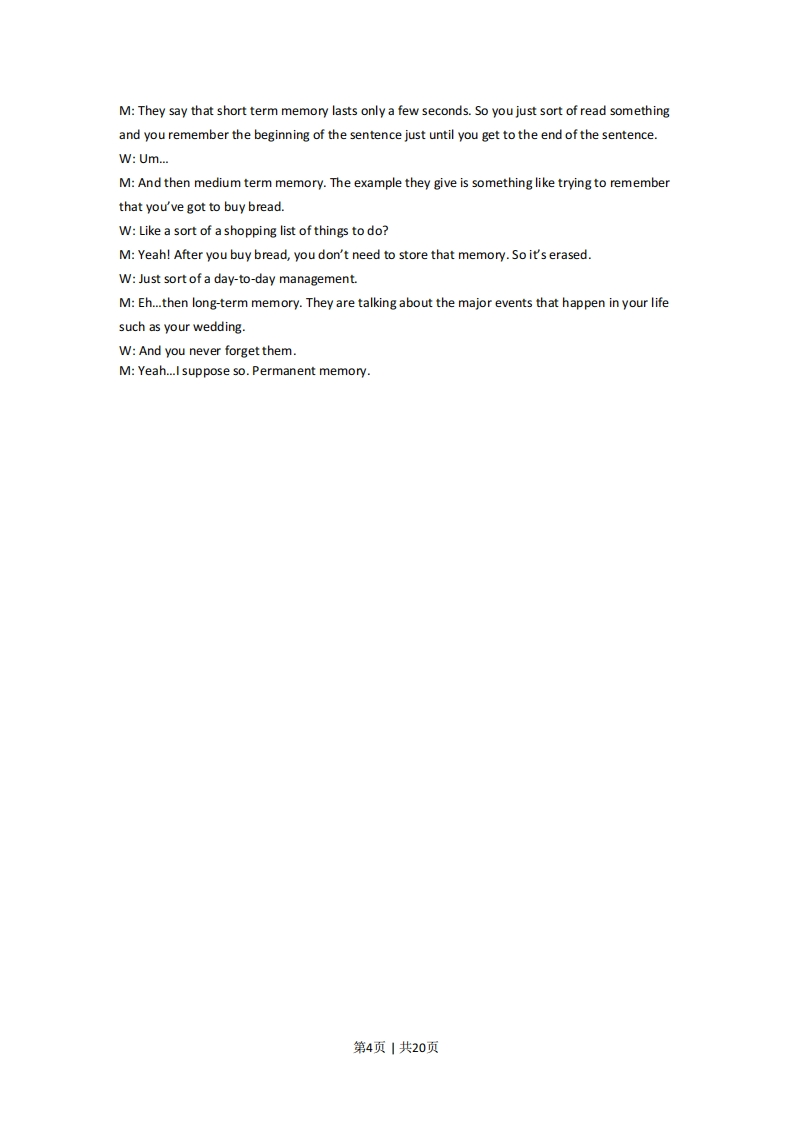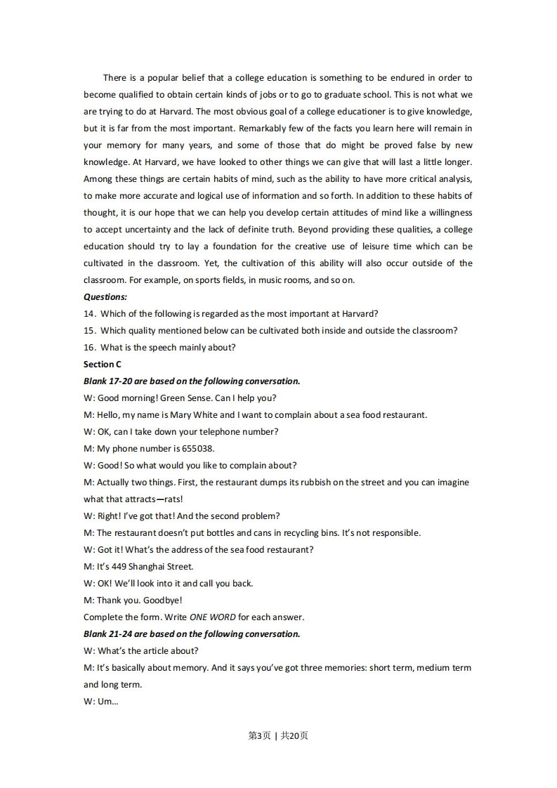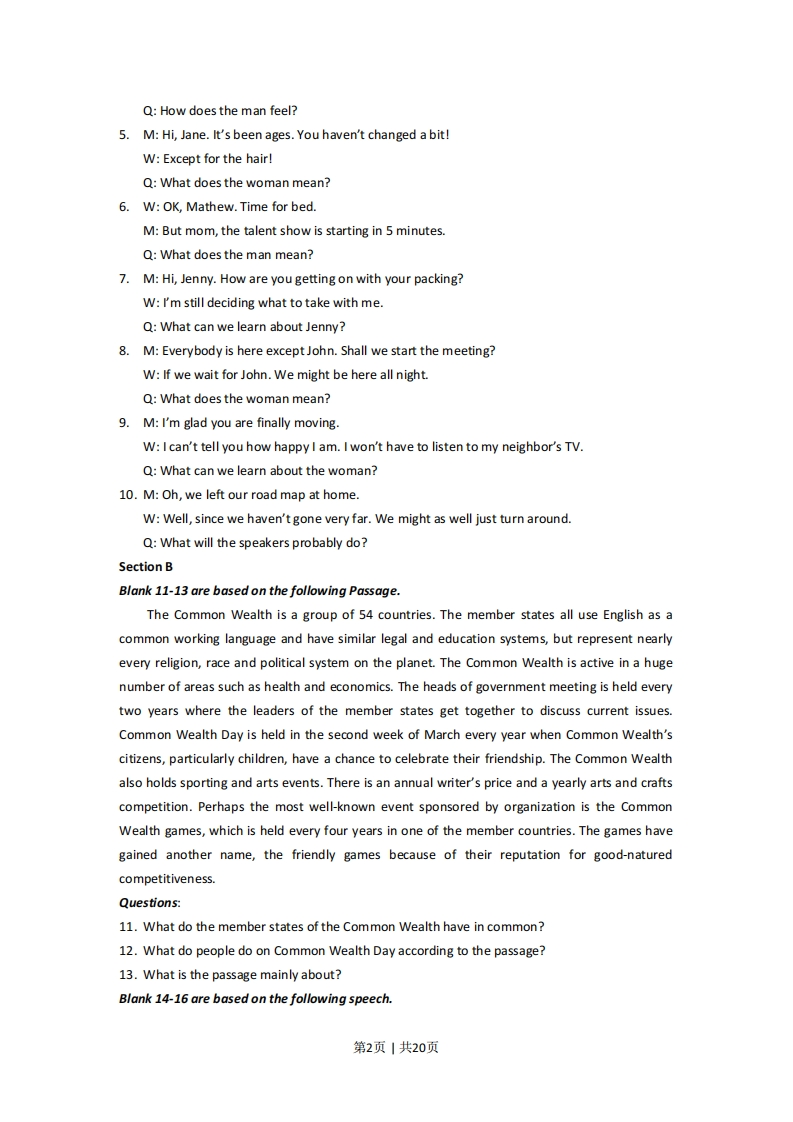 绝密★启用前2011年普通高等学校招生全国统一考试(上海卷)英语试卷参考答案01-05.BAABA06-10.CDCDC11-13.CDD14-16.CBA17.65503818.seafood19.rubbish20.recycling21.a few seconds 22.a shopping list23.Major events24.is permanent25-29.ADBDC30-34.BBACA35-40.DDCDAB41-45.BIHCA46-49.FGJE50-54.BCBDA55-59.CDCAB60-64.BCCDB65-68.DAAB69-71.BAA72-75.BCDD76-80.BEFCD81.An organization of more than 200 individuals.82.Structuring smaller organizations and building direct personal relationships.83.seemed to be more difficult less satisfying84.the close social networks the free flow of information the causal communication1.Why not /Why don't you book tickets online /reserve the ticket(s)on the Internet?2.I often mistake Wang Hai for his twin brother because they look so similar very muchalike3.As for parents,nothing can be compared with their children's physical and mental health.4.No longer has she kept in touch with us since she went abroad for further study/education.5.If you can find whatever learning method (that)suits you,your study/learning efficiency islikely to improve remarkably.Listening ComprehensionSection A1.W:It's nice of you to come here to pick me up,Mr.SmithM:Don't mention it.How was the flight?Q:Where does the conversation most probably take place?2.W:I wonder if there is a service charge for our meal.M:I think so.The menu said the service charge is 10%.Q:How much is the service charge if the food costs 50 dollars?3.M:Here is your room key and the checkout time is 12 noon.W:Thanks for reminding me.Q:What is the most probable relationship between the two speakers?4.W:Sorry,sir.We are working on your order right now and we'll be delivering it soon.M:Soon?How soon is soon?第1页|共20页Q:How does the man feel?5.M:Hi,Jane.It's been ages.You haven't changed a bit!W:Except for the hair!Q:What does the woman mean?6.W:OK,Mathew.Time for bed.M:But mom,the talent show is starting in 5 minutes.Q:What does the man mean?7.M:Hi,Jenny.How are you getting on with your packing?W:I'm still deciding what to take with me.Q:What can we learn about Jenny?8.M:Everybody is here except John.Shall we start the meeting?W:If we wait for John.We might be here all night.Q:What does the woman mean?9.M:I'm glad you are finally moving.W:I can't tell you how happy I am.I won't have to listen to my neighbor's TV.Q:What can we learn about the woman?10.M:Oh,we left our road map at home.W:Well,since we haven't gone very far.We might as well just turn around.Q:What will the speakers probably do?Section BBlank 11-13 are based on the following Passage.The Common Wealth is a group of 54 countries.The member states all use English as acommon working language and have similar legal and education systems,but represent nearlyevery religion,race and political system on the planet.The Common Wealth is active in a hugenumber of areas such as health and economics.The heads of government meeting is held everytwo years where the leaders of the member states get together to discuss current issues.Common Wealth Day is held in the second week of M