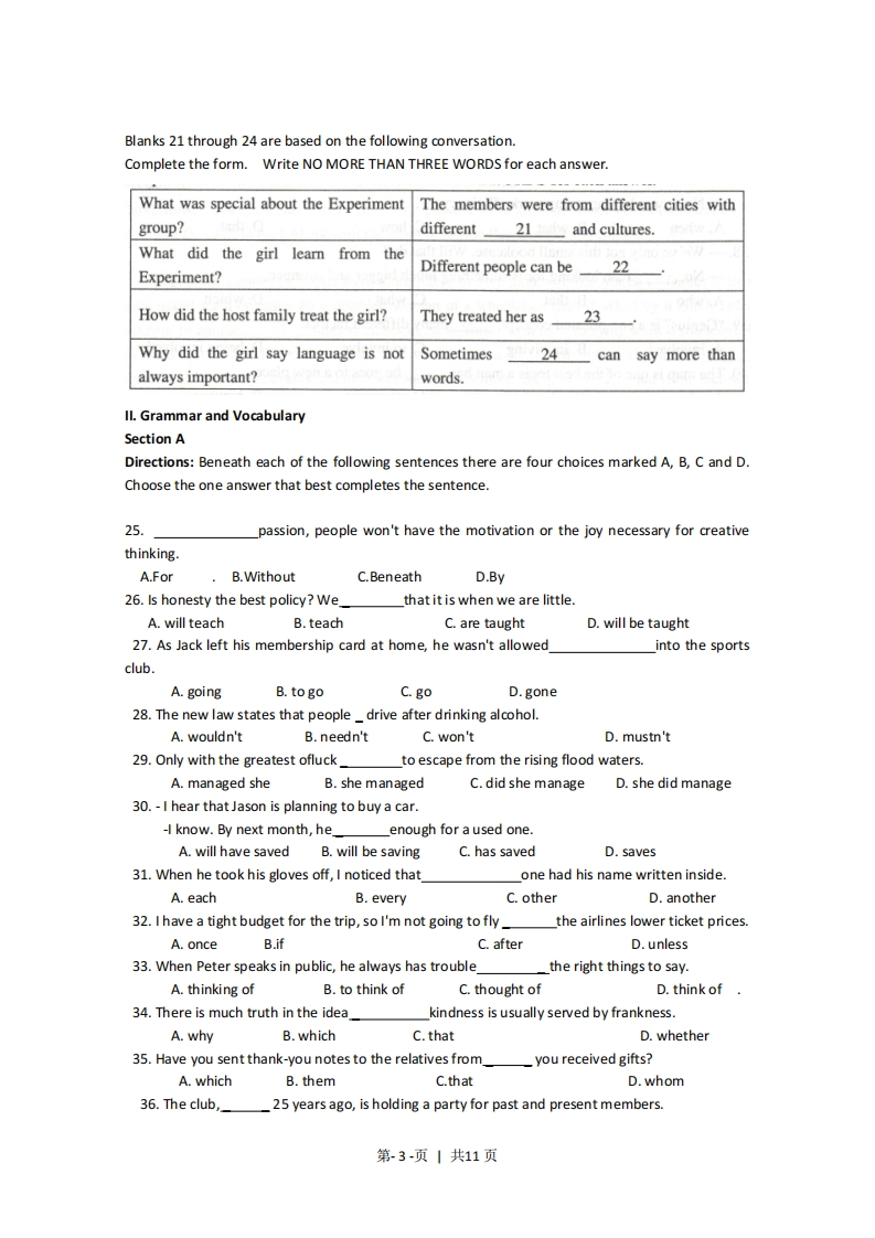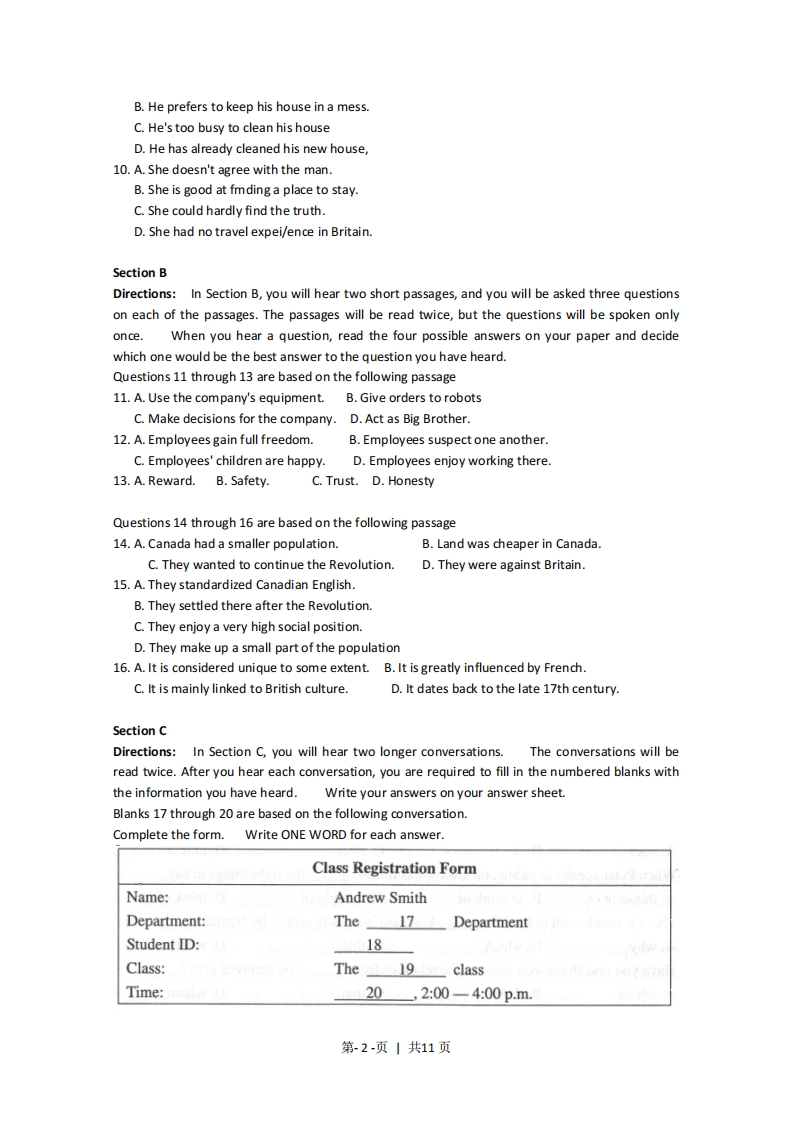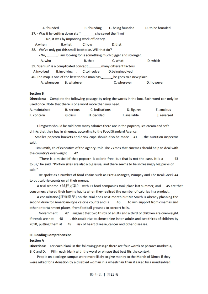 绝密★启用前2012年普通高等学校招生全国统一考试(上海卷)英语试卷(满分150分,考试时间100分钟)考生注意:1.考试时间120分钟,试卷满分150分。2.本考试设试卷和答题纸两部分。试卷分为第1卷(第1一12页)和第Ⅱ卷(第13页),全卷共13页。所有答题必须涂(选择题)或写(非选择题)在答题纸上,做在试卷上一律不得分。答题前,务必在答题纸上填写准考证号和姓名,并将核对后的条形码贴在指定位置上,在答题纸反而清楚地填写姓名。第1卷(共105分)I.Listening ComprehensionSection ADirections:In Section A,you will hear ten short conversations between two speakers.At theend of each conversation,a question will be asked about what was said.The conversations andthe questions will be spoken only once.After you hear a conversation and the question about itread the four possible answers on your paper,and decide which one is the best answer to thequestion you have heard.1.A.At a library.B.Ata hotel.C.At a bank.D.At an airport.2.A.Relaxed.B.Annoyed.C.Worried.D.Satisfied3.A.Doctor and patient.B.Shop owner and customer.C.Secretary and boss.D.Receptionist and guest.4.A.He would have thrown S300 around.B.$300 is not enough for the concert.C.Sandy shouldn't have given that much.D.Dave must be mad with the money5.A.She lives close to the man.B.She changes her mind at last.C.She will turn to her manager.D.She declines the man's offer.6.A.2B.3.C.4.D.57.A.Both of them drink too much coffee.B.The woman doesn't Like coffee at allC.They help each other stop drinking coffee.D.The man is uninterested in the woman's story8.A.He doesn't.mind helping the woman.B.He hesitates whether to help or not.C.He'll help if the woman doesn't mindD.He can't help move the cupboard.9.A.He's planning to find a new job.第1-页1共11页B.He prefers to keep his house in a mess.C.He's too busy to clean his houseD.He has already cleaned his new house,10.A.She doesn't agree with the man.B.She is good at fmding a place to stay.C.She could hardly find the truth.D.She had no travel expei/ence in Britain.Section BDirections:In Section B,you will hear two short passages,and you will be asked three questionson each of the passages.The passages will be read twice,but the questions will be spoken onlyonce.When you hear a question,read the four possible answers on your paper and decidewhich one would be the best answer to the question you have heard.Questions 11 through 13 are based on the following passage11.A.Use the company's equipment.B.Give orders to robotsC.Make decisions for the company.D.Act as Big Brother.12.A.Employees gain full freedom.B.Employees suspect one another.C.Employees'children are happy.D.Employees enjoy working there.13.A.Reward.B.Safety.C.Trust.D.HonestyQuestions 14 through 16 are based on the following passage14.A.Canada had a smaller population.B.Land was cheaper in Canada.C.They wanted to continue the Revolution.D.They were against Britain.15.A.They standardized Canadian English.B.They settled there after the Revolution.C.They enjoy a very high social position.D.They make up a small part of the population16.A.It is considered unique to some extent.B.It is greatly influenced by French.C.It is mainly linked to British culture.D.It dates back to the late 17th century.Section CDirections:In Section C,you wi