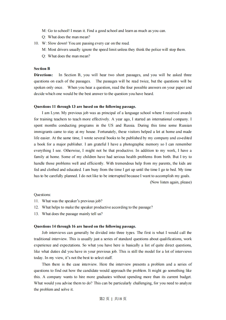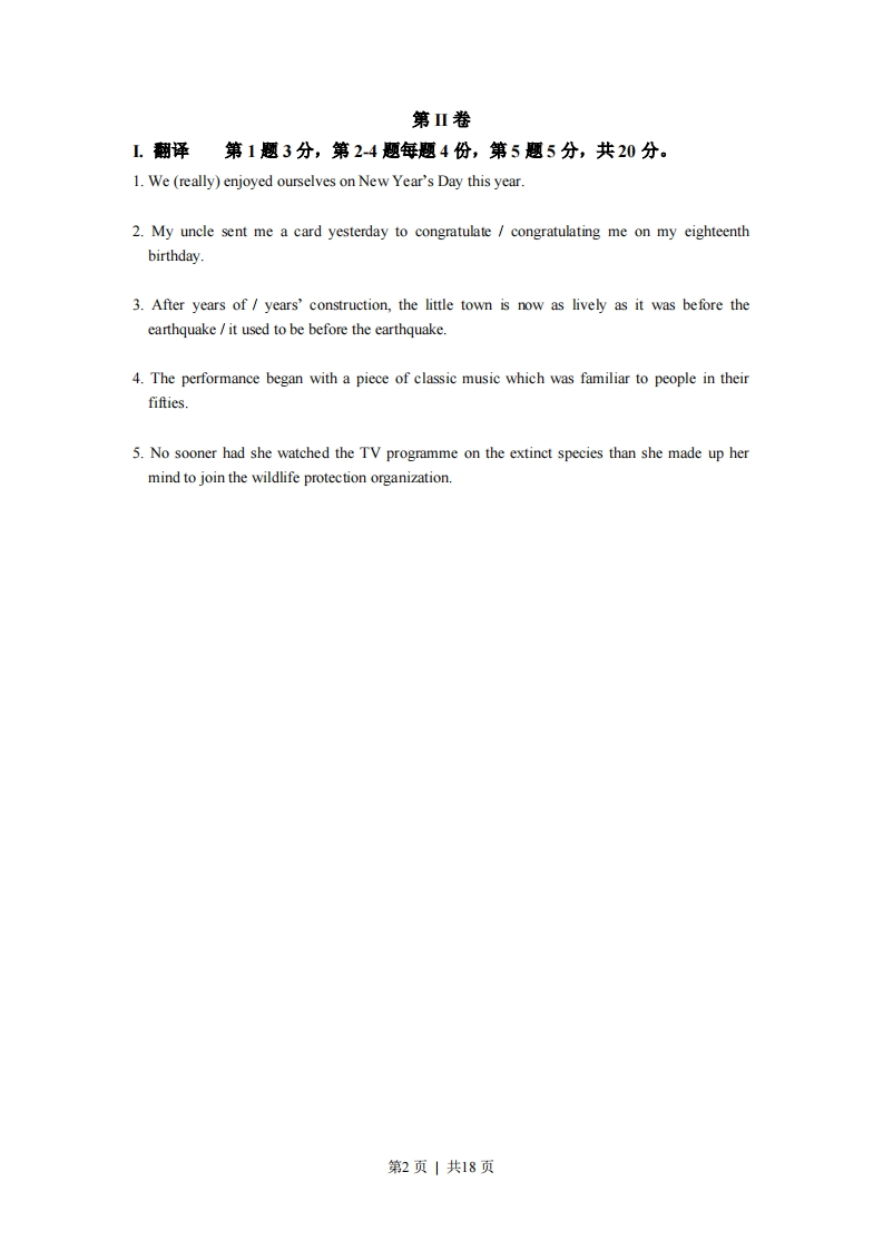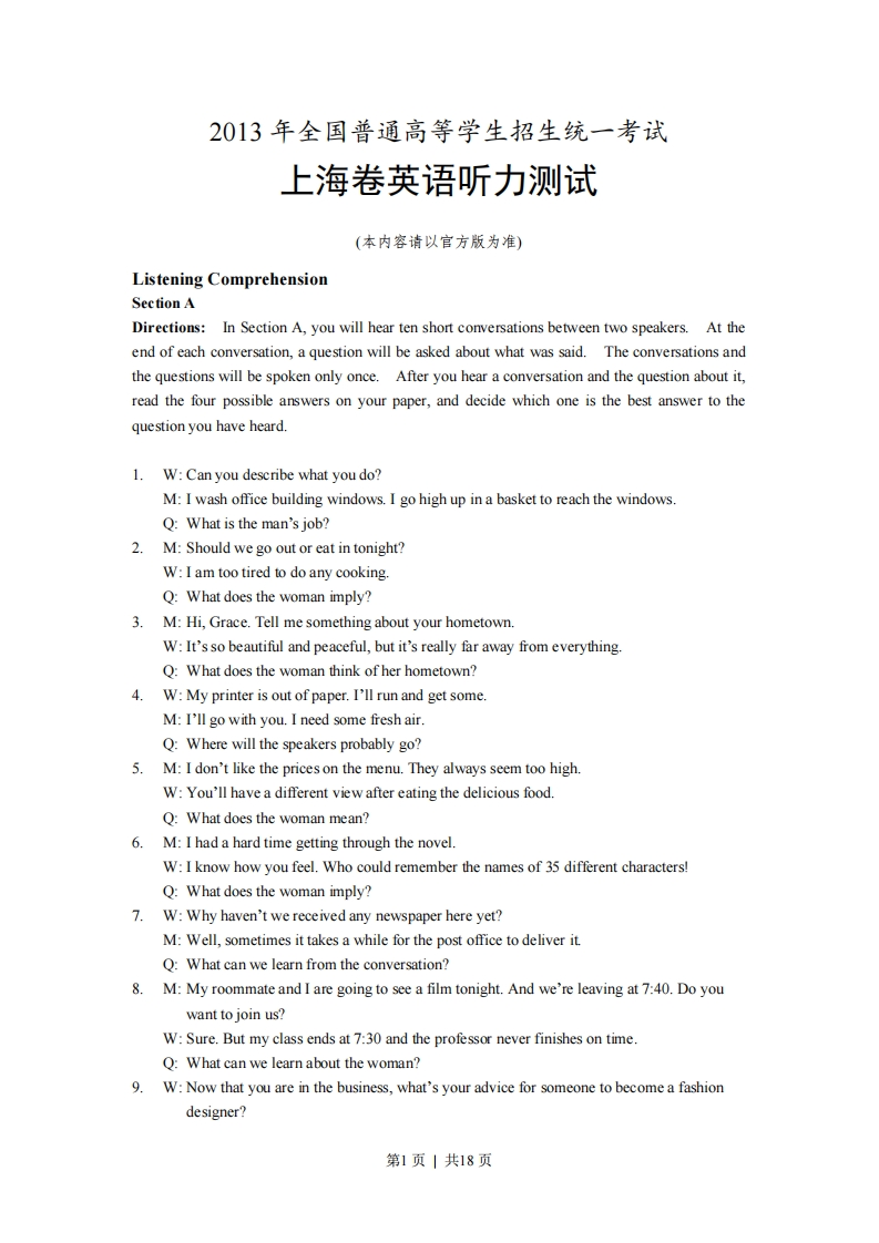 2013年全国普通高等学校招生统一考试上海英语参考答案第I卷第一大题第1至第10小题,每题1分,第11至第16小题,每题2分,第17至第24小题,每题1分。共30分。1.C2.D3.B4.A5.D6.B7.C8.A9.B10.A11.D12.D13.B14.B15.C16.A17.November/Nov.18.Centre /Center19.85020.African21.with good grades 22.sit still23.plan /create PE classes24.new tricks第二大题每小题1分。共25分。25.C26.C27.A28.D29.C30.C31.D32.B33.B34.C35.A36.D37.D38.A39.A40.B41.J42.H43.B44.E45.F46.147.D48.G49.C第三大题第50至64小题,每题1分;第65至75小题,每题2分;第76至80小题,每题1分:第81至84小题,每题2分。共50分。50.C51.B52.A53.D54.C55.B56.C57.D58.B59.A60.C61.B62.A63.D64.D65.A66.C67.A68.B69.D70.B71.C72.C73.B74.D75.C76.C77.B78.F79.A80.E81.in the category of fear82.the literary position has changed in a crowded media landscape /other media-movies,radio,drama-had more emotional content83.During the Roaring Twenties and before the recent financial crash.84.their research result reflected wider social trends songs and books reflected the realpopulation第1页|共18页第Ⅱ卷1.翻译第1题3分,第2-4题每题4份,第5题5分,共20分。1.We (really)enjoyed ourselves on New Year's Day this year.2.My uncle sent me a card yesterday to congratulate congratulating me on my eighteenthbirthday.3.After years of years'construction,the little town is now as lively as it was before theearthquake it used to be before the earthquake.4.The performance began with a piece of classic music which was familiar to people in theirfifties.5.No sooner had she watched the TV programme on the extinct species than she made up hermind to join the wildlife protection organization.第2页|共18页2013年全国普通高等学生招生统一考试上海卷英语听力测试(本内容请以官方版为准)Listening ComprehensionSectionADirections:In Section A,you will hear ten short conversations between two speakers.At theend of each conversation,a question will be asked about what was said.The conversations andthe questions will be spoken only once.After you hear a conversation and the question about it,read the four possible answers on your paper,and decide which one is the best answer to thequestion you have heard.1.W:Can you describe what you do?M:I wash office building windows.I go high up in a basket to reach the windowsQ:What is the man's job?2.M:Should we go out or eat in tonight?W:I am too tired to do any cooking.Q:What does the woman imply?3.M:Hi,Grace.Tell me something about your hometown.W:It's so beautiful and peaceful,but it's really far away from everything.Q:What does the woman think of her hometown?4.W:My printer is out of paper.I'll run and get some.M:I'll go with you.I need some fresh air.Q:Where will the speakers probably go?5.M:I don't like the prices on the menu.They always seem too high.W:You'll have a different view after eating the delicious food.Q:What does the woman mean?6.M:I had a hard time getting through the novel.W:I know how you feel.Who could remember the names of 35 different characters!Q:What does the woman imply?7.W:Why haven't we received any newspaper here yet?M:Well,sometimes it takes a while for the post office to deliver it.Q:What can we learn from the conversation?8.M:My roommate and I are going to see a film tonight.And we're leaving a