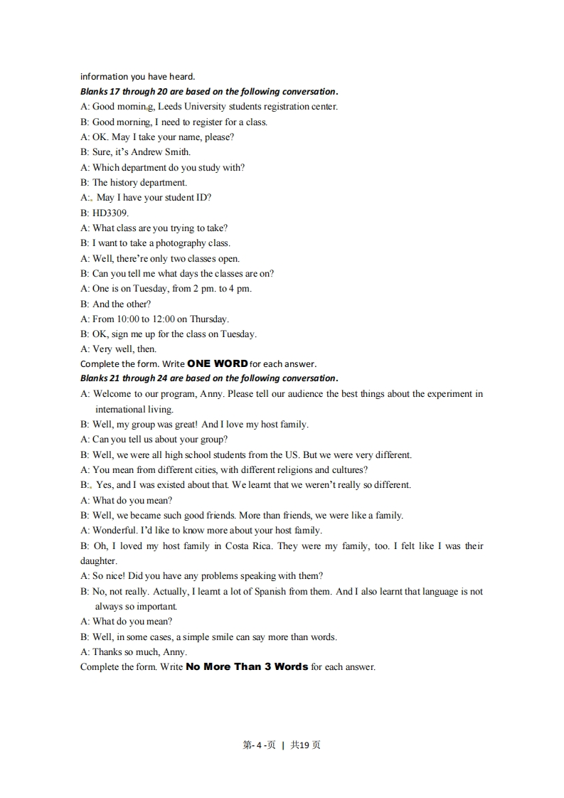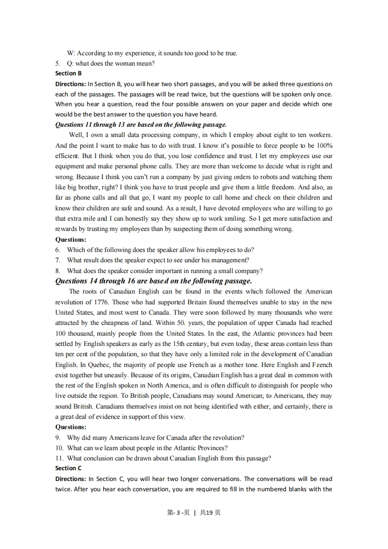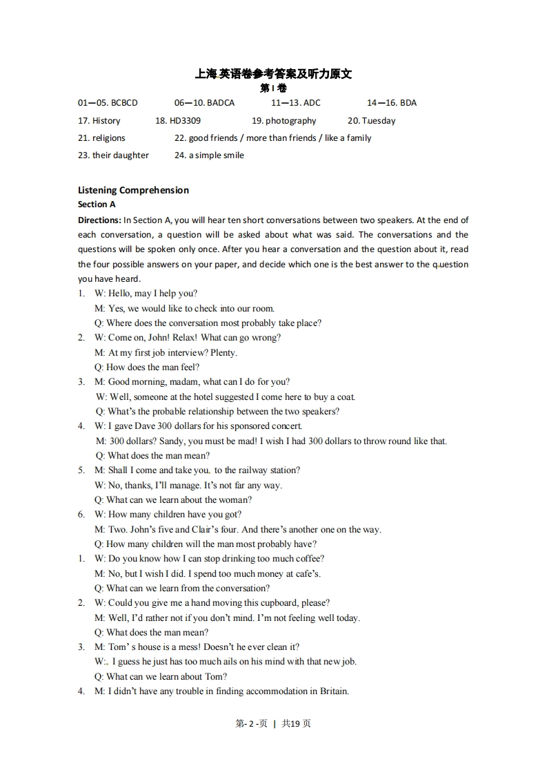 上海英语英语参考第1卷第一大题第1至第10小题,每题1分:第11至第16小题,每题2分:第17至第24小题,每题1分。共30分。1B2.C3.B4.C5.D6.B7A8.D9.c10.A11.A12.D13.C14.B15.D16.A17.History18.HD330919.photography20.Tuesday21.religions 22.good friends/more than friends/like a family23.their daughter 24.a simple smile第二大题每小题1分。共25分。25.B26.C27.B28.D29.C30.A31.A32.D33.A34.C35.D36.A37.D38.C39.B40A41.142.G43.F44.H45.C46.E47.D48.J49.B第三大题50至64小题,每题1分:第65至75小题,每题2分:第76至80小题,每题1分:第81至84小题,每题2分。共50分。50.A51.C52.D53.C54.A55.B56.D57.B58.B59.A60.A61.B62.C63.D64.D65.B66.B67.C68.D69.D70.A71.C72.C73.D74.C75.A76.F77.A78.E79.D80.C81.younger children and adults82.school reform efforts and the changes in population83.In early adolescence84.They have less close supervision of parents./They manage to escape adult supervision./Theyare increasingly autonomous.第川卷.翻译共20分1.She began to play the violin five years ago.2.Owing to bad weather,the flight was delayed for a couple of hours.3.Every designer hopes that his work can stand the test of time.4.It is a difficult problem for high school students whether they can resist the temptation ofonline games.5.At the exhibition,the company's sales manager demonstrated the new type of electronic toys(which/that)children were looking forward to.第1-页1共19页上海英语卷参考答案及听力原文第1卷01-05.BCBCD06-10.BADCA11-13.ADC14-16.BDA17.History18.HD330919.photography20.Tuesday21.religions22.good friends more than friends like a family23.their daughter24.a simple smileListening ComprehensionSection ADirections:In Section A,you will hear ten short conversations between two speakers.At the end ofeach conversation,a question will be asked about what was said.The conversations and thequestions will be spoken only once.After you hear a conversation and the question about it,readthe four possible answers on your paper,and decide which one is the best answer to the q-uestionyou have heard.1.W:Hello,may I help you?M:Yes,we would like to check into our room.Q:Where does the conversation most probably take place?2.W:Come on,John!Relax!What can go wrong?M:At my first job interview?Plenty.Q:How does the man feel?3.M:Good morning,madam,what can I do for you?W:Well,someone at the hotel suggested I come here to buy a coat.Q:What's the probable relationship between the two speakers?4.W:I gave Dave 300 dollars for his sponsored concert.M:300 dollars?Sandy,you must be mad!I wish I had 300 dollars to throw round like that.Q:What does the man mean?5.M:Shall I come and take you.to the railway station?W:No,thanks,I'll manage.It's not far any way.Q:What can we learn about the woman?6.W:How many children have you got?M:Two.John's five and Clair's four.And there's another one on the way.Q:How many children will the man most probably have?1.W:Do you know how I can stop drinking too much coffee?M:No,but I wish I did.I spend too much money at cafe's.Q:What can we learn from the conversation?2.W:Could you give me a hand moving this cupboard,please?M:Well,I'd rather not if you don't mind.I'm not feeling well todayQ:What does the man mean?3.M:Tom's