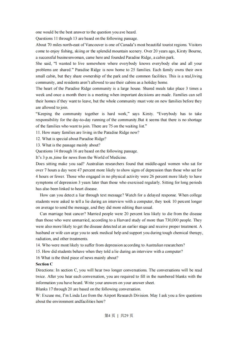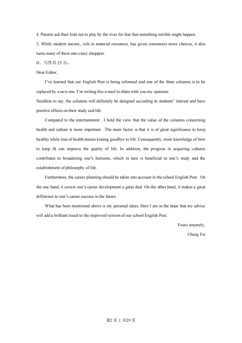 2014年上海英语参考答案第I卷第一大题第1至第10小题,每题1分:第11至第16小题,每题2分:第17至第24小题,每题1分。共30分。1.A2.D3.B4.A5.B6.D7.A8.c9.c10.B11.C12.D13.B14.C15.A16.B17.conference18.daylight19.moving20.overcrowded21.implications and conclusions 22.reasoning 23.Figures 24.keep questioning第二大题每小题1分。共26分.25.where26.To earn27.as soon asas long as28.exhausted29.if30.what31.adapting 32.did33.an34.is equipped 35.which36.myself37.more appropriate38.has forced39.urging40.to41.G42.C43.144.F45.E46.B47.K48.J49.A50.H第三大题第51至65小题,每题1分:第“至”小题,每题2分:第78至81小题,每题2分。共47分。51.C52.B53.A54.D55.A56.B57.C58.D59.A60.C61.D62.D63.B64.B65.C66.D67.B68.A69.A70.C71.D72.B73.A74.B75.A76.D77.C78.shareholders and employees79.Companies talk to non-governmental organisations(NGOs)and to govemments./Companiescreate codes of conduct./Companies devote themselves to more transparency in their operations./Companies set common rules with their competitors to spread risks.80.create value81.take social responsibilities第Ⅱ卷I1.翻译共22分。1.I'm accustomed to listening to some light music before sleep.2.It's up to you what kind of life you will lead in the future.3.There is nothing more exciting than being allowed to take part in the space travel program.第1页|共29页4.Parents ask their kids not to play by the river for fear that something terrible might happen.5.While modem society,rich in material resources,has given consumers more choices,it alsoturns many of them into crazy shoppersⅡ.写作共25分。Dear Editor,I've learned that our English Post is being reformed and one of the three columns is to bereplaced by a new one.I'm writing this e-mail to share with you my opinions.Needless to say,the columns will definitely be designed according to students'interest and havepositive effects on their study and lifeCompared to the entertainment,I hold the view that the value of the columns concerninghealth and culture is more important.The main factor is that it is of great significance to keephealthy while loss of health means kissing goodbye to life.Consequently,more knowledge of howto keep fit can improve the quality of life.In addition,the progress in acquiring culturescontributes to broadening one's horizons,which in turn is beneficial to one's study and theestablishment of philosophy of life.Furthermore,the career planning should be taken into account in the school English Post.Onthe one hand,it covers one's career development a great deal .On the other hand,it makes a greatdifference to one's career success in the future.What has been mentioned above is my personal ideas.Here I am in the hope that my advicewill add a brilliant touch to the improved version of our school English Post.Yours sincerely,Cheng Fei第2页|共29页2014年上海英语高考听力原文I.Listening ComprehensionSectionADirections:In section A,you will hear ten short conversations between two speakers.At the endof each conversation,a question will be asked about what was said.The conversation and thequestion will be spoken only once.After you hear a conversation and the question about it,readthe four possible an
