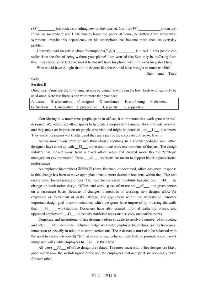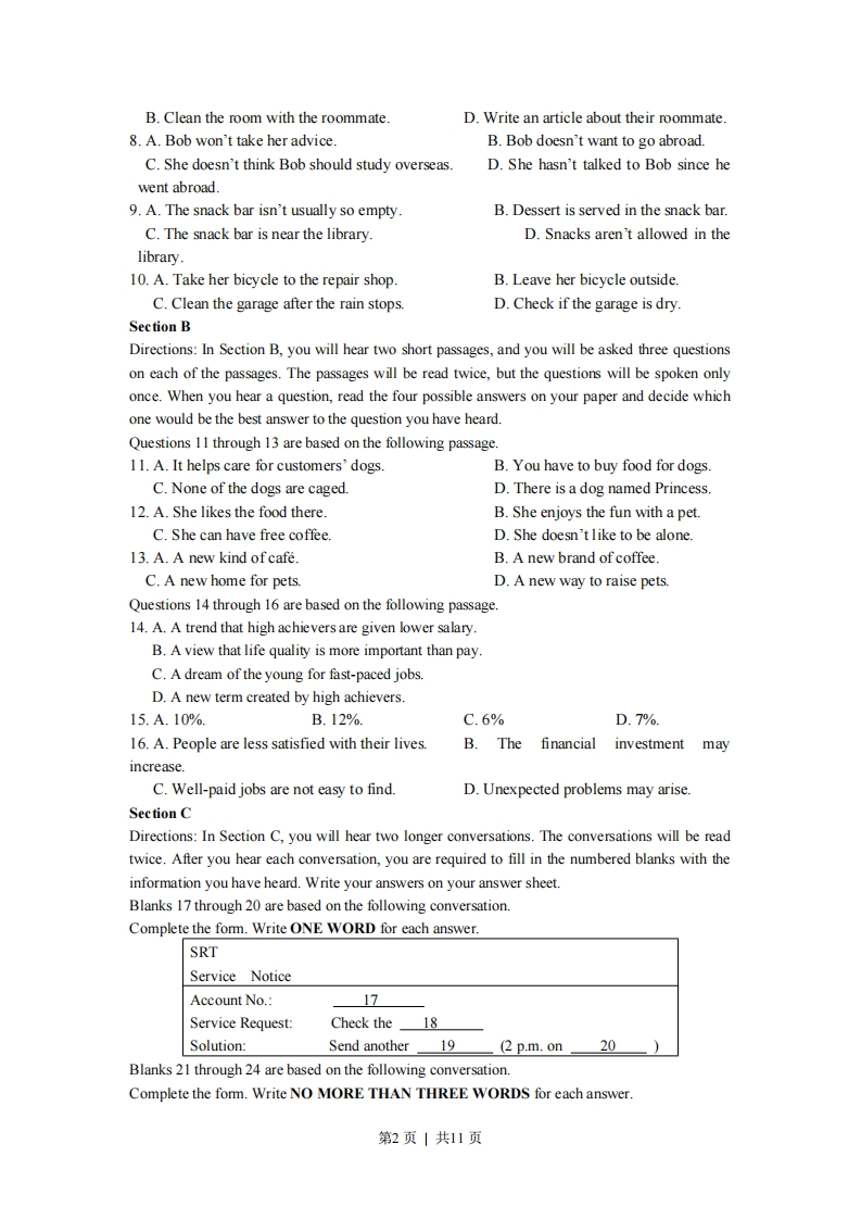 绝密★启用前2015年普通高等学校招生全国统一考试(上海卷)英语试卷(满分150分,考试时间100分钟)考生注意:1.考试时间120分钟,试卷满分150分。2.本考试设试卷和答题纸两部分。试卷分为第I卷(第1一12页)和第Ⅱ卷(第13页),全卷共13页。所有答题必须涂(选择题)或写(非选择题)在答题纸上,做在试卷上一律不得分。答题前,务必在答题纸上填写准考证号和姓名,并将核对后的条形码贴在指定位置上,在答题纸反而清楚地填写姓名。第I卷(共103分)I.Listening ComprehensionSection ADirections:In Section A,you will hear ten short conversations between two speakers.At theend ofeachconversation,a question will be asked about what was said.The conversations and thequestions will bespoken only once.After you hear a conversation and the question about it,read the fourpossible answerson your paper,and decide which one is the best answer to the question you have heard.1.A.Impatient.B.ConfusedC.Pleased.D.Regretful.2.A.At a bus stop.B.At a laundry.C.At the dentist's.D.Atthe chemist's.3.A.An actor.B.A salesman.C.A translator.D.A writer.4.A.He lost his classmate's homework.B.He can't help the woman with hermath.B.He broke the woman's calculator.D.He doesn't know where the "on"button is.5.A.The woman should go to another counter.B.The woman gives the man so manychoices.C.The man dislikes the sandwiches offered there.D.The man is having trouble decidingwhat to eat.6.A.She has no idea where to find the man's exam result.B.She isn't allowed to tell students their grades.C.Dr.White hasn't finished grading the papersD.Dr.White doesn't want to be contacted while he's away.7.A.Move to a neat dormitoryB.Find a person to share their apartment.第1页|共11页B.Clean the room with the roommate.D.Write an article about their roommate.8.A.Bob won't take her advice.B.Bob doesn't want to go abroad.C.She doesn't think Bob should study overseas.D.She hasn't talked to Bob since hewent abroad.9.A.The snack bar isn't usually so emptyB.Dessert is served in the snack bar.C.The snack bar is near the library.D.Snacks aren't allowed in thelibrary.10.A.Take her bicycle to the repair shop.B.Leave her bicycle outside.C.Clean the garage after the rain stops.D.Check if the garage is dry.Section BDirections:In Section B,you will hear two short passages,and you will be asked three questionson each of the passages.The passages will be read twice,but the questions will be spoken onlyonce.When you hear a question,read the four possible answers on your paper and decide whichone would be the best answer to the question you have heard.Questions 11 through 13 are based on the following passage.11.A.It helps care for customers'dogs.B.You have to buy food for dogs.C.None of the dogs are caged.D.There is a dog named Princess.12.A.She likes the food there.B.She enjoys the fun with a pet.C.She can have free coffee.D.She doesn't like to be alone.13.A.A new kind of cafe.B.A new brand of coffee.C.A new home for pets.D.A new way to raise pets.Questions 14 through 16 are based on the following passage.14.A.A trend that high achievers are given lower salary.B.A view that life quality is more important than pay.C.A dream of the young for fast-paced jobs.D.A new term created by high achievers.15.A.10%.B.12%C.6%D.7%.16.A.People are less sat