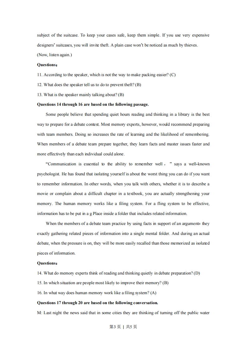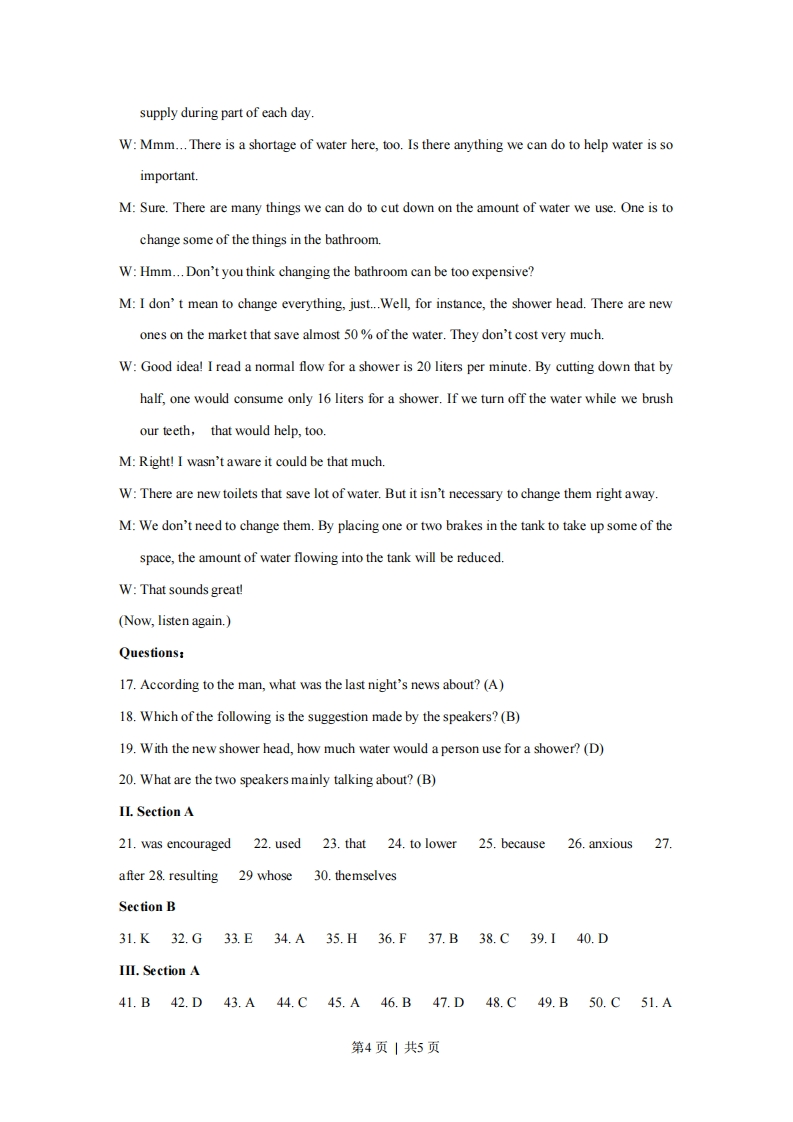 2017年普通高等学校招生全国统一考试上海英语试卷听力文字及参考答案I.Listening ComprehensionSection ADirections:In Section A,you will hear ten short conversations between two speakers.At the endof each conversation,a question will be asked about what was said.The conversations and thequestions will be spoken only once.After you hear a conversation and the question about it,readthe four possible answers on your paper,and decide which one is the best answer to the questionyou have heard.1.M:Programming is too tough for me to learn.I'll quit.W:Keep trying.You can make it!Q:What does the woman mean?(D)2.M:Just look at today's paper nothing but accidents or gossip.W:Right.Nothing is worth reading.Q:What is the speaker's attitude towards today's paper?(C)3.W:Jane,have you turned off your mobile phone?The musical is about to start.M:Okay,I can't wait to see Lucas Wong.My favorite actor.Q:Where does this conversation most probably take place?(B)4.M:Before feeding the dog,I'm going to clear up its house.W:It's about time.Look at the mess!It smells terrible.Q:What is the man most probably going to do first?(B)5.W:Shall we buy some magazines on home decoration before furnishing our new house?M:We could,but considering the information,don't you think they are overpriced?Q:What does the man think of such magazines?(A)6.M:Ms.Fang,for tomorrow's test can we use calculator?W:No.You should leam basic calculation skills.Q:Which test is the man most probably going to take?(A)7.W:Why didn't you go to the concert?It was marvelous.第1页|共5页M:I was tired out.I just came back from Chengdu by train that morning.Q:Why was the man absent from the concert?(C)8.W:Robbie,I can't carry those books to the classroom.Would you please help me?M:Sorry,Mary.I have an appointment with Professor Hanks now.Why not use bicycle.Q:What does Robbie imply?(A)9.M:Some doctors love to lecture people about their life styles.W:Well,I don't think they can make a difference.Q:What does the woman mean?(D)10.W:Alex,do you like team sports football basketball?M:Sure.But I am a spectator rather than a player.Q:What can we leam about the man?(A)Section BDirections:In Section B,you will hear two short passages and one longer conversation.Aftereach passage or conversation,you will be asked several questions.The passages and theconversation will be read twice,but the questions will be spoken only once.When you hear aquestion,read the four possible answers on your paper and decide which one would be the bestanswer to the question you have heard.Questions 11 through 13 are based on the following passage.That longer way to trip is about to begin.You've been working hard getting everythingorganized.I'm here to give you the tips you need to make that packing task easier.The golden ruleis The lighter,the better.Most shampoo manufacturers seem to make a special point ofpackaging their products in containers which are either large or heavy.One way to decrease the weight in your bag is to buy some small bottles and pour into themjust enough shampo