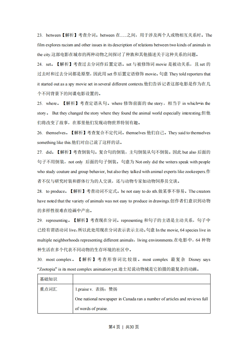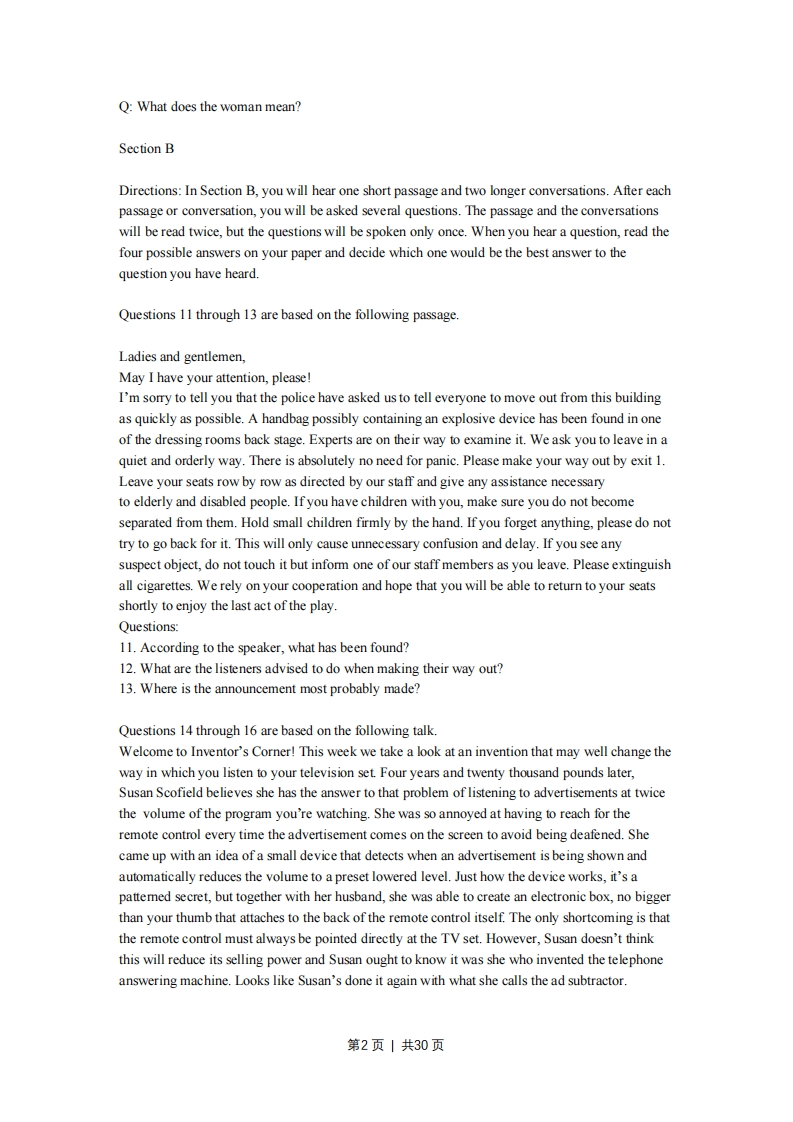 2017年1月全国普通高等学校招生统一考试上海英语试卷答案解析2017年上海一月高考英语听力文字稿I.Listening ComprehensionSection ADirections:In Section A,you will hear ten short conversations between two speakers.At the endof each conversation,a question will be asked about what was said.The conversations and thequestions will be spoken only once.After you hear a conversation and the question about it,readthe four possible answers on your paper,and decide which one is the best answer to the questionyou have heard.1.M:What would you like,Linda,I think I'll have pie and ice-cream.W:The chocolate cake looks wonderful.But I'll have cheesecake for a change.Q:what would the woman most probably to have?2.M:Does the sign say the museum is open everyday from ten till eight?W:Sorry,I haven't got my glasses.Q:What does the woman mean?3.M:You know what,Betty?I've decided to give up smoking.W:Once again?Q:How does the woman feel about the man's decision?4.M:Don't you ever go home?Every time I see you,you are here in the library browsing throughyour books.W:What do you mean?I thought this was home.Q:What can we leam about the woman?5.W:Are you skiing this afternoon?M:I doubt it.The weather forecast is pretty bad.Q:What does the man mean?6.W:The fridge is empty.What happened to all that food we bought?M:My little brother has a big appetite.He really cleaned this out.Q:What does the man mean?7.M:I am taking my nephew to a concert for his birthday tonight.W:In this T-shirt?You'd better change.Q:What does the woman suggest the man do?8.W:Martin,my car is there at the repair shop.Could you give me a ride to school?M:Well,I would.But I am supposed to be at the clinic in 5 minutes.Q:What is the man most probably going to do?9.M:Psychologists study thousands of pictures by kids and match them up.W:I am sorry.But I don't quite follow you.Q:What does the woman mean?10.M:I really enjoy that quiz show last night.Did you see it?W:Oh yes,but I wish I could've stayed away long enough to see the whole thing.第1页|共30页Q:What does the woman mean?Section BDirections:In Section B,you will hear one short passage and two longer conversations.After eachpassage or conversation,you will be asked several questions.The passage and the conversationswill be read twice,but the questions will be spoken only once.When you hear a question,read thefour possible answers on your paper and decide which one would be the best answer to thequestion you have heard.Questions 11 through 13 are based on the following passage.Ladies and gentlemen,May I have your attention,please!I'm sorry to tell you that the police have asked us to tell everyone to move out from this buildingas quickly as possible.A handbag possibly containing an explosive device has been found in oneof the dressing rooms back stage.Experts are on their way to examine it.We ask you to leave in aquiet and orderly way.There is absolutely no need for panic.Please make your way out by exit 1.Leave your seats row by row as directed by our staff and give any assistance necessaryto elderly a