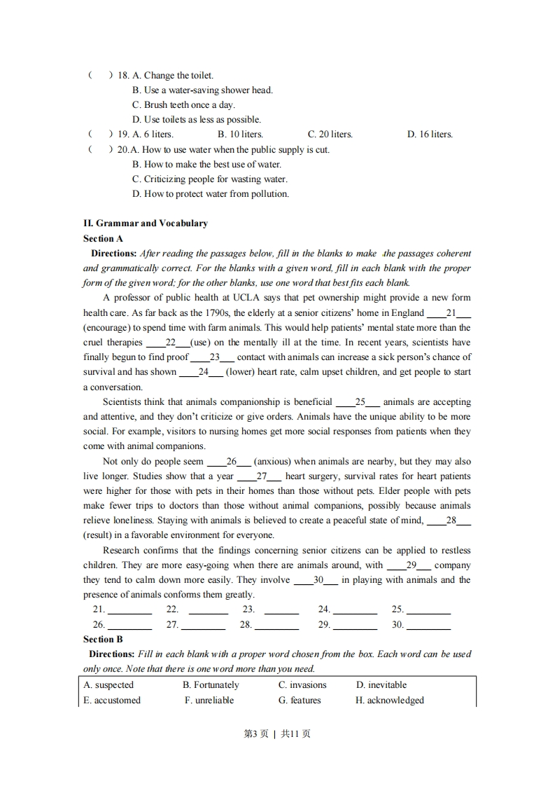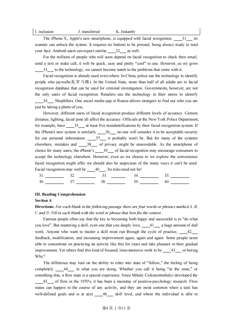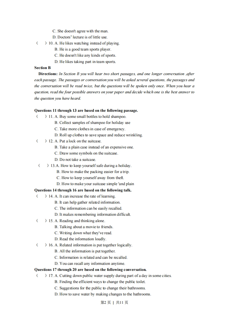 绝密★启用前2017年普通高等学校招生全国统一考试(上海卷)英语试卷(满分140分,考试时间120分钟)考生注意:答题前,务必在答题纸上填写准考证号和姓名,并将核对后的条形码贴在指定位置上,在答题纸反而清楚地填写姓名。I.Listening ComprehensionSectionADirections:In Section A,you will hear ten short conversations between two speakers.At theend of each conversation,a question will be asked about what was said.The conversations andthe questions will be spoken only once.Afer you hear a conversation and the question about it.read the four possible answers on your paper,and decide which one is the best answer to thequestion you have heard.()1.A.The man should stop the program.B.The program is too difficult to learn.C.She can help the man learn the program.D.The man should keep learning the program.()2.A.They like reading today's paper.B.They are interested in today's paper.C.They found nothing interesting in today's paper.D.They have no idea what the paper is about.()3.A.In a library.B.In a concert.C.In a park.D.In an exhibition.()4.A.Feed the dog.B.Clean the dog's house.C.Give the dog a bath.D.Find something to eat.()5.A.Expensive.B.Cheap.C.Unsuitable.D.Unnecessary.()6.A.Maths test.B.English test.C.Biology test.D.History test()7.A.Because he was in Chengdu.B.Because the concert was held in Chengdu.C.Because he was too tired to attend the concert.D.Because the concert was not good enough.()8.A.He couldn't help Mary.B.He could lend Mary his bicycle.C.Mary could ask someone else for help.D.Professor Hanks would help Mary.()9.A.Doctors should not lecture people about life styles.B.Doctors'own life styles are different from others.第1页|共11页C.She doesn't agree with the man.D.Doctors'lecture is of little use.()10.A.He likes watching instead of playing.B.He is a good team sports player.C.He doesn't like any kinds of sports.D.He likes taking part in team sports.Section BDirections:In Section B you will hear two short passages,and one longer conversation ,aftereach passage.The passages or conversation you will be asked several questions,the passages andthe conversation will be read twice,but the questions will be spoken only once.When you hear aquestion,read the four possible answers on your paper and decide which one is the best answer tothe question you have heard.Questions 11 through 13 are based on the following passage.()11.A.Buy some small bottles to hold shampoo.B.Collect samples of shampoo for holiday useC.Take more clothes in case of emergency.D.Roll up clothes to save space and reduce wrinkling.()12.A.Put a lock on the suitcase.B.Take a plain case instead of an expensive one.C.Draw some symbols on the suitcase.D.Do not take a suitcase.(13.A.How to keep yourself safe during a holiday.B.How to make the packing easier for a trip.C.How to keep yourself away from theft.D.How to make your suitcase simple 'and plainQuestions 14 through 16 are based on the following talk.()14.A.It can increase the rate of learning.B.It can help gather related information.C.The information can be easily recalled.D.It makes remembering information difficult.()15.A.Reading and thinking a