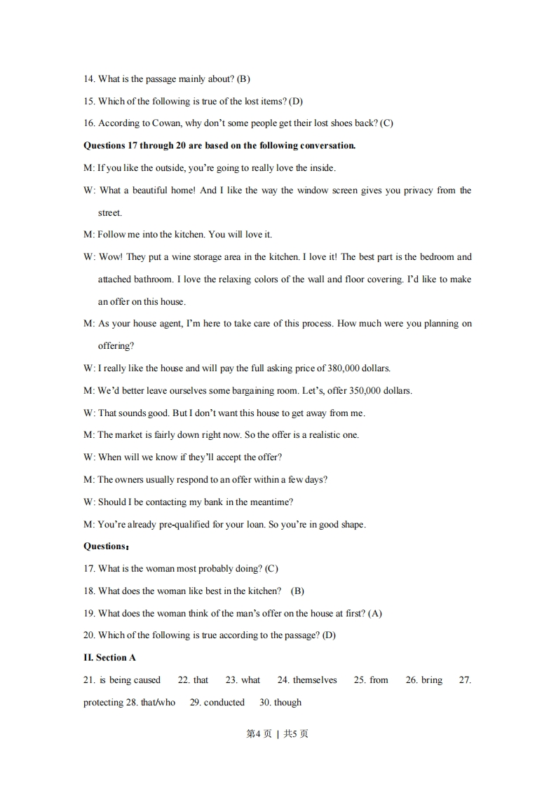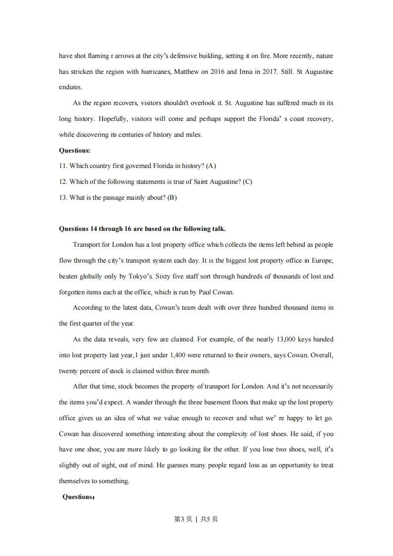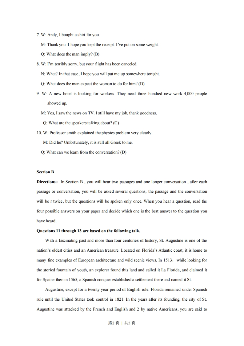 2018年普通高等学校招生全国统一考试上海英语试卷听力文字及参考答案I.Listening ComprehensionSection ADirections:In Section A,you will hear ten short conversations between two speakers.At the endof each conversation a question will be asked about what was said.The conversations and thequestions will be spoken only once.After you hear a conversation and the question about it,readthe four possible answers on your paper,and decide which one is the best answer to the questionyou have heard.1.M:Good moming.Can I help you?W:Yes,this dress is too long.Would you please shorten it for me?Q:Where does the conversation most probably take place?(C)2.W:Jack,you look tired.M:Yes,I got piles of work to do.But it gives me a great sense of achievement.Q:What can we leam about the man?(A)3.W:John,what's up?Why are you standing on the desk?M:The lights suddenly went off.The bulb must have burnt out.Q:What is the man most probably doing?(D)4.W:I will take this room,how much is the rent?M:Well,two hundred pounds each month.You need to pay three months rent in advance,plusa deposit of 100 pounds.Q:According to the man,how much should the woman pay in total?(D)5.W:I'll take an interview for a part time librarian tomorrow.M:Don't worry.Others stand no chance,if you take the interview.Q:How does the man feel about the woman's chance of getting the job?(B)6.M:I couldn't sleep at all last night.The bed is not comfortable.W:Don't blame the,bed.You should stop drinking wine.Q:What does the woman imply?(A)第1页|共5页7.W:Andy,I bought a shirt for you.M:Thank you.I hope you kept the receipt.I've put on some weight.Q:What does the man imply?(B)8.W:I'm terribly sorry,but your flight has been canceled.N:What?In that case,I hope you will put me up somewhere tonight.Q:What does the man expect the woman to do for him?(D)9.W:A new hotel is looking for workers.They need three hundred new work 4,000 peopleshowed up.M:Yes,I saw the news on TV.I still have my job,thank goodness.Q:What are the speakers talking about?(C)10.W:Professor smith explained the physics problem very clearly.M:Did he?Unfortunately,it is still all Greek to me.Q:What can we leam from the conversation?(D)Section BDirections:In Section B,you will hear two passages and one longer conversation,after eachpassage or conversation,you will be asked several questions,the passage and the conversationwill be r twice,but the questions will be spoken only once.When you hear a question,read thefour possible answers on your paper and decide which one is the best answer to the question youhave heardQuestions 11 through 13 are based on the following talk.With a fascinating past and more than four centuries of history,St.Augustine is one of thenation's oldest cities and an American treasure.Located on Florida's Atlantic coast,it is home tomany fine examples of European architecture and wild scenic views.In 1513,while looking forthe storied fountain of youth,an explorer found this land and called it La Florida,and claimed itfor Spain then in 1565,a Spanish conquer establish