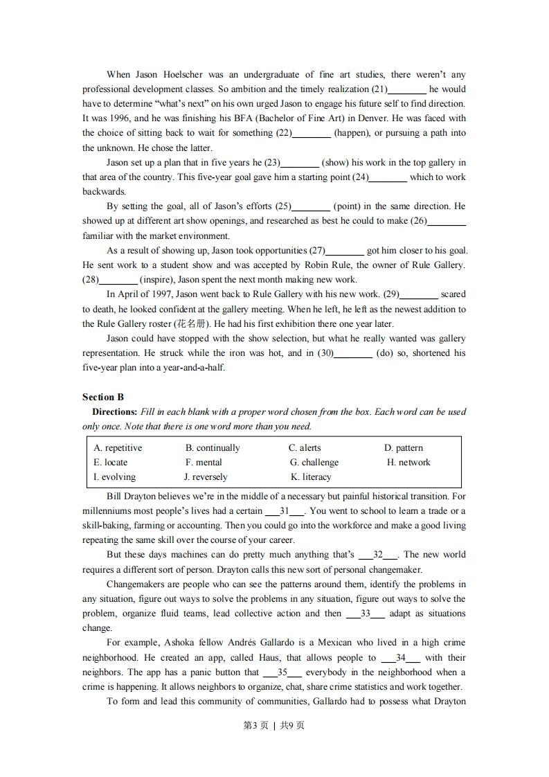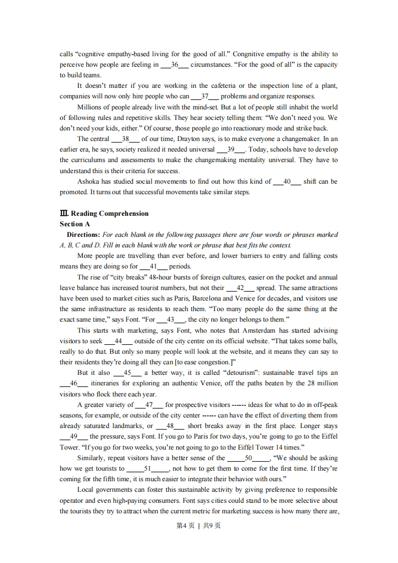 绝密★启用前2019年1月上海普通高等招生统一考试英语试卷(满分150分,考试时间120分钟)考生注意:答题前,务必在答题纸上填写准考证号和姓名,并将核对后的条形码贴在指定位置上,在答题纸反而清楚地填写姓名。I.Listening ComprehensionSection ADirections:In Section A,you will hear ten short conversations between two speakers.At theend of each conversation,a question will be asked about what was said.The conversations andthe questions will be spoken only once.Afer you hear a conversation and the question about it,read the four possible answers on your paper,and decide which one is the best answer to thequestion you have heard.1.A.In a church.B.In the man's home.C.In a restaurant.D.In a furniture store2.A.She was excited.B.She was very nervous.C.She was very confident.D.There was something wrong with her heart3.A.She is full.B.She doesn't like that snack barC.She is ill.D.She is going to see the doctor.4.A.150 pounds.B.110 pounds.C.50 pounds.D.100 pound.5.A.He couldn't spell the wordsB.He did well in spelling.C.He reckoned that it was hard to sayD.He didn't do well in contest.6.A.Concerned.B.Satisfied.C.Relaxed.D.Depressed7.A.They are talking about a fitness coach.B.They are discussing about the former firm.C.They are talking about their former colleague.D.They are talking about their friends'school.8.A.Young people weren't satisfied with the lecture.B.The lecture was very successful.C.Drinking water was banned in the lecture.D.The lecture made people feel thirsty9.A.The boss.B.TomC.The woman.D.The man.10.A.He already has one calculator.B.He doesn't like the solar-powered calculator.C.He is good at calculatingD.He would like to have a different present.Section BDirections:In Section B,you will hear to passages and one longer conversation.After eachpassage or conversation,you will be asked several questions.The passages and the conversationwill be read twice,but the questions will be spoken only once.When you hear a question,read thefour possible answers on your paper and decide which one is the best answer to the question youhave heard.第1页|共9页Question 11 through 13 are based on the following passage.11.A.1938.B.1939.C.1942.D.1948.12.A.Because most Australians couldn't afford it.B.Because the war broke out.C.Because the flying boats were out of dated.D.Because land-based aircraft had developed rapidly.13.A.The price of flying boats.B.The development of Rose Bay.C.The surprising history offlying boatsD.The advancement of flying boats.Question 14 through 16 are based on the following passage.14.A.They have various skills.B.They are well organized.C.They can solve difficult problems.D.They have creative ideas15.A.Disorderliness might result in creativity.B.Creativity might lead to messiness.C.Smarter people believe that cleanliness is not important.D.Messiness helps cultivate creativity16.A.The qualities of intelligent people.B.The misunderstanding ofcreativity.C.The relationship between creativity and messiness.D.The components of creativity.Question 17 through 20 are based on the following conversation.17.A.A new research into the human brain.B.The advan