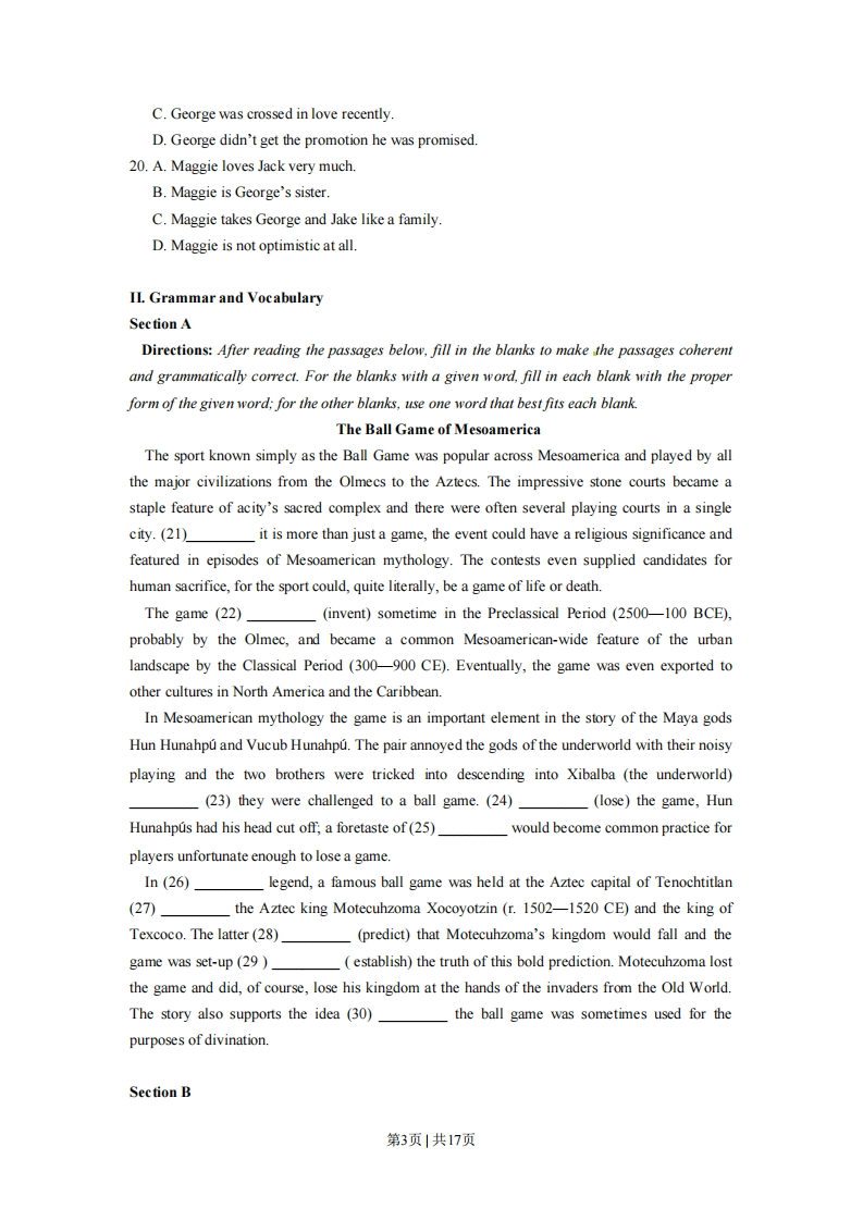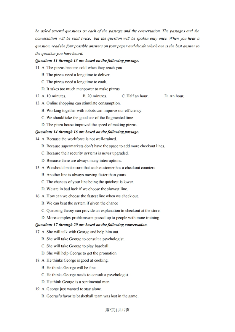 绝密女层用前2020年1月普通高等学校招生全国统一考试(上海卷)英语试卷(满分140分,考试时间120分钟)考生注意:答题前,务必在答题纸上填写准考证号和姓名,并将核对后的条形码贴在指定位置上,在答题纸反而清楚地填写姓名。I.Listening ComprehensionSection ADirections:In Section A,you will hear ten short conversations between two speakers.At theend of each conversation,a question will be asked about what was said.The conversations andthe questions will be spoken only once.Afer you hear a conversation and the question about it,read the four possible answers on your paper,and decide which one is the best answer to thequestion you have heard.1.A.A teacher.B.A doctor.C.A policeman.D.A boss.2.A.Worried.B.Anxious.C.Atease.D.Excited.3.A.He plays the violin very well.B.He was surprised by the woman's skills.C.He never knew the woman before.D.He will win the competition.4.A.The ticket is still expensiveB.The ticket is very cheap.C.He is jealous of the girl.D.He doesn't want to buy the ticket.5.A.They are talking about a song.B.They are talking about an opera.C.They are talking about a film.D.They are talking about a novel.6.A.She doesn't like basketball.B.She thinks there is no valuable player.C.She doesn't want to talk with the man.D.She is disappointed with their basketball team.7.A.She thinks the man disturbs her.B.The man is out of luck.C.The only position was occupied yesterday.D.She wants the man called her yesterday.8.A.They will have a date.B.They will go shopping together.C.They will attend class in the school.D.They will play badminton together.9.A.They have enough time to finish this work.B.They are unlucky to do this big assignment.C.He doesn't think it's a big assignment.D.He will not start working on this task until next month.10.A.On Monday.B.On Saturday.C.On Thursday.D.On Sunday.Section BDirections:In Section B,you will hear two passages and one longer conversation,and you will第1页1共17页be asked several questions on each of the passage and the conversation.The passages and theconversation will be read twice,but the question will be spoken only once.When you hear aquestion,read the four possible answers on your paper and decide which one is the best answer tothe question you have heard.Questions 11 through 13 are based on the following passage.11.A.The pizzas become cold when they reach you.B.The pizzas need a long time to deliver.C.The pizzas need a long time to cook.D.It takes too much manpower to make pizzas.12.A.10 minutes.B.20 minutes.C.Half an hour.D.An hour.13.A.Online shopping can stimulate consumption.B.Working together with robots can improve our efficiency.C.We should take the good use of the fragmented time.D.The pizza house improved the speed of making pizzas.Questions 14 through 16 are based on the following passage.14.A.Because the workforce is not well-trained.B.Because supermarkets don't have the space to add more checkout lines.C.Because their security systems is never upgraded.D.Because there are always many interruptions.15.A.We should make sure that each customer has a checkout counters.B.Another line is always moving faster than yo