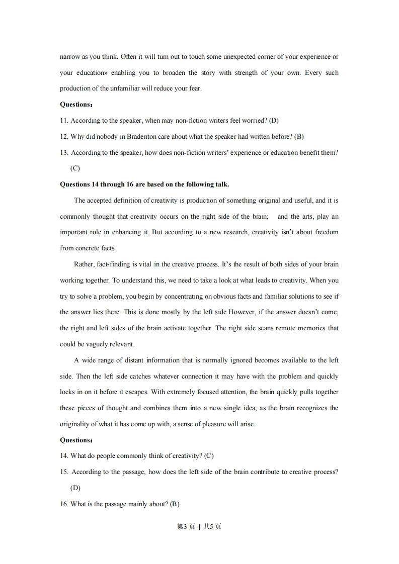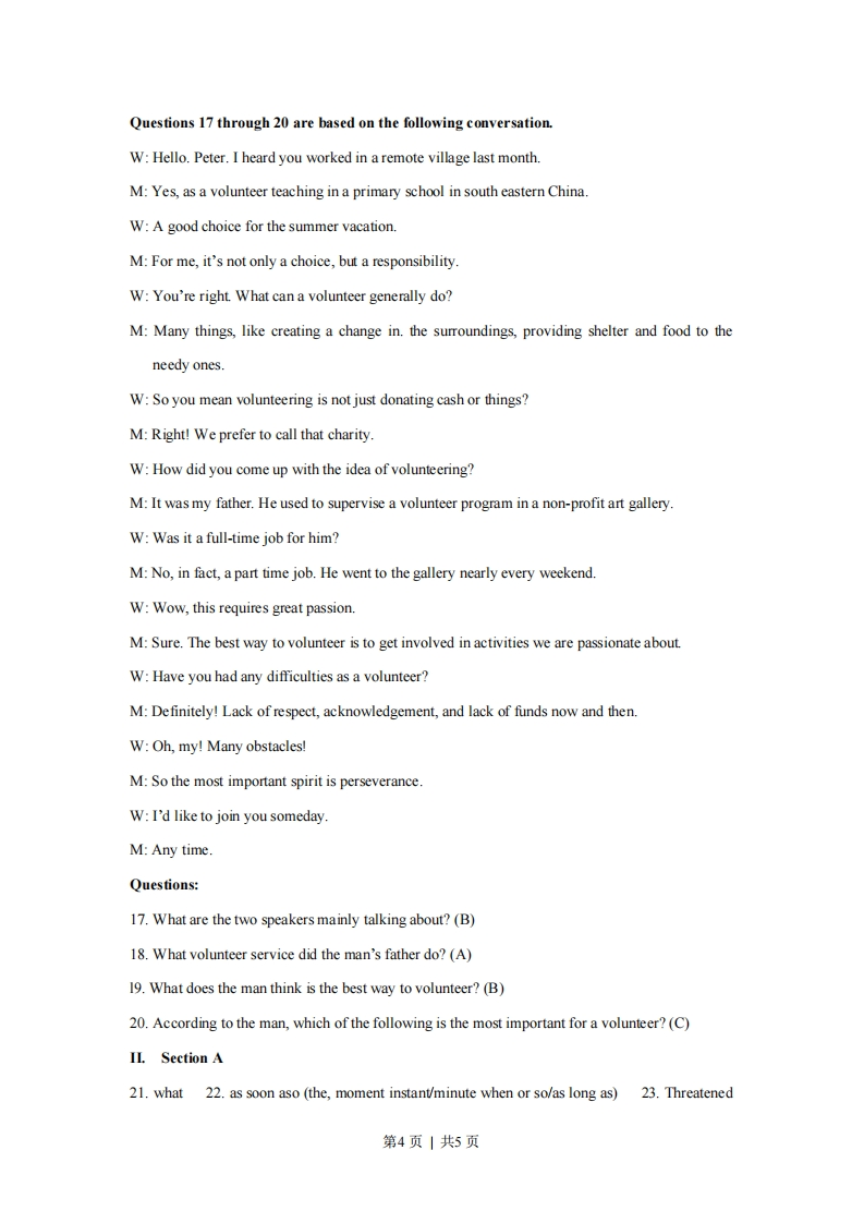 2019年普通高等学校招生全国统一考试上海英语试卷听力文字及参考答案I.Listening ComprehensionSection ADirections:In Section A,you will hear ten short conversations between two speakers.At the endof each conversation,a question will be asked about what was said.The conversations and thequestions will be spoken only once.After you hear a conversation and the question about it,readthe four possible answers on your paper,and decide which one is the best answer to the questionyou have heard.1.M:Is there a new bookstore on Fuzhou Road?W:Yes,it's got very good novels of the 20th century.Q:What are the speakers mainly talking about?(C)2.W:Mike,are you OK?M:I injured my back yesterday just by sneezing.My doctor said I need surgery.Q:What can be leamed about the man?(B)3.M:Which team are you going to support?W:You're not going to talk about football again,are you?That's it.Q:How does the woman feel about discussing football?(D)4.M:Mary is not in the company.Has she retumed from Xi'an yet?W:Yes,but before she went to Chengdu yesterday,she had been home for only one dayQ:Where is Mary Now?(B)5.M:What?Steven is drinking orange juice.W:You can't believe it.Now,he's careful about what he eats and takes regular exercise.Q:What does the woman imply about Steven?(D)6.M:I've moved the flower into the garden and watered it every day.How come it is still notdoing well?W:Well,why not add some fertilizer?Maybe that'll help.Q:According to the woman,what may the flower need?(A)7.M:Wow,you won the first prize in the writing contest.You haven't taken any courses on第1页|共5页reading and writing.W:But I've been keeping a diary since childhood.Q:According to the woman,what helped her win the contest?(C)8.M:You like tennis so much.Why not take some lessons?They start next week.W:How am I going to fit that into my crowded schedule?Q:What does the woman mean?(D)9.W:Walk to the park?You must be kidding!It takes only five minutes to drive there.M:If I had remembered to charge my car.Q:What can be leamed about the man?(B)10.W:You've been dealing with that budget report for nearly an hour.Anything wrong?M:I keep adding and reading the numbers but they just don't balance.Q:What is the man doing?(B)Section BDirections:In Section B,you will hear two passages and one longer conversation,after eachpassage or conversation you will be asked several questions,the passages and the conversationwill be read twice,but the questions will be spoken only once.When you hear a question,read thefour possible answers on your paper and decide which one is the best answer to the question youhave heard.Questions 11 through 13 are based on the following passage.It's common for you,nonfiction writers,to go forth into an area you know little about.Youmay worry that you are not qualified to bring the story back.I feel that anxiety every time I start anew project.I felt it when I went to Bradenton to write my baseball book "Spring training."Although I've been a baseball fan all my life,I had never done any sports reporting;neverinterviewed a pro