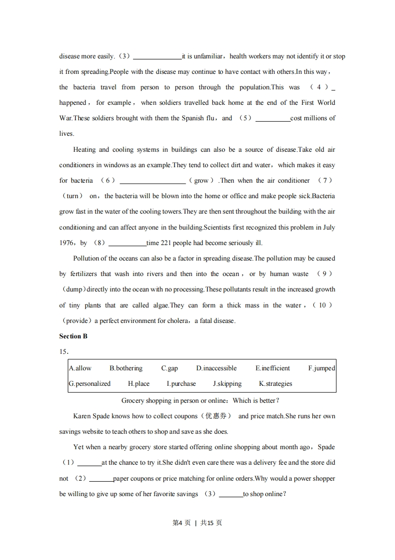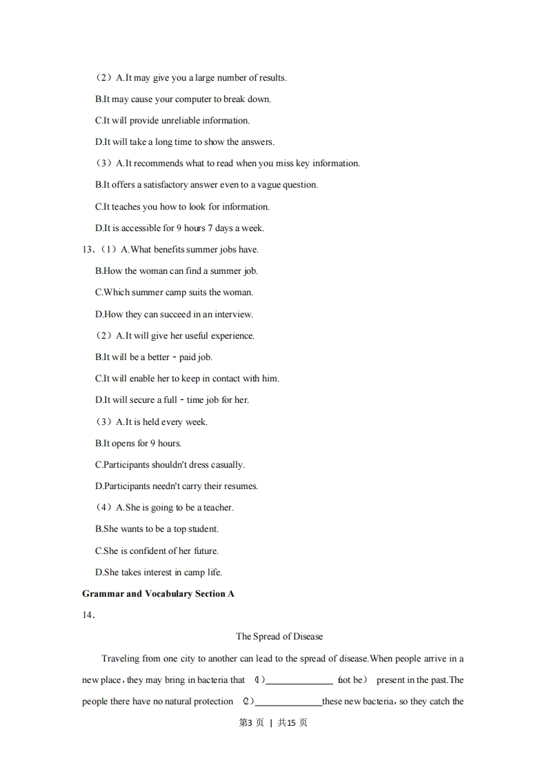 2021年上海市高考英语试卷Listening Comprehension Section A1.A.She is a policewoman.B.She is a shop assistant.C.She is a teacher.D.She is a doctor.2.A.He lives near the East LakeB.He is not interested in that school.C.He has not decided what major to choose.D.He wants to apply to East Lake College3.A.Comfort the man.B.Find the man ajob.C.Keep the man company.D.Evaluate the man's work.4.A.The title of a painter.B.A catalogue.C.The history of the 18th century.D.A work of art.5.A.She will go to work on foot.B.She will get off at her office.C.She will take another means of transport.D.She will wait for the man at the next crossroads.6.A.Prepare for the test on Chapter 9.B.Read aloud Chapter 9.C.Explain the assignment of Chapter 9.D.Talk about Chapter 9.7.A.He will call off the next conference.B.He can't contact the woman by email.C.He will have his computer fixed tomorrow.第1页|共15页D.He can't decide on the date for the conference.8.A.She has put away the boy's shoes.B.She will wash the boy's shoesC.The boy needn't go to school today.D.The boy can't get to school on time.9.A.Pack the free pizzas.B.Prepare lunch by herself.C.Work at Pizza Kitchen.D.Go to a health club to lose weight.10.A.He will get the reservation done.B.No twin room is available in March.C.He will call the woman at a later time.D.The woman should change her schedule.Section B11.(1)A.Workers explore flexible approaches to fighting sleepiness at work.B.Companies need more facilities for their workers'on-site napping.C.Companies encourage their workers to nap on the job.D.Workers demand more care about their sleep quality.(2)A.Go home for a 20-minute nap.B.Take a 10-minute nap at 3 p.m.C.Do sports with personal trainers.D.Sleep in a room with a bed and pillows.(3)A.Taking a nap improves his work efficiency.B.Using a calculator prevents him making mistakes.C.He works longer than any other employee in the firm.D.He works as an account ant in a consulting company.12.(1)A.A search engine developed by a libraryB.An introduction to the Pearl Library.C.A person-to-person information service.D.Changes that search engines bring to us.第2页|共15页(2)A.It may give you a large number of results.B.It may cause your computer to break down.C.It will provide unreliable information.D.It will take a long time to show the answers.(3)A.It recommends what to read when you miss key information.B.It offers a satisfactory answer even to a vague questionC.It teaches you how to look for information.D.It is accessible for 9 hours 7 days a week.13.(1)A.What benefits summer jobs have.B.How the woman can find a summer job.C.Which summer camp suits the woman.D.How they can succeed in an interview.(2)A.It will give her useful experience.B.It will be a better-paid job.C.It will enable her to keep in contact with him.D.It will secure a full time job for her.(3)A.It is held every week.B.It opens for 9 hours.C.Participants shouldn't dress casually.D.Participants needn't carry their resumes.(4)A.She is going to be a teacher.B.She wants to b