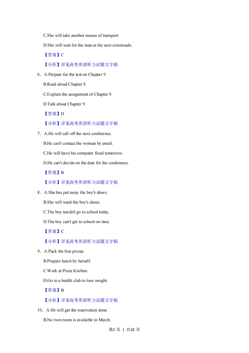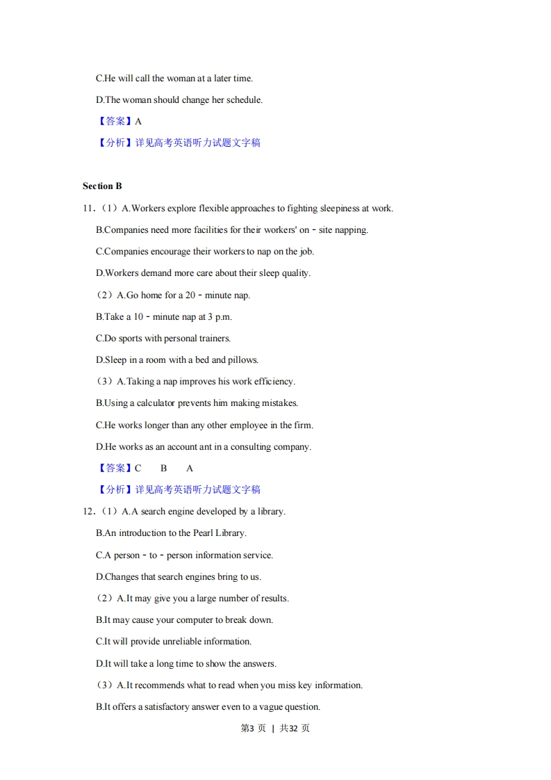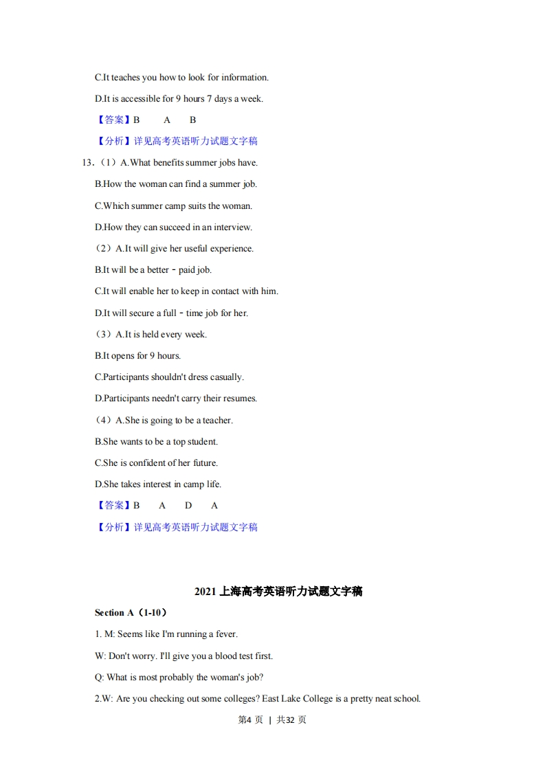 2021年上海市高考英语试卷事考答案与试题佩析Listening Comprehension Section A1.A.She is a policewoman.B.She is a shop assistant.C.She is a teacher.D.She is a doctor【答案】D【分析】详见高考英语听力试题文字稿2.A.He lives near the East Lake.B.He is not interested in that school.C.He has not decided what major to choose.D.He wants to apply to East Lake College.【答案】B【分析】详见高考英语听力试题文字稿3.A.Comfort the man.B.Find the man a job.C.Keep the man company.D.Evaluate the man's work.【答案】A【分析】详见高考英语听力试题文字稿4.A.The title of a painterB.A catalogue.C.The history of the 18th century.D.A work of art.【答案】D【分析】详见高考英语听力试题文字稿5.A.She will go to work on footB.She will get off at her office.第1页|共32页C.She will take another means of transport.D.She will wait for the man at the next crossroads.【答案】C【分析】详见高考英语听力试题文字稿6.A.Prepare for the test on Chapter 9.B.Read aloud Chapter 9.C.Explain the assignment of Chapter 9.D.Talk about Chapter 9.【答案】D【分析】详见高考英语听力试题文字稿7.A.He will call off the next conference.B.He can't contact the woman by email.C.He will have his computer fixed tomorrow.D.He can't decide on the date for the conference.【答案】B【分析】详见高考英语听力试题文字稿8.A.She has put away the boy's shoes.B.She will wash the boy's shoesC.The boy needn't go to school today.D.The boy can't get to school on time.【答案】C【分析】详见高考英语听力试题文字稿9.A.Pack the free pizzas.B.Prepare lunch by herself.C.Work at Pizza Kitchen.D.Go to a health club to lose weight【答案】B【分析】详见高考英语听力试题文字稿10.A.He will get the reservation done.B.No twin room is available in March.第2页|共32页C.He will call the woman at a later time.D.The woman should change her schedule.【答案】A【分析】详见高考英语听力试题文字稿Section B11.(1)A.Workers explore flexible approaches to fighting sleepiness at work.B.Companies need more facilities for their workers'on-site napping.C.Companies encourage their workers to nap on the job.D.Workers demand more care about their sleep quality.(2)A.Go home for a 20-minute nap.B.Take a 10-minute nap at 3 p.m.C.Do sports with personal trainers.D.Sleep in a room with a bed and pillows.(3)A.Taking a nap improves his work efficiency.B.Using a calculator prevents him making mistakes.C.He works longer than any other employee in the firm.D.He works as an account ant in a consulting company.【答案】CBA【分析】详见高考英语听力试题文字稿12.(1)A.A search engine developed by a library.B.An introduction to the Pearl Library.C.A person-to-person information service.D.Changes that search engines bring to us.(2)A.It may give you a large number of results.B.It may cause your computer to break down.C.It will provide unreliable information.D.It will take a long time to show the answers.(3)A.It recommends what to read when you miss key information.B.It offers a satisfactory answer even to a vague question.第3页|共32页