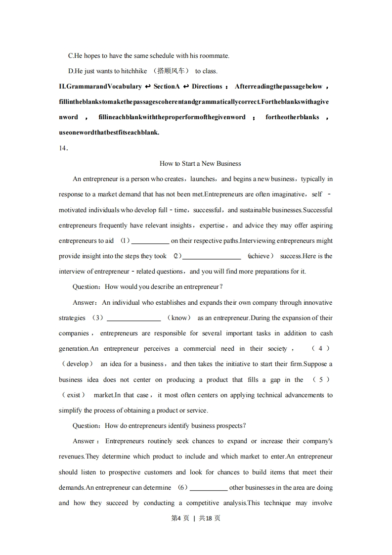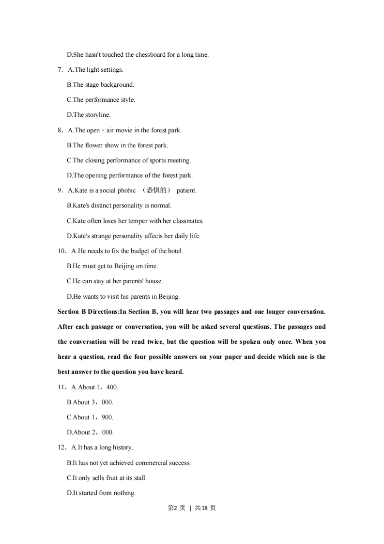 2022年上海市高考英语试卷I.Listening Comprehension Section A Directions:In Section A,you will hear ten shortconversations between two speakers.At the end of each conversation,a question will beasked about what was said.The conversations and the questions will be spoken only once.After you hear a conversation and the question about it,read the four possible answers onyour paper,and decide which one is the best answer to the question you have heard.1.A.A box of cupcakes.B.A soup spoon.C.A packet of sugar.D.A cup of coffee.2.A.Worried.B.Excited.C.Interested.D.Crazy.3.A.Giving awards to students.B.Buying a gift for his son.C.Selling new toys to customers.D.Interviewing to become a train driver.4.A.She shouldn't go out with a notebook.B.She should have been more careful and she can only blame herself.C.She should pay attention to the notebook on the bench.D.She shouldn't take the loss of her notebook to heart5.A.Their travel plan in the city.B.Their exhibition in the gallery.C.Their experience in the memorial hall.D.Their joumey in the city map.6.A.She is a chess teacher.B.She is indifferent to her chess progress.C.She signed up for the chess game.第1页|共18页D.She hasn't touched the chessboard for a long time.7.A.The light settings.B.The stage background.C.The performance style.D.The storyline.8.A.The open-air movie in the forest park.B.The flower show in the forest park.C.The closing performance of sports meeting.D.The opening performance of the forest park.9.A.Kate is a social phobic(恐惧的)patient..B.Kate's distinct personality is normal.C.Kate often loses her temper with her classmates.D.Kate's strange personality affects her daily life.10.A.He needs to fix the budget of the hotel.B.He must get to Beijing on time.C.He can stay at her parents'house.D.He wants to visit his parents in Beijing.Section B Directions:In Section B,you will hear two passages and one longer conversation.After each passage or conversation,you will be asked several questions.The passages andthe conversation will be read twice,but the question will be spoken only once.When youhear a question,read the four possible answers on your paper and decide which one is thebest answer to the question you have heard.11.A.About1,400B.About 3,000.C.About 1,900.D.About 2,00012.A.It has a long history.B.It has not yet achieved commercial success.C.It only sells fruit at its stall.D.It started from nothing.第2页|共18页13.A.The success story of Kitten Coffee.B.The history of Everbrown.C.The secret of business successD.The advantages of diversified products.14.A.It needs scissors to be opened for use.B.It has launched more than 30 products.C.It is material-efficient and environmentally friendly.D.Its reputation among sellers is very poor.15.A.It has put forward effective initiatives.B.It has reached the peak of product upgrading.C.It has offered a wide range of products.D.It only introduces the product through video clips.16.A.Diversified design of packaging materials.B.Working hard to promote product development.C.