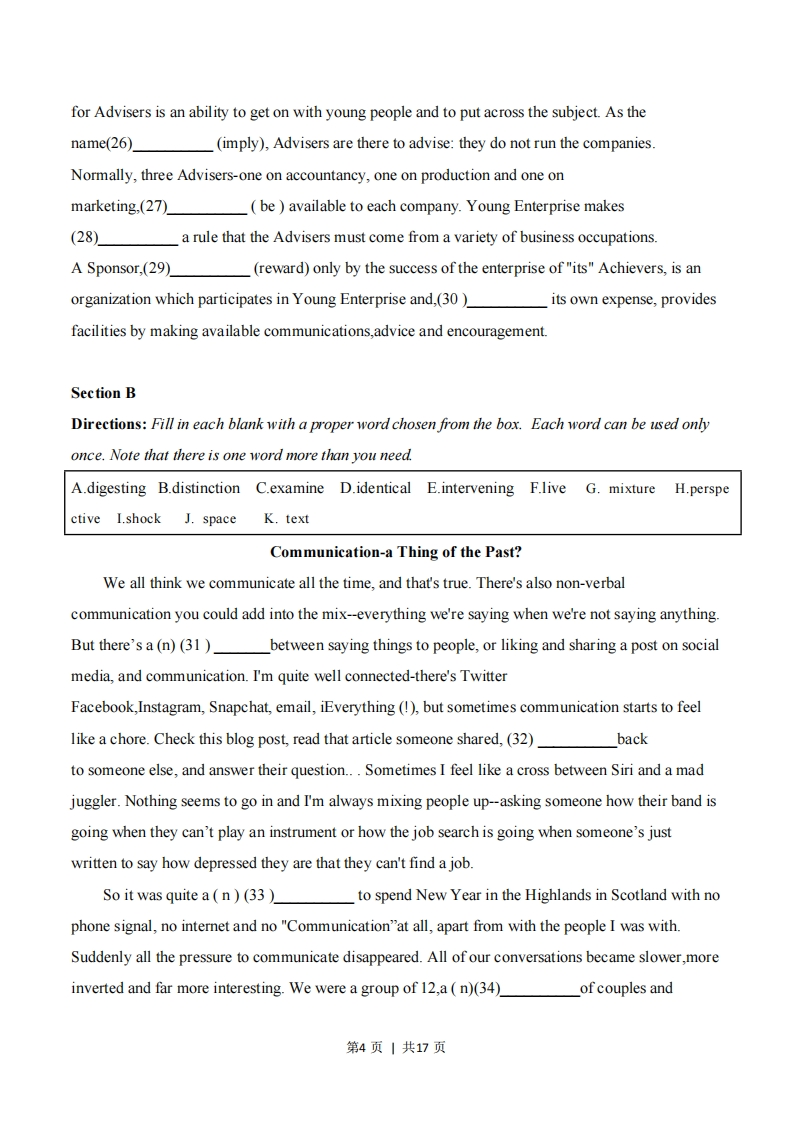 2023年1月全国普通高等学校招生统一考试上海英语试卷L.Listening Comprehension(第1-10题,每题1分;第11-20题,每题1.5分;共25分)Section ADirections:In Section A,you will hear ten short conversations between two speakers.At the end ofeach conversation,a question will be asked about what was said.The conversations and thequestions will be spoken only once.After you hear a conversation and the question about it,read thefour possible answers on your paper,and decide which one is the best answer to the question youhave heard.1.A.Disappointed.B.DepressedC.GladD.Unhappy2.A.He was praised.B.He was blamed C.He was threatened D.He was commended3.A.Difficult but interestingB.Complex and boring.C.Profound and boring.D.Complex and profound4.A.He mistook the time of the lecture.B.He enjoyed the lecture.C.He was late for the lecture.D.He didn't like the paper-cutting exhibition.5.A.Annoyed.B.Relieved.C.Indifferent.D.Confused6.A.He won't sponsor his daughter's marathon.B.He doesn't want to sponsor his daughter's marathon.C.He is willing to sponsor his daughter's marathon.D.He can't sponsor his daughter's marathon.7.A.He is very free.B.He has a lot of time.C.He is not busy at allD.He is so busy.8.A.The function of the suitcase.B.The way to pack efficientlyC.The types of shoes.D.The way to store clothes.9.A.The friendship between them.B.The peace between them.C.The conflict between them.D.The harmony between them10.A.The woman met her grandchildren several years ago.B.The woman hasn't seen her grandchildren for a long time.第1页|共17页C.The man has met her grandchildren for a long time.D.The man doesn't want her to see her grandchildren.Section BDirections:In Section B,you will hear two passages and passage or conversation,you will be askedseveral questions will be read twice,but the question will be spoken only one the four possibleanswers on your paper and decide which o you have heard.Questions 11 through 13 are based on the following talk.11.A.Volunteer motorcyclists helping the community by training blood bikers.B.Blood bikers helping hospitals by donating their blood.C.Blood bikers helping the community by forming the Association of Blood Bikers.D.Volunteer motorcyclists helping hospitals by delivering medical materials.12.A.80B.1.400C.262.D.35.00013.A.She is a passionate volunteer motorcyclist.B.She only delivers blood to the hospital.C.She's a volunteer with no willpower.D.She once delivered blood for her nephew.Questions 14 through 16 are based on the following talk.14.A.It's a wearable device to monitor dogs.B.It's a wearable device to earn pet insurance fee.C.It's an electronic caller to look after pets.D.It's a camera for pet care.15.A.To help you monitor your pets'activity and even emotional state.B.To feedback information on a dog's activity level and food intake.C.To understand factors to affect dogs'health and overweight and so on.D.To provide more perfect facilities for pet care and reduce insurance fee.16.A.An electronic caller that solves the challenges of owning dogs.B.A wearable device to