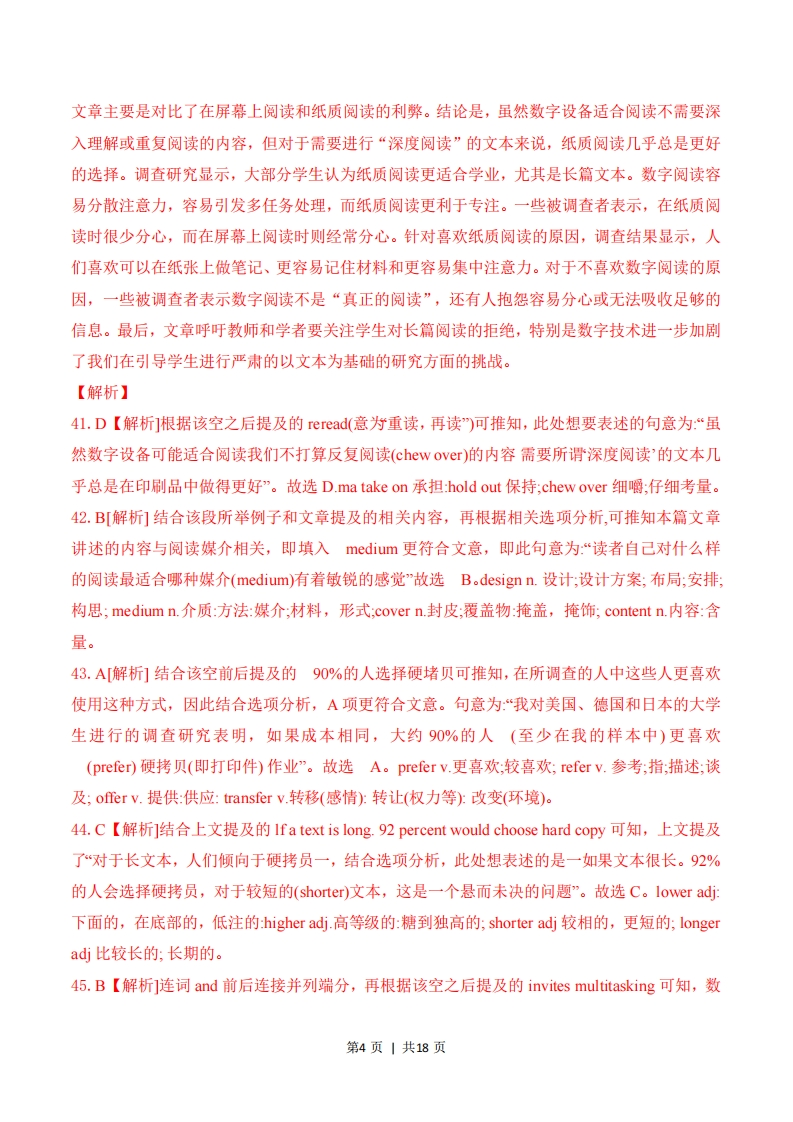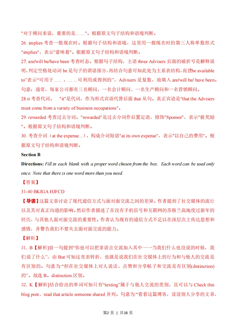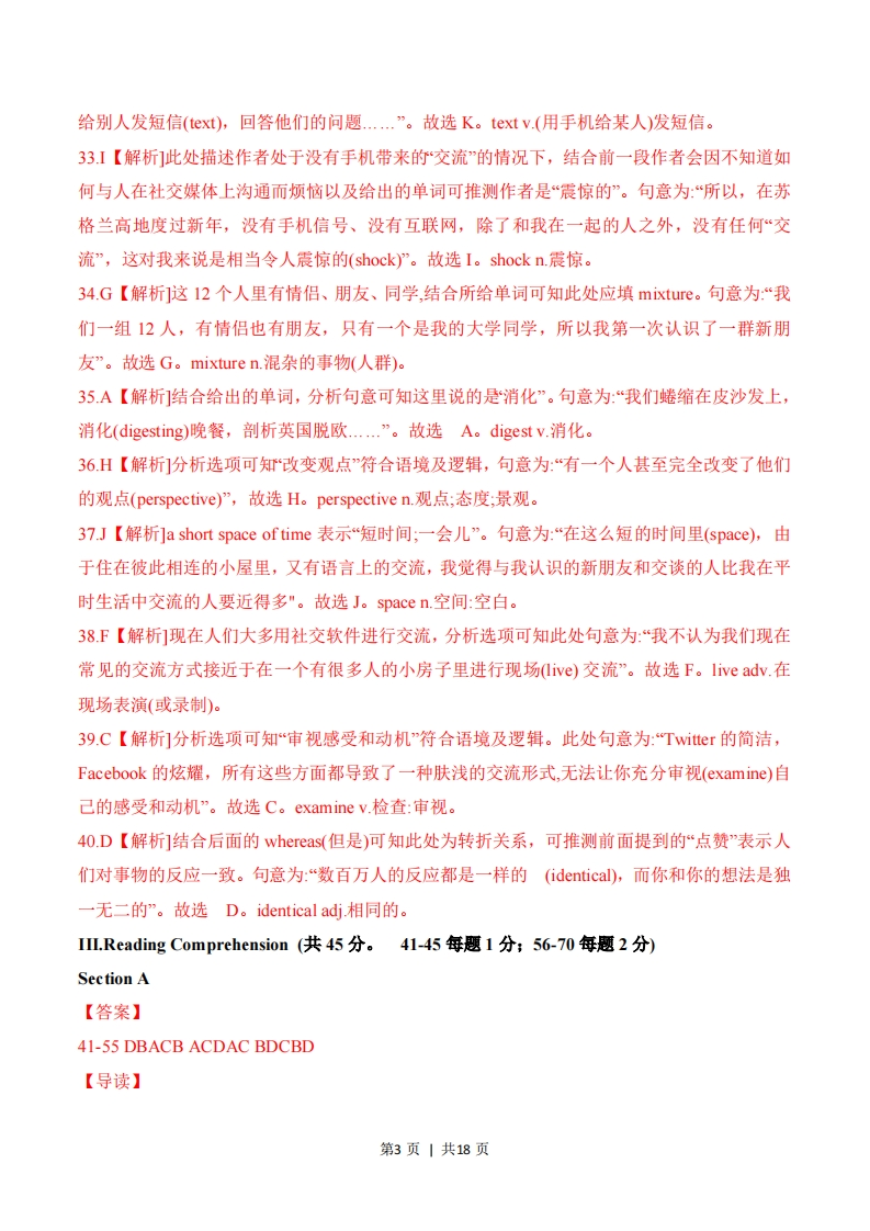 2023年1月上海英语试卷参考答案与试题解析【听力答案】1'5.CBAAB610.CDBCB11~13.DBA1416.ACB17~20.ACAD【备注】听力文字稿附文档末尾IL.Grammar and Vocabulary(每题1分;共20分)Section ADirections:After reading the passage below,fill in the blanks to make the passage coherent andgrammatically correct.For the blanks with a given word,fill in each blank with the proper form ofthe given word;for the other blanks,use one word that best fits each blank.【答案】21.Originating 22.Although/Though/While 23.who/that 24.to include 25.What26.implies 27.are/will be/have been 28.it 29.rewarded 30.at【解析】【导读】文章主要讲述Young Enterprise是一个教育组织,旨在教导年轻人经营企业的基本原则。它起源于美国,在英国得到了广泛支持。参与者被称为"Achievers",他们可以是在校学生或已离校但未开始工作的年轻人。每个Young Enterprise公司都有顾问来指导他们,顾问必须具备相关商业经验。赞助商提供支持并根据企业的成功获得回报。【详解】2l.Originating考查现在分词"originate'"是“起源于..”,非谓语动词的现在分词形式,修饰"the idea of Young Enterprise",表示Young Enterprise的想法起源于美国。22.Although/Though/While考查让步状语从句。"although/though/while"表示让步关系,引导让步状语从句,意为"尽管"。根据原文句子结构和语境判断。23.who/hat考查定语从句。这里使用关系代词作为介绍young people的定语从句,修饰"youngpeople'",指代"young people'",做主语,指人,可以使用"who/that"。24.to include考查动词不定式。"to include"根据句子结构,空格前的谓语动词is。判定此处为非谓语动词,而且结合句子结构Itis加形容词加to do something.故填入动词不定式to include.句意:但通常可以将同一年龄段的年轻人包括在内,他们已经离开学校,但尚未开始工作。25.What考查名词从句。这里使用名词从句"What counts for Advisers"引导一个主语从句,意为第1页|共18页"对于顾问来说,重要的是..."。根据原文句子结构和语境判断。26.implies考查一般现在时。根据句子结构和语境,这里用一般现在时的第三人称单数形式"implies'",表示"意味着"。根据原文句子结构和语境判断。27.are/will be/have been考查时态。根据句子结构,主语hree Advisers后面的破折号是解释说明,判定空格处动词be是句子的谓语部分,再结合句意可知此处为主系表结构,而be availableto”表示“可用于..,,..可利用或得到的”,Advisers是复数,故填入are/will be/have been。句意:通常,每家公司都有三名顾问,一名会计顾问、一名生产顾问和一名营销顾问。28.it考查代词。"it"是代词,作为形式宾语代替后面that从句。真正宾语是"that the Advisersmust come from a variety of business occupations".29.rewarded考查过去分词。"rewarded"是过去分词作后置定语,修饰"Sponsor'",表示"被奖励"。根据原文句子结构和语境判断。30.考查介词(at the expense.),构成介词短语"at its own expense",表示"以自己的费用"。根据原文句子结构和语境判断。Section BDirections:Fill in each blank with a proper word chosen from the box.Each word can be used onlyonce.Note that there is one word more than you need【答案】31-40 BKIGA HJFCD【导读】这篇文章讨论了现代通信方式与面对面交流之间的差异。作者提到了社交媒体的流行以及其对真正沟通的影响。然后作者描述了在没有手机信号和互联网的苏格兰高地度过新年的经历,与其他人面对面交流的重要性。作者认为现有的通信方式不足以在深层次上传达思想和感情,并警告我们不要失去面对面交流的能力。【解析】31.B【解析]前一句提到“你也可以把非语言交流加入其中一一当我们什么也没说的时候,我们说了什么”,由But可知这里表转折,也就是说我们在社交媒体上的行为和与他人的交流是有区别的。句意为:“但在社交媒体上对人说话、点赞和分享帖子和交流是有区别(distinction)的”。故选B。distinction..区别。32.K【解析]结合给出的单词可知只有'texting”属于与他人交流的类别,且可以与Check thisblog post、read that article someone shared并列。句意为:“看看这篇博客,读读别人分享的文章,第2页|共18页给别人发短信(text),回答他们的问题...”。故选K。text v.(用手机给某人)发短信。33.I【解析]此处描述作者处于没有手机带来的交流”的情况下,结合前一段作者会因不知道如何与人在社交媒体上沟通而烦恼以及给出的单词可推测作者是“震惊的”。句意为:“所以,在苏格兰高地度过新年,没有手机信号、没有互联网,除了和我在一起的人之外,没有任何“交流”,这对我来说是相当令人震惊的(shock)”。故选I。shock n.震惊。34.G【解析]这12个人里有情侣、朋友、同学,结合所给单词可知此处应填mixture。句意为:“我们一组12人,有情侣也有朋友,只有一个是我的大学同学,所以我第一次认识了一群新朋友”。故选G。mixture n.混杂的事物(人群)。35.A【解析]结合给出的单词,分析句意可知这里说的是消化”。句意为:“我们蜷缩在皮沙发上,消化(digesting)晚餐,剖析英国脱欧...”。故选A。digest v.消化。36.H【解析]分析选项可知“改变观点”符合语境及逻辑,句意为:“有一个人甚至完全改变了他们的观点(perspective)”,故选H。perspectiven.观点;态度,景观。37.J【解析]a short space of time表示“短时间;一会儿”。句意为:“在这么短的时间里(