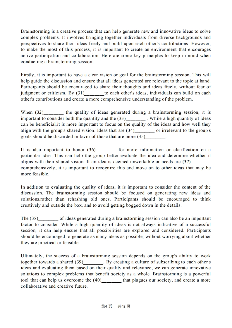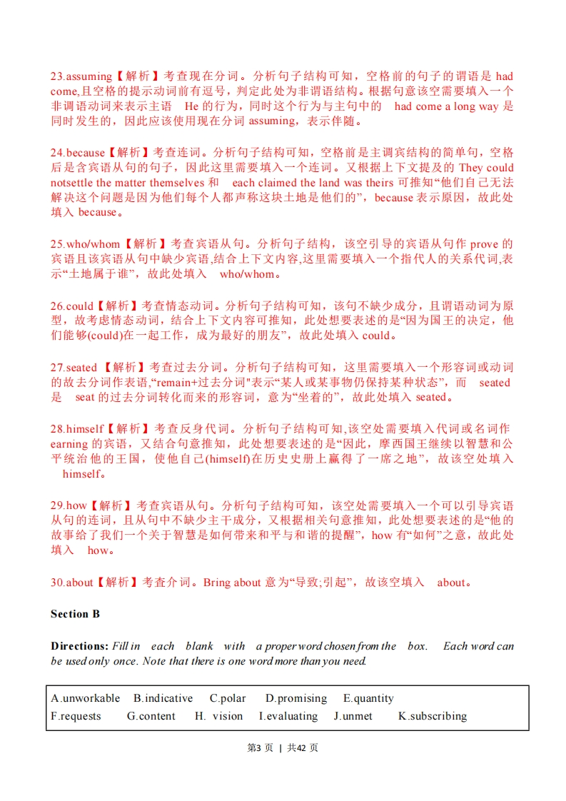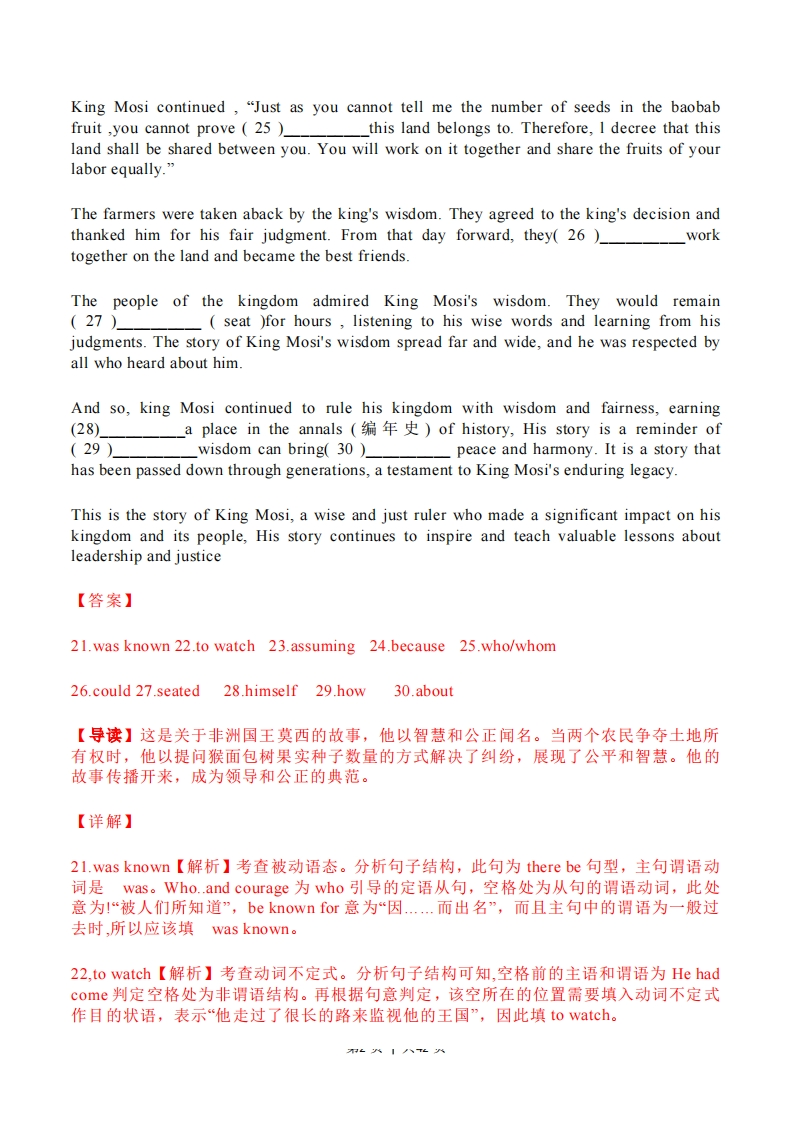 2023年6月上海英语试卷参考答案与试题解析L.Listening Comprehension(第1-10题,每题1分;第11-20题,每题1.5分;共25分)Section ADirections:In Section A,you will hear ten short conversations between two speakers.At theend of each conversation,a question will be asked about what was said.The conversationsand the questions will be spoken only once.After you hear a conversation and the questionabout it,read the four possible answers on your paper,and decide which one is the bestanswer to the question you have heard.【听力答案】1-10.BDCAA CABDA11-13.ADB14-16.BAC17-20.BCDC【备注】听力文字稿附文档末尾Il.Grammar and Vocabulary(每题1分;共20分)Section ADirections:After reading the passage below,fill in the blanks to make the passage coherentand grammatically correct.For the blanks with a given word,fill in each blank with theproper form of the given word;for the other blanks,use one word that best fits each blank.Once upon a time,in the heart of Africa,there was a king who (21)know )forhis wisdom and courage,His name was Mosi,meaning "smoke"in his native tongue.He hadcome a long way (22(watch )over his kingdom,(23(assume )thethrone(王权)at a young age.One day,a dispute arose in the kingdom,Two farmers were arguing about the ownership of apiece of land,They could not settle the matter themselves (24each claimed theland was theirs.The case was brought before King Mosi,who was known for his fairjudgments.The king listened to both sides of the story.He then asked,Who among you can tellme.how many seeds are in the fruit of the baobab tree?"The farmers looked at each other,puzzled.They did not know the answer.King Mosi continued,"Just as you cannot tell me the number of seeds in the baobabfruit you cannot prove 25this land belongs to.Therefore,I decree that thisland shall be shared between you.You will work on it together and share the fruits of yourlabor equally.”The farmers were taken aback by the king's wisdom.They agreed to the king's decision andthanked him for his fair judgment.From that day forward,they(26worktogether on the land and became the best friends.The people of the kingdom admired King Mosi's wisdom.They would remain(27)seat )for hours,listening to his wise words and learning from hisjudgments.The story of King Mosi's wisdom spread far and wide,and he was respected byall who heard about him.And so,king Mosi continued to rule his kingdom with wisdom and fairness,earning(28)a place in the annals(编年史)of history,His story is a reminder of(29)Jwisdom can bring(30peace and harmony.It is a story thathas been passed down through generations,a testament to King Mosi's enduring legacy.This is the story of King Mosi,a wise and just ruler who made a significant impact on hiskingdom and its people,His story continues to inspire and teach valuable lessons aboutleadership and justice【答案】21.was known 22.to watch 23.assuming 24.because 25.who/whom26.could 27.seated28.himself 29.how30.about【导读】这是关于非洲国王莫西的故事,他以智慧和公正闻名。当两个农民争夺土地所有权时,他以提问猴面包树果实种子数量的方式解决了纠纷,展现了公平和智慧。他的故事传播开来,成为领导和公正的典范。【详解】2l.was known【解析】考查被动语态。分析句子结构,此句为there be句